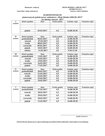 Matuszów Andrzej MOJE BOISKO „ORLIK 2012” JEMIELNO 41A (nazwa i adres obiektu) (nazwisko i imię animatora) HARMONOGRAM planowanych godzin pracy animatora „Moje Boisko ORLIK 2012” na miesiąc marzec 2017 I tydzień II tydzień III tydzień IV tydzień V tydzień Dzień tygodnia Data liczba godzin Godziny zajęć piątek 03.03.2017 4,5 16.00-20.30 Dzień tygodnia Data liczba godzin Godziny zajęć poniedziałek wtorek środa czwartek piątek sobota 06.03.2017 07.03.2017 08.03.2017 09.03.2017 10.03.2017 11.03.2017 4,5 4,5 4,5 4,5 4,5 4,5 16.00-20.30 16.00-20.30 16.00-20.30 16.00-20.30 16.00-20.30 9.30-13.30 Dzień tygodnia Data liczba godzin Godziny zajęć poniedziałek wtorek środa czwartek piątek 13.03.2017 14.03.2017 15.03.2017 16.03.2017 17.03.2017 4,5 4,5 4,5 4,5 4,5 16.00-20.30 16.00-20.30 16.00-20.30 16.00-20.30 16.00-20.30 Dzień tygodnia Data liczba godzin Godziny zajęć poniedziałek wtorek środa czwartek piątek 20.03.2017 21.03.2017 22.03.2017 23.03.2017 24.03.2017 4,5 4,5 4,5 4,5 4,5 16.00-20.30 16.00-20.30 16.00-20.30 16.00-20.30 16.00-20.30 Dzień tygodnia Data Liczba godzin Godziny zajęć poniedziałek 27.03.2017 4,5 16.00-20.30 wtorek 28.03.2017 4,5 16.00-20.30 środa 29.03.2017 4,5 16.00-20.30 czwartek 30.03.2017 4,5 16.00-20.30 piątek 31.03.2017 4,5 16.00-20.30 Tematyka zajęć Tematyka zajęć Tematyka zajęć Tematyka zajęć Tematyka zajęć ……………………………………… (podpis animatora) Zatwierdzenie planu przez upoważnionego przedstawiciela jednostki samorządu terytorialnego ………………………………………………………………………………………… (podpis i pieczęć)