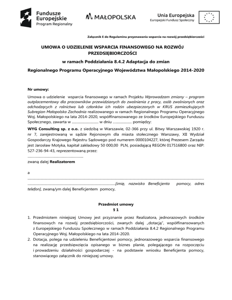 Załącznik E do Regulaminu przyznawania wsparcia na rozwój przedsiębiorczości UMOWA O UDZIELENIE WSPARCIA FINANSOWEGO NA ROZWÓJ PRZEDSIĘBIORCZOŚCI w ramach Poddziałania 8.4.2 Adaptacja do zmian Regionalnego Programu Operacyjnego Województwa Małopolskiego 2014-2020 Nr umowy: Umowa o udzielenie wsparcia finansowego w ramach Projektu Wprowadzam zmiany – program outplacementowy dla pracowników przewidzianych do zwolnienia z pracy, osób zwolnionych oraz odchodzących z rolnictwa lub członków ich rodzin ubezpieczonych w KRUS zamieszkujących Subregion Małopolska Zachodnia realizowanego w ramach Regionalnego Programu Operacyjnego Woj. Małopolskiego na lata 2014-2020, współfinansowanego ze środków Europejskiego Funduszu Społecznego, zawarta w .............................. w dniu ….................. pomiędzy: WYG Consulting sp. z o.o. z siedzibą w Warszawie, 02-366 przy ul. Bitwy Warszawskiej 1920 r. nr 7, zarejestrowaną w sądzie Rejonowym dla miasta stołecznego Warszawy, XII Wydział Gospodarczy Krajowego Rejestru Sądowego pod numerem 0000104227, której Prezesem Zarządu jest Jarosław Motyka, kapitał zakładowy 50 000,00 PLN, posiadającą REGON 017516800 oraz NIP: 527-236-94-43, reprezentowaną przez: ……………………………………………….. zwaną dalej Realizatorem a ....................................................................................................................................................................................................... ...................................................................................................[imię, nazwisko Beneficjenta pomocy, adres telefon], zwaną/ym dalej Beneficjentem pomocy, Przedmiot umowy §1 1. Przedmiotem niniejszej Umowy jest przyznanie przez Realizatora, jednorazowych środków finansowych na rozwój przedsiębiorczości, zwanych dalej „dotacją”, współfinansowanych z Europejskiego Funduszu Społecznego w ramach Poddziałania 8.4.2 Regionalnego Programu Operacyjnego Woj. Małopolskiego na lata 2014-2020. 2. Dotacja, polega na udzieleniu Beneficjentowi pomocy, jednorazowego wsparcia finansowego na realizację przedsięwzięcia opisanego w biznes planie, polegającego na rozpoczęciu i prowadzeniu działalności gospodarczej - na podstawie wniosku Beneficjenta pomocy, stanowiącego załącznik do niniejszej umowy. 3. Pomoc będąca przedmiotem niniejszej Umowy jest udzielana w oparciu o zasadę de minimis1, zgodnie z Rozporządzeniem Ministra Infrastruktury i Rozwoju z dnia 2 lipca 2015 r. w sprawie udzielania pomocy de minimis oraz pomocy publicznej w ramach programów operacyjnych finansowanych z Europejskiego Funduszu Społecznego na lata 2014-2020 (Dz.U. 2015 nr 1073 poz..)2 4. Beneficjent pomocy otrzymuje dotację na zasadach i warunkach określonych w niniejszej Umowie oraz załącznikach, które stanowią integralną część Umowy. 5. Na warunkach określonych w niniejszej umowie, Realizator przyznaje Beneficjentowi pomocy dotację na realizację przedsięwzięcia, w łącznej kwocie nieprzekraczającej ................... PLN (słownie: …......................................................). Płatności §2 1. Realizator wypłaci Beneficjentowi pomocy kwotę dotacji o której mowa w § 1 ust. 5 w formie zaliczki w wysokości 100 % kwoty dotacji tj. ................... PLN (słownie ................................. ..................................................................................................PLN) w terminie ....... dni od podpisania niniejszej umowy. 2. Wydatkowanie przez Beneficjenta pomocy dotacji oraz realizacja przedsięwzięcia muszą być zgodne z przepisami Ustawy z dnia 2 lipca 2004 roku o swobodzie działalności gospodarczej (Dz. U. Nr 173, poz. 1807 z późn. zm.) oraz zatwierdzonym Biznes Planem, z zastrzeżeniem zapisów § 4 ust. 4. 3. Realizator w dniu podpisania niniejszej Umowy zobowiązany jest wydać Beneficjentowi pomocy zaświadczenie o udzielonej pomocy de minimis, zgodnie z Rozporządzeniem Rady Ministrów z dnia 20 marca 2007 r. w sprawie zaświadczeń o pomocy de minimis i pomocy de minimis w rolnictwie lub rybołówstwie (Dz. U. Nr 53, poz. 354 z późn. zm.)3. 4. Jeżeli w wyniku rozliczenia wsparcia Beneficjent pomocy przedstawi dokumenty świadczące o wykorzystaniu mniejszej kwoty dotacji, niż wartość zapisana w w/w zaświadczeniu, Realizator zobligowany jest do wydania zaktualizowanego zaświadczenia o przyznaniu pomocy objętej zasadą de minimis. 5. Beneficjent pomocy zobowiązany jest przechowywać dokumentację związaną z otrzymaną dotacją przez okres 10 lat, licząc od dnia podpisania niniejszej Umowy. 6. Wszystkie płatności będą dokonywane przez Realizatora w PLN na rachunek bankowy Beneficjenta pomocy prowadzony w złotych polskich nr ................................................................ ...................................... w banku .................................................................... Okres wydatkowania dotacji §3 Pomoc będąca przedmiotem niniejszej umowy ma charakter pomocy de minimis w rozumieniu Rozporządzenia Komisji (UE) Nr 1407/2013 z dnia 18 grudnia 2013r. w sprawie stosowania art. 107 i 108 Traktatu o funkcjonowaniu Unii Europejskiej do pomocy de minimis (Dz.UE. L 352 z dnia 24.12.2013r.) 2 W przypadku zmiany lub uchylenia wskazanego rozporządzenia, Realizator zobowiązany jest postępować zgodnie z wówczas obowiązującym aktem prawnym. 3 W przypadku zmiany lub uchylenia wskazanego rozporządzenia, Realizator zobowiązany jest postępować zgodnie z wówczas obowiązującym aktem prawnym. 1 1. Okres wydatkowania środków objętych dotacją ustala się od dnia ........................... do dnia ............... . 2. Beneficjent pomocy zobowiązany jest rozliczyć otrzymane środki finansowe w terminie do ………………………………….., nie dłuższym jednak niż 30 dni kalendarzowych od dnia, w którym nastąpiło zakończ