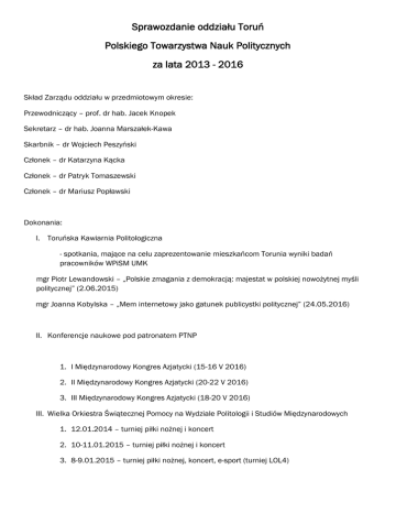 Sprawozdanie oddziału Toruń Polskiego Towarzystwa Nauk Politycznych za lata 2013 - 2016 Skład Zarządu oddziału w przedmiotowym okresie: Przewodniczący – prof. dr hab. Jacek Knopek Sekretarz – dr hab. Joanna Marszałek-Kawa Skarbnik – dr Wojciech Peszyński Członek – dr Katarzyna Kącka Członek – dr Patryk Tomaszewski Członek – dr Mariusz Popławski Dokonania: I. Toruńska Kawiarnia Politologiczna - spotkania, mające na celu zaprezentowanie mieszkańcom Torunia wyniki badań pracowników WPiSM UMK mgr Piotr Lewandowski – „Polskie zmagania z demokracją: majestat w polskiej nowożytnej myśli politycznej” (2.06.2015) mgr Joanna Kobylska – „Mem internetowy jako gatunek publicystki politycznej” (24.05.2016) II. Konferencje naukowe pod patronatem PTNP 1. I Międzynarodowy Kongres Azjatycki (15-16 V 2016) 2. II Międzynarodowy Kongres Azjatycki (20-22 V 2016) 3. III Międzynarodowy Kongres Azjatycki (18-20 V 2016) III. Wielka Orkiestra Świątecznej Pomocy na Wydziale Politologii i Studiów Międzynarodowych 1. 12.01.2014 – turniej piłki nożnej i koncert 2. 10-11.01.2015 – turniej piłki nożnej i koncert 3. 8-9.01.2015 – turniej piłki nożnej, koncert, e-sport (turniej LOL4)