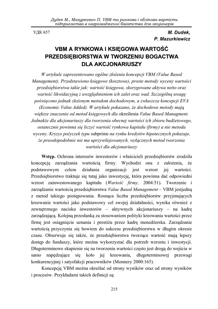 Дудек М., Мазуркевич П. VBM та ринкова і облікова вартість підприємства в нагромадженні багатства для акціонерів УДК 657 M. Dudek, P. Mazurkiewicz VBM A RYNKOWA I KSIĘGOWA WARTOŚĆ PRZEDSIĘBIORSTWA W TWORZENIU BOGACTWA DLA AKCJONARIUSZY W artykule zaprezentowano ogólne złożenia koncepcji VBM (Value Based Management). Przedstawiono księgowe (kosztowe), proste metody wyceny wartości przedsiębiorstwa takie jak: wartość księgowa, skorygowane aktywa netto oraz wartość likwidacyjną z uwzględnieniem ich zalet oraz wad. Szczególną uwagę poświęcono jednak złożonym metodom dochodowym, a zwłaszcza koncepcji EVA (Economic Value Added). W artykule pokazano, że dochodowe metody mają większe znaczenie od metod księgowych dla określenia Value Based Managment. Jednakże dla akcjonariuszy dla tworzenia obecnej wartości ich zbioru budżetowego, ostatecznie powinna się liczyć wartość rynkowa kapitału (firmy) a nie metoda wyceny. Kryzys pożyczek typu subprime na rynku kredytów hipotecznych pokazuje, że prawdopodobnie nie ma uprzywilejowanych, wyłącznych metod tworzenia wartości dla akcjonariuszy Wstęp. Ochrona interesów inwestorów i właścicieli przedsiębiorstw zrodziła koncepcję zarządzania wartością firmy. Wychodzi ona z założenia, że podstawowym celem działania organizacji jest wzrost jej wartości. Przedsiębiorstwo traktuje się tutaj jako inwestycję, która powinna dać odpowiedni wzrost zainwestowanego kapitału (Wartość firmy, 2004:51). Tworzenie i zarządzanie wartością przedsiębiorstwa Value Based Management – VBM jestjedną z metod takiego postępowania. Rosnąca liczba przedsiębiorstw przyjmujących kreowanie wartości jako podstawowy cel swojej działalności, wynika również z zewnętrznego nacisku inwestorów – aktywnych akcjonariuszy – na kadrę zarządzającą. Kolejną przesłanką za stosowaniem polityki kreowania wartości przez firmę jest osiągnięcie uznania i prestiżu przez kadrę menedżerska. Zarządzanie wartością przyczynia się bowiem do sukcesu przedsiębiorstwa w długim okresie czasu. Obserwuje się także, że przedsiębiorstwa tworzące wartość mają lepszy dostęp do funduszy, które można wykorzystać dla potrzeb wzrostu i inwestycji. Długoterminowe skupienie się na tworzeniu wartości często jest drogą do wejścia w samo napędzające się koło jej kreowania, długoterminowej przewagi konkurencyjnej i satysfakcji pracowników (Monnery 2000:165). Koncepcję VBM można określać od strony wyników oraz od strony wyników i procesów. Przykładami takich definicji są: 215 Міжнародний збірник наукових праць. Випуск 3(12) 1) VBM to takie podejście do zarządzania, w którym przedsiębiorstwo kierując się maksymalizacją wartości dla akcjonariusza osiąga wyższe zwroty od kosztu kapitału, (Simms, 2001:34-35); 2) VBM jest konstrukcją polegającą na mierzeniu i zarządzaniu biznesem dla wykreowania wyższej długoterminowej wartości dla akcjonariuszy; efekty są mierzone w formie wyższych kursów akcji i wzrostu wielkości wypłaconych dywidend (Marsh, 1999:58-59); 3) VBM może obejmować niemal wszystko; ustawia pod kątem zwiększenia wartości dla akcjonariuszy strategię, politykę, pomiary osiągnięć, nagrody, organizację, procesy, zasoby ludzkie i systemy, które przyczyniają się do zwiększenia wartości dla akcjonariusza (Black, et al, 200:83); 4) VBM jest uznanym menedżerskim podejściem, które obejmuje redefinicję celów, struktur i systemów, ożywiających strategię i procesy operacyjne przewartościowujących praktyki zarządzania zasobami pracy; VBM nie jest szybką naprawą, lecz drogą wymagającą konsekwencji i zaangażowania (Boulos, et al., 2001:54). Wprowadzenie do zarządzania opartego na wartości wymaga transformacji organizacji na wszystkich szczeblach. Najważniejsze jednak zmiany powinny pochodzić od góry. Decyzje podejmowane w firmie powinny być rozpatrywane z punktu widzenia wartości, w tym decyzje dotyczące kształtu przedsiębiorstwa, planowania portfela, alokacji zasobów, fuzji, dezinwestycji i przejęcia oraz elementów polityki finansowej. Przyjmuje się, że aby zarządzanie przez wartość było skuteczne musi istnieć zgodność pomiędzy czterema procesami (Marcinkowska, 2000:24) : planowaniem strategicznym, budżetowaniem, sprawozdawczością finansową, motywacyjnym wynagrodzeniem Wdrażanie idei VBM składa się z czterech faz: opracowania strategii, wyznaczenia celów, zaplanowania działań sporządzenia budżetu Metody najczęściej służące oszacowaniu wartości przedsiębiorstwa to: Metoda księgowa – należy do najprostszych metod pozwalających wycenić dane przedsiębiorstwo. Wystarczy odczytać z ostatniego bilansu wartość kapitałów własnych na które składają się: kapitał podstawowy akcyjny lub udziałowy, należne nie wniesione wkłady na kapitał akcyjny, kapitał zapasowy, kapitały rezerwowe, 216 Дудек М., Мазуркевич П. VBM та ринкова і облікова вартість підприємства в нагромадженні багатства для акціонерів w tym z aktualizacji wyceny, zyski niepodzielone lub straty niepokryte z lat ubiegłych, zyski lub straty wypracowane w bieżącym roku obrotowym. Wadami tej metody jest, że nie nadaje się do zastosowania w przypadku przedsiębiorstw kontynuujących swoją działalność oraz brak ekonomicznej interpretacji z punktu widzenia wartości firmy. Należy pamiętać, iż wartość firmy może być poważnie zniekształcona, gdy firma korzystając z ulg inwestycyjnych, dokonała w przeszłości na potrzeby rachunkowości bilansowej, również „superprzyspieszonej”, jednorazowej amortyzacji. Z uwagi na powyższe wady zauważa Machała ( 2001: 429-432), pojawił się pomysł, aby dzisiejsz