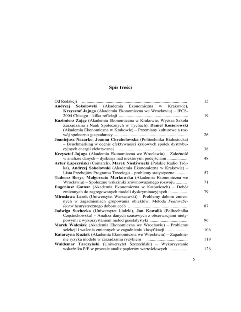 Spis treści Od Redakcji .............................................................................................. Andrzej Sokołowski (Akademia Ekonomiczna w Krakowie), Krzysztof Jajuga (Akademia Ekonomiczna we Wrocławiu) – IFCS2004 Chicago – kilka refleksji .............................................................. Kazimierz Zając (Akademia Ekonomiczna w Krakowie, Wyższa Szkoła Zarządzania i Nauk Społecznych w Tychach), Daniel Kosiorowski (Akademia Ekonomiczna w Krakowie) – Przemiany kulturowe a rozwój społeczno-gospodarczy .................................................................. Joanicjusz Nazarko, Joanna Chrabołowska (Politechnika Białostocka) – Benchmarking w ocenie efektywności krajowych spółek dystrybucyjnych energii elektrycznej .............................................................. Krzysztof Jajuga (Akademia Ekonomiczna we Wrocławiu) – Zależność w analizie danych – dyskusja nad niektórymi podejściami .................. Artur Łapczyński (Comarch), Marek Niedźwiecki (Polskie Radio Trójka), Andrzej Sokołowski (Akademia Ekonomiczna w Krakowie) – Lista Przebojów Programu Trzeciego – problemy statystyczne ........... Tadeusz Borys, Małgorzata Markowska (Akademia Ekonomiczna we Wrocławiu) – Społeczne wskaźniki zrównoważonego rozwoju .......... Eugeniusz Gatnar (Akademia Ekonomiczna w Katowicach) – Dobór zmiennych do zagregowanych modeli dyskryminacyjnych ................. Mirosława Lasek (Uniwersytet Warszawski) – Problemy doboru zmiennych w zagadnieniach grupowania obiektów. Metoda FeatureSelector heurystycznego doboru cech ..................................................... Jadwiga Suchecka (Uniwersytet Łódzki), Jan Kowalik (Politechnika Częstochowska) – Analiza danych czasowych z obserwacjami nietypowymi z wykorzystaniem metod geostatystyki .................................. Marek Walesiak (Akademia Ekonomiczna we Wrocławiu) – Problemy selekcji i ważenia zmiennych w zagadnieniu klasyfikacji .................... Katarzyna Kuziak (Akademia Ekonomiczna we Wrocławiu) – Zagadnienie ryzyka modelu w zarządzaniu ryzykiem ..................................... Waldemar Tarczyński (Uniwersytet Szczeciński) – Wykorzystanie wskaźnika P/E w procesie analiz papierów wartościowych ................. 15 19 26 38 48 57 71 79 87 96 106 119 126 5 Anna Zamojska-Adamczak (Uniwersytet Gdański) – Style inwestowania jako kryterium klasyfikacji funduszy inwestycyjnych ......................... Ewa Chodakowska, Joanicjusz Nazarko, Anna Worobiej (Politechnika Białostocka) – Modele MARIMA w prognozowaniu cen energii na Towarowej Giełdzie Energii SA ........................................................... Joanna Chrabołowska (Politechnika Białostocka) – Dobór wskaźników ekonomiczno-finansowych do badań porównawczych efektywności krajowych spółek dystrybucji energii elektrycznej .............................. Alicja Ganczarek (Akademia Ekonomiczna w Katowicach) – Zastosowanie analizy kanonicznej na polskim rynku energii elektrycznej ......... Beata Basiura (Akademia Górniczo-Hutnicza w Krakowie) – Empiryczny test jednorodności dla metody Warda stosowanej do analizy zbioru województw Polski .............................................................................. Andrzej Bąk (Akademia Ekonomiczna we Wrocławiu) – Problemy estymacji parametrów w modelach dekompozycyjnych z dyskretną zmienną objaśnianą .............................................................................. Feliks Wysocki, Aleksandra Łuczak (Akademia Rolnicza w Poznaniu) – Zastosowanie rozmytych wielokryterialnych metod porządkowania liniowego do konstrukcji syntetycznego miernika poziomu rozwoju powiatów .............................................................................................. Józef Kupczyk (Akademia Ekonomiczna we Wrocławiu) – Identyfikacja i pomiar ryzyka pogodowego w przedsiębiorstwie ................................ Małgorzata Łuniewska (Uniwersytet Szczeciński) – Sektorowe syntetyczne mierniki rozwoju w analizach papierów wartościowych .......... Agnieszka Majewska (Uniwersytet Szczeciński) – Wykorzystanie uogólnionej miary odległości do oceny stopnia popularności giełdowych instrumentów pochodnych ................................................................... Katarzyna Halicka (Politechnika Białostocka) – Prognozowanie cen energii elektrycznej z wykorzystaniem SSN na Towarowej Giełdzie Energii SA Joanicjusz Nazarko, Mikołaj Rybaczuk, Arkadiusz Jurczuk (Politechnika Białostocka) – Wpływ poziomu zakłóceń losowych na możliwość identyfikacji modeli ARIMA ..................................................... Urszula Kołaszewska (Politechnika Białostocka) – Wykorzystanie analizy skupień w prognozowaniu analogowym ......................................... Jerzy Korzeniewski (Uniwersytet Łódzki) – Propozycja nowego algorytmu wyznaczającego liczbę skupień .................................................. Kamila Migdał-Najman, Krzysztof Najman (Uniwersytet Gdański) – Analityczne metody ustalania liczby skupień ....................................... Dorota Rozmus (Akademia Ekonomiczna w Katowicach) – Dekompozycja błędu klasyfikacji w zagregowanych modelach dyskryminacyjnych …………………………………………………………………... 6 134 142 151 162 171 180 190 200 210 220 228 238 248 257 265 274 Mirosława Czerniawska (Uniwersytet w Białymstoku), Joanicjusz Nazarko (Politechnika Białostocka), Mikołaj Rybaczuk (Politechnika Białostocka), Metody graficzne w analizach porównawczych systemów wartości .... Marta Dziechciarz (Akademia Ekonomiczna we Wrocławiu) – Badanie satysfakcji pracowników w organizacji gospodarczej. Podejście klasyfikacyjne ............................................................................................ Paweł Lula (Akademia Ekonomiczna w Krakowie) – Kla