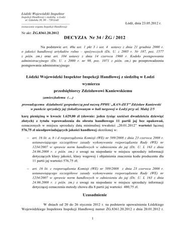 DECYZJA Nr 34 / ŻG / 2012 - Wojewódzki Inspektorat Inspekcji