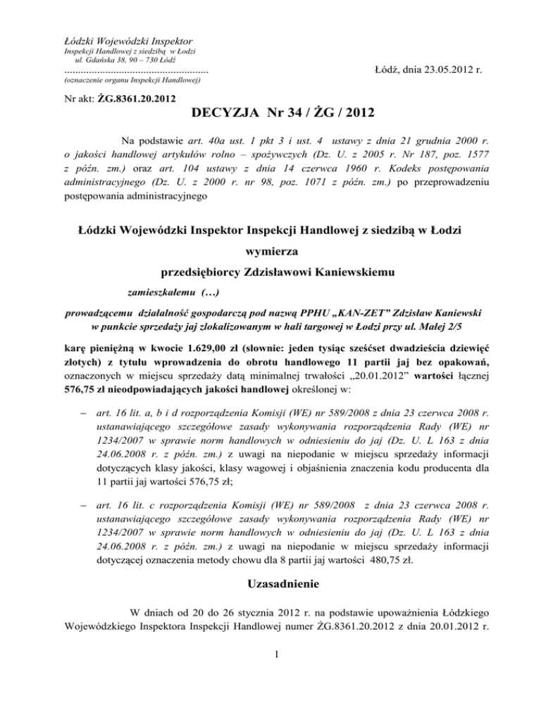Łódzki Wojewódzki Inspektor Inspekcji Handlowej z siedzibą w Łodzi ul. Gdańska 38, 90 – 730 Łódź Łódź, dnia 23.05.2012 r. ..................................................... (oznaczenie organu Inspekcji Handlowej) Nr akt: ŻG.8361.20.2012 DECYZJA Nr 34 / ŻG / 2012 Na podstawie art. 40a ust. 1 pkt 3 i ust. 4 ustawy z dnia 21 grudnia 2000 r. o jakości handlowej artykułów rolno – spożywczych (Dz. U. z 2005 r. Nr 187, poz. 1577 z późn. zm.) oraz art. 104 ustawy z dnia 14 czerwca 1960 r. Kodeks postępowania administracyjnego (Dz. U. z 2000 r. nr 98, poz. 1071 z późn. zm.) po przeprowadzeniu postępowania administracyjnego Łódzki Wojewódzki Inspektor Inspekcji Handlowej z siedzibą w Łodzi wymierza przedsiębiorcy Zdzisławowi Kaniewskiemu zamieszkałemu (…) prowadzącemu działalność gospodarczą pod nazwą PPHU „KAN-ZET” Zdzisław Kaniewski w punkcie sprzedaży jaj zlokalizowanym w hali targowej w Łodzi przy ul. Małej 2/5 karę pieniężną w kwocie 1.629,00 zł (słownie: jeden tysiąc sześćset dwadzieścia dziewięć złotych) z tytułu wprowadzenia do obrotu handlowego 11 partii jaj bez opakowań, oznaczonych w miejscu sprzedaży datą minimalnej trwałości „20.01.2012” wartości łącznej 576,75 zł nieodpowiadających jakości handlowej określonej w: art. 16 lit. a, b i d rozporządzenia Komisji (WE) nr 589/2008 z dnia 23 czerwca 2008 r. ustanawiającego szczegółowe zasady wykonywania rozporządzenia Rady (WE) nr 1234/2007 w sprawie norm handlowych w odniesieniu do jaj (Dz. U. L 163 z dnia 24.06.2008 r. z późn. zm.) z uwagi na niepodanie w miejscu sprzedaży informacji dotyczących klasy jakości, klasy wagowej i objaśnienia znaczenia kodu producenta dla 11 partii jaj wartości 576,75 zł; art. 16 lit. c rozporządzenia Komisji (WE) nr 589/2008 z dnia 23 czerwca 2008 r. ustanawiającego szczegółowe zasady wykonywania rozporządzenia Rady (WE) nr 1234/2007 w sprawie norm handlowych w odniesieniu do jaj (Dz. U. L 163 z dnia 24.06.2008 r. z późn. zm.) z uwagi na niepodanie w miejscu sprzedaży informacji dotyczącej oznaczenia metody chowu dla 8 partii jaj wartości 480,75 zł. Uzasadnienie W dniach od 20 do 26 stycznia 2012 r. na podstawie upoważnienia Łódzkiego Wojewódzkiego Inspektora Inspekcji Handlowej numer ŻG.8361.20.2012 z dnia 20.01.2012 r. 1 inspektorzy Wojewódzkiego Inspektoratu Inspekcji Handlowej w Łodzi, przeprowadzili kontrolę w punkcie sprzedaży jaj zlokalizowanym w hali targowej w Łodzi przy ul. Małej 2/5, należącym do firmy PPHU „KAN-ZET” Zdzisław Kaniewski. Kontrolę przeprowadzono na podstawie przepisów art. 3 ust. 1 - 3 rozporządzenia Parlamentu Europejskiego i Rady (WE) Nr 882/2004 z dnia 29 kwietnia 2004 r. w sprawie kontroli urzędowych przeprowadzanych w celu sprawdzenia zgodności z prawem paszowym i żywnościowym oraz regułami dotyczącymi zdrowia zwierząt i dobrostanu zwierząt (Dz. U. L 165 z 30.4.2004 ze zm.), art. 17 ust. 3 ustawy z dnia 21 grudnia 2000 r. o jakości handlowej artykułów rolno-spożywczych (Dz. U. z 2005 r. nr 187, poz. 1577, z późn. zm.), art. 3 ust. 1 pkt 1, 2 i 6 ustawy z dnia 15 grudnia 2000 r. o Inspekcji Handlowej (Dz. U. z 2009 r. Nr 151, poz. 1219 z późn. zm.) w obecności przywołanego świadka, funkcjonariusza publicznego (…) pracownika Wojewódzkiego Inspektoratu Jakości Handlowej Artykułów Rolno-Spożywczych w Łodzi (art. 80 ust. 5 ustawy z dnia 02.07.2004 r. o swobodzie działalności gospodarczej – Dz. U. z 2010 r. nr 220, poz. 1447 ze zm.) w dniu 20 stycznia 2012 r. oraz właściciela punktu Zdzisława Kaniewskiego w pozostałych dniach. W trakcie prowadzonych działań kontrolnych stwierdzono, że do sprzedaży oferowano 11 partii jaj luzem, oznaczonych w miejscu sprzedaży datą minimalnej trwałości „20.01.2012” wartości łącznej 576,75 zł w ilości 1.280 sztuk, w tym: 180 sztuk w cenie 0,28 zł za sztukę, 105 sztuk w cenie 0,40 zł za sztukę, 270 sztuk w cenie 0,44 zł za sztukę, 210 sztuk w cenie 0,48 zł za sztukę, 135 sztuk jaj w cenie 0,45 zł za sztukę, 60 sztuk jaj w cenie 0,50 zł za sztukę, 90 sztuk jaj od kur zielononóżek w cenie 0,60 zł za sztukę, 40 sztuk jaj wiejskich w cenie 0,60 zł za sztukę, 120 sztuk jaj z wolnego wybiegu w cenie 0,45 zł za sztukę, 40 sztuk jaj ściółkowych w cenie 0,60 zł za sztukę, 30 sztuk jaj ekologicznych w cenie 0,60 zł za sztukę bez wymaganych oznaczeń w miejscu sprzedaży. Przedmiotowe jaja wyłożono do sprzedaży luzem bez zamieszczenia informacji dotyczącej klasy jakości, klasy wagowej i objaśnienia znaczenia kodu producenta, wbrew przepisom określonym w art. 16 lit. a, b i d rozporządzenia Komisji (WE) nr 589/2008 z dnia 23 czerwca 2008 r. ustanawiającego szczegółowe zasady wykonywania rozporządzenia Rady (WE) nr 1234/2007 w sprawie norm handlowych w odniesieniu do jaj (Dz. U. L 163 z dnia 24.06.2008 r. z późn. zm.) zwanego dalej „rozporządzeniem 589/2008”. Ponadto dla 8 partii jaj wartości 480,75 zł w ilości 1090 sztuk, w tym: 180 sztuk w cenie 0,28 zł za sztukę, 105 sztuk w cenie 0,40 zł za sztukę, 270 sztuk w cenie 0,44 zł za sztukę, 210 sztuk w cenie 0,48 zł za sztukę, 2 135 sztuk jaj w cenie 0,45 zł za sztukę, 60 sztuk jaj w cenie 0,50 zł za sztukę, 90 sztuk jaj od kur zielononóżek w cenie 0,60 zł za sztukę, 40 sztuk jaj wiejskich w cenie 0,60 zł za sztukę w miejscu sprzedaży dodatkowo nie podano informacji dotyczącej oznaczenia metody chowu wbrew przepisom określonym w art. 16 lit. c rozporządzenia 589/2008. W prowadzonym postępowaniu wyjaśniającym ustalono, że przedmiotowe jaja pochodziły z: Fermy Drobiu „BART-MAR” Włodzimierz Bartkowiak, Sokołowice 108a, 56-400 Oleśnica; Fermy Drobiu Dariusz Świtała, Świniary 16a, 56-210 Wąsosz; Fermy Drobiu Bartosza Lipowczyka, Łaszczyn 3, 63-900 Rawicz; Rolniczej Spółdzielni Produkcyjnej w Krobuszu, Krobusz 2, 48-217 Gostomia; Fermy Drobiu Mirosława Strze