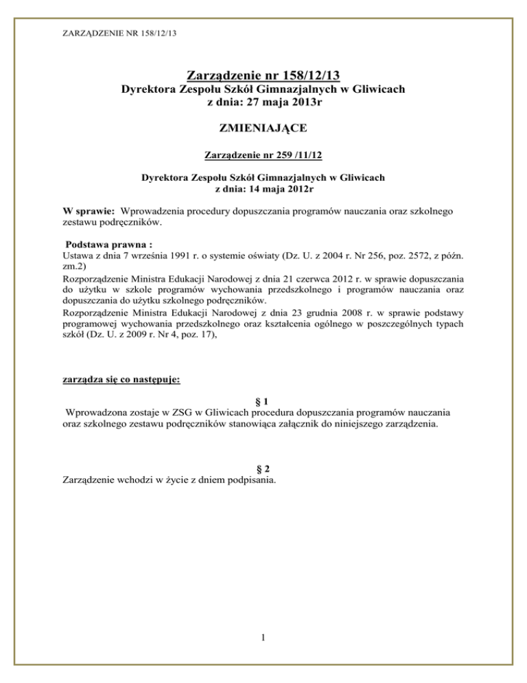 Zarządzenie nr 158/12/13 Dyrektora Zespołu Szkół Gimnazjalnych