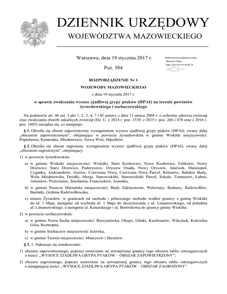 DZIENNIK URZĘDOWY WOJEWÓDZTWA MAZOWIECKIEGO Warszawa, dnia 19 stycznia 2017 r. Elektronicznie podpisany przez: Sławomir Parys Poz. 584 Data: 2017-01-19 16:23:13 ROZPORZĄDZENIE Nr 1 WOJEWODY MAZOWIECKIEGO z dnia 19 stycznia 2017 r. w sprawie zwalczania wysoce zjadliwej grypy ptaków (HPAI) na terenie powiatów żyrardowskiego i sochaczewskiego Na podstawie art. 46 ust. 3 pkt 1, 2, 3, 4, 7 i 8f ustawy z dnia 11 marca 2004 r. o ochronie zdrowia zwierząt oraz zwalczaniu chorób zakaźnych zwierząt (Dz. U. z 2014 r. poz. 1539, z 2015 r. poz. 266 i 470 oraz z 2016 r. poz. 1605) zarządza się, co następuje: § 1. Określa się obszar zapowietrzony wystąpieniem wysoce zjadliwej grypy ptaków (HPAI), zwany dalej „obszarem zapowietrzonym”, obejmujący w powiecie żyrardowskim w gminie Wiskitki miejscowości: Popielarnia, Kamionka, Miedniewice, Nowa Wieś, Hipolitów. § 2. Określa się obszar zagrożony wystąpieniem wysoce zjadliwej grypy ptaków (HPAI), zwany dalej „obszarem zagrożonym”, obejmujący: 1) w powiecie żyrardowskim: a) w gminie Wiskitki miejscowości: Wiskitki, Stare Kozłowice, Nowe Kozłowice, Feliksów, Nowy Drzewicz, Stary Drzewicz, Podoryszew, Oryszew Osada, Nowy Oryszew, Janówek, Duninopol, Cyganka, Aleksandrów, Guzów, Czerwona Niwa, Czerwona Niwa Parcel, Różanów, Babskie Budy, Wola Miedniewska, Działki, Morgi, Starowiskitki, Starowiskitki Parcel, Sokule, Tomaszew, Łubno, Antoniew, Prościeniec, Smolarnia, Franciszków, Jesionka, b) w gminie Puszcza Mariańska miejscowości: Budy Zaklasztorne, Waleriany, Bednary, Radziwiłłów, Bartniki, Grabina Radziwiłłowska, c) miasto Żyrardów, w granicach od zachodu i północnego zachodu wzdłuż granicy z gminą Wiskitki do ul. 1 Maja, następnie od wschodu ul. 1 Maja do skrzyżowania z ul. Limanowskiego, od południa ul. Limanowskiego, a następnie ul. Konarskiego i ul. Borówkową do granicy gminy Wiskitki; 2) w powiecie sochaczewskim: a) w gminie Nowa Sucha miejscowości: Borzymówka, Okopy, Glinki, Kurdwanów, Wikcinek, Kościelna Góra, Roztropna, b) w gminie Sochaczew miejscowość Jeżówka, c) w gminie Teresin miejscowości: Maurycew i Skrzelew. § 3. 1. Nakazuje się oznakowanie: 1) obszaru zapowietrzonego, poprzez ustawienie na zewnętrznej granicy tego obszaru tablic ostrzegawczych o treści: „WYSOCE ZJADLIWA GRYPA PTAKÓW – OBSZAR ZAPOWIETRZONY”; 2) obszaru zagrożonego, poprzez ustawienie na zewnętrznej granicy tego obszaru tablic ostrzegawczych o następującej treści: „WYSOCE ZJADLIWA GRYPA PTAKÓW – OBSZAR ZAGROŻONY”. Dziennik Urzędowy Województwa Mazowieckiego –2– Poz. 584 2. Tablice i napisy, o których mowa w ust. 1, mają mieć takie wymiary, aby były czytelne z odległości co najmniej 100 metrów, oznakowane w sposób trwały, nie podlegający działaniu czynników atmosferycznych. 3. Tablice, o których mowa w ust. 1, należy umieścić na ustalonych przez właściwe organy drogach publicznych lub prywatnych. § 4. 1. W obszarze zapowietrzonym zakazuje się: 1) przemieszczania do i z gospodarstwa drobiu lub innych ptaków oraz ssaków utrzymywanych w gospodarstwach, bez zgody właściwego miejscowo powiatowego lekarza weterynarii; 2) wywożenia lub rozrzucania ściółki lub nawozów naturalnych; 3) organizowania lotów treningowych i lotów konkursowych gołębi; 4) organizowania polowań i odłowów ptactwa dzikiego, bez zgody właściwego miejscowo powiatowego lekarza weterynarii; 5) przemieszczania i transportu drobiu lub innych ptaków, w tym piskląt jednodniowych, drobiu odchowanego do rozpoczęcia nieśności, a także ich zwłok i jaj z gospodarstw znajdujących się na obszarze zapowietrzonym, bez zgody właściwego miejscowo powiatowego lekarza weterynarii; 6) transportu mięsa drobiowego z rzeźni, zakładów rozbioru oraz chłodni, bez zgody właściwego miejscowo powiatowego lekarza weterynarii; 7) targowiskowej sprzedaży mięsa drobiowego, mięsa ptaków łownych oraz jaj konsumpcyjnych i wylęgowych; 8) wypuszczania drobiu lub innych ptaków w celu odtworzenia zasobów ptactwa łownego, bez zgody właściwego miejscowo powiatowego lekarza weterynarii. 2. W obszarze zapowietrzonym nakazuje się: 1) niezwłoczne czyszczenie i odkażanie środków transportu wykorzystywanego do transportu drobiu lub innych ptaków, ich mięsa, paszy, ściółki lub nawozów naturalnych, innych środków transportu wjeżdżających do gospodarstwa lub z niego wyjeżdżających oraz innych przedmiotów lub substancji, które mogły zostać skażone wirusem wysoce zjadliwej grypy ptaków (HPAI); 2) oczyszczanie, odkażanie, deratyzację i dezynsekcję miejsc przebywania drobiu i innych ptaków utrzymywanych w obrębie gospodarstwa. § 5. 1. W obszarze zagrożonym zakazuje się: 1) przemieszczania do gospodarstwa drobiu lub innych ptaków; 2) wywożenia lub rozrzucania ściółki lub nawozów naturalnych; 3) organizowania lotów treningowych i lotów konkursowych gołębi; 4) organizowania polowań i odłowów ptactwa dzikiego, bez zgody właściwego miejscowo powiatowego lekarza weterynarii; 5) przemieszczania i transportu drobiu lub innych ptaków, w tym piskląt jednodniowych, drobiu odchowanego do rozpoczęcia nieśności, a także ich zwłok i jaj z gospodarstw znajdujących się na obszarze zagrożonym, bez zgody właściwego miejscowo powiatowego lekarza weterynarii; 6) transportu mięsa drobiowego z rzeźni, zakładów rozbioru oraz chłodni, bez zgody właściwego miejscowo powiatowego lekarza weterynarii; 7) targowiskowej sprzedaży mięsa drobiowego, mięsa ptaków łownych oraz jaj konsumpcyjnych i wylęgowych; 8) wypuszczania drobiu lub innych ptaków w celu odtworzenia zasobów ptactwa łownego, bez zgody właściwego miejscowo powiatowego lekarza weterynarii; 9) przemieszczania drobiu, w tym drobiu odchowanego do rozpoczęcia nieśności i piskląt jednodniowych oraz jaj na obszarze zagrożonym, bez zgody właściwego miejscowo powiatowego lekarza wetery