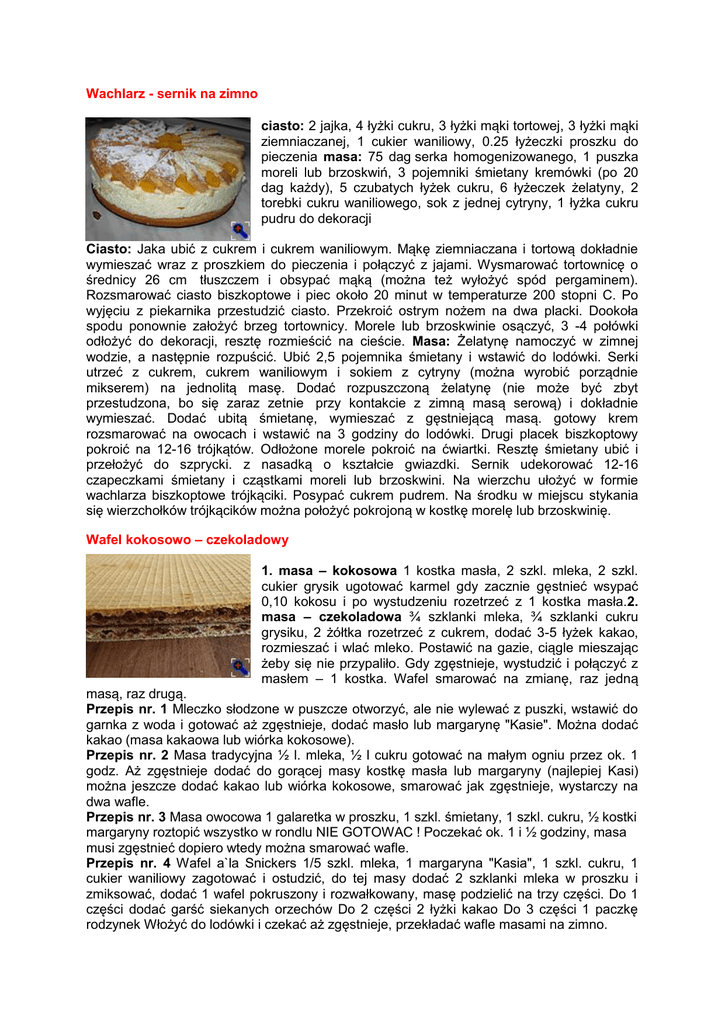 Wachlarz - sernik na zimno ciasto: 2 jajka, 4 łyżki cukru, 3 łyżki mąki tortowej, 3 łyżki mąki ziemniaczanej, 1 cukier waniliowy, 0.25 łyżeczki proszku do pieczenia masa: 75 dag serka homogenizowanego, 1 puszka moreli lub brzoskwiń, 3 pojemniki śmietany kremówki (po 20 dag każdy), 5 czubatych łyżek cukru, 6 łyżeczek żelatyny, 2 torebki cukru waniliowego, sok z jednej cytryny, 1 łyżka cukru pudru do dekoracji Ciasto: Jaka ubić z cukrem i cukrem waniliowym. Mąkę ziemniaczana i tortową dokładnie wymieszać wraz z proszkiem do pieczenia i połączyć z jajami. Wysmarować tortownicę o średnicy 26 cm tłuszczem i obsypać mąką (można też wyłożyć spód pergaminem). Rozsmarować ciasto biszkoptowe i piec około 20 minut w temperaturze 200 stopni C. Po wyjęciu z piekarnika przestudzić ciasto. Przekroić ostrym nożem na dwa placki. Dookoła spodu ponownie założyć brzeg tortownicy. Morele lub brzoskwinie osączyć, 3 -4 połówki odłożyć do dekoracji, resztę rozmieścić na cieście. Masa: Żelatynę namoczyć w zimnej wodzie, a następnie rozpuścić. Ubić 2,5 pojemnika śmietany i wstawić do lodówki. Serki utrzeć z cukrem, cukrem waniliowym i sokiem z cytryny (można wyrobić porządnie mikserem) na jednolitą masę. Dodać rozpuszczoną żelatynę (nie może być zbyt przestudzona, bo się zaraz zetnie przy kontakcie z zimną masą serową) i dokładnie wymieszać. Dodać ubitą śmietanę, wymieszać z gęstniejącą masą. gotowy krem rozsmarować na owocach i wstawić na 3 godziny do lodówki. Drugi placek biszkoptowy pokroić na 12-16 trójkątów. Odłożone morele pokroić na ćwiartki. Resztę śmietany ubić i przełożyć do szprycki. z nasadką o kształcie gwiazdki. Sernik udekorować 12-16 czapeczkami śmietany i cząstkami moreli lub brzoskwini. Na wierzchu ułożyć w formie wachlarza biszkoptowe trójkąciki. Posypać cukrem pudrem. Na środku w miejscu stykania się wierzchołków trójkącików można położyć pokrojoną w kostkę morelę lub brzoskwinię. Wafel kokosowo – czekoladowy 1. masa – kokosowa 1 kostka masła, 2 szkl. mleka, 2 szkl. cukier grysik ugotować karmel gdy zacznie gęstnieć wsypać 0,10 kokosu i po wystudzeniu rozetrzeć z 1 kostka masła.2. masa – czekoladowa ¾ szklanki mleka, ¾ szklanki cukru grysiku, 2 żółtka rozetrzeć z cukrem, dodać 3-5 łyżek kakao, rozmieszać i wlać mleko. Postawić na gazie, ciągle mieszając żeby się nie przypaliło. Gdy zgęstnieje, wystudzić i połączyć z masłem – 1 kostka. Wafel smarować na zmianę, raz jedną masą, raz drugą. Przepis nr. 1 Mleczko słodzone w puszcze otworzyć, ale nie wylewać z puszki, wstawić do garnka z woda i gotować aż zgęstnieje, dodać masło lub margarynę "Kasie". Można dodać kakao (masa kakaowa lub wiórka kokosowe). Przepis nr. 2 Masa tradycyjna ½ l. mleka, ½ l cukru gotować na małym ogniu przez ok. 1 godz. Aż zgęstnieje dodać do gorącej masy kostkę masła lub margaryny (najlepiej Kasi) można jeszcze dodać kakao lub wiórka kokosowe, smarować jak zgęstnieje, wystarczy na dwa wafle. Przepis nr. 3 Masa owocowa 1 galaretka w proszku, 1 szkl. śmietany, 1 szkl. cukru, ½ kostki margaryny roztopić wszystko w rondlu NIE GOTOWAC ! Poczekać ok. 1 i ½ godziny, masa musi zgęstnieć dopiero wtedy można smarować wafle. Przepis nr. 4 Wafel a`la Snickers 1/5 szkl. mleka, 1 margaryna "Kasia", 1 szkl. cukru, 1 cukier waniliowy zagotować i ostudzić, do tej masy dodać 2 szklanki mleka w proszku i zmiksować, dodać 1 wafel pokruszony i rozwałkowany, masę podzielić na trzy części. Do 1 części dodać garść siekanych orzechów Do 2 części 2 łyżki kakao Do 3 części 1 paczkę rodzynek Włożyć do lodówki i czekać aż zgęstnieje, przekładać wafle masami na zimno. Wafel z masą mleczno-kokosową i herbatnikami 3 grube wafle tortowe (andruty), 25 dag masła, 3/4 szklanki cukru, 200 ml mleka płynnego (może być woda), 30 dag mleka w proszku Krasnystaw (bardzo dobrze się rozprowadza) 3 szklanki, 3/4 szklanki drobnego kokosu, 35 dag herbatnikówmini z jednej strony oblanych czekoladą (moje to były Apetiitki zdobione firmy Iga) Mleko (wodę) zagotować z cukrem, odstawić, dodać masło, rozpuścić, dosypywać mleko w proszku i mieszać mikserem na jednolitą masę, dodać kokos, wymieszać. Herbatniki podzielić na połowę. Na jeden wafel dać 1/4 część masy, poukładać herbatniki, dać znów 1/4 masy, położyć wafel i podobnie druga część składników. Nie czekać, aż masa wystygnie, lepiej rozprowadza się ciepła. Obciążyć i schłodzić. Następnego dnia kroić. Wafel z płatków owsianych 1/2 kg płatków owsianych górskich, 2 szkl. Mleka, 3/4 margaryny, cukier waniliowy, 1,5 szkl. Cukru, 3 łyżki kakao Zagotować: mleko, margarynę, cukier i cukier waniliowy. Płatki wymieszać z kakao. Wsypać płatki do masy i gotować ok 10 min ciągle mieszając. W trakcie gotowania można dodać jeszcze trochę mleka. Przekładać wafel. Wafelki wafle tortowe, 3/4 woreczka mleka w proszku, 1/2margaryny, 3/2 szklanki cukru, 3/2 szklanki mleka, 2 łyżki kakao (gorzkie). 2 wafle zostawić resztę mocno ugnieść dodać mleko w proszku oraz kakao (całość wymieszać). Do roztopionego masła dodać mleko (zwykłe) i cukier mieszać na gorącym ogniu przez 3-4 min, ostudzić i dodać do wafli (wymieszać) masę przełożyć dwoma warstwami wafli. Wafelki na samych białkach Białka, 1/4 szklanki drobnego cukru (nie pudru), 1 łyżka roztopionego masła, szczypta soli, kilka kapek aromatu waniliowego, 1/3 szklanki mąki Ubić białka z cukrem, dodać masło, sól, aromat, wmieszać mąkę. Koniec. Wafelki z galaretką 2 galaretki: wiśniowa i cytrynowa, 2 paczki wafli, 0,5 szklanki cukru, 1 masło roślinne lub masło, 1 szklanka śmietany Słodkiej - najlepiej 30 procent Do garnka wsypać cukier, wlać śmietanę i włożyć masło, wszystko zagotować około 2 min. Garnek wstawić do zimn