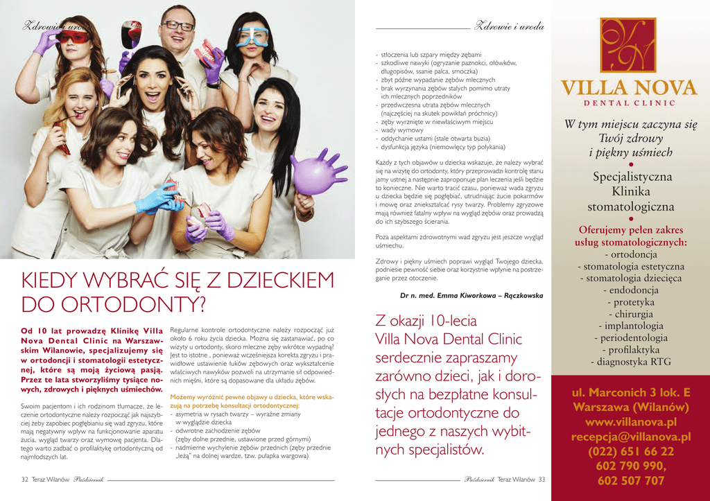 Zdrowie i uroda Zdrowie i uroda - stłoczenia lub szpary między zębami - szkodliwe nawyki (ogryzanie paznokci, ołówków, długopisów, ssanie palca, smoczka) - zbyt późne wypadanie zębów mlecznych - brak wyrzynania zębów stałych pomimo utraty ich mlecznych poprzedników - przedwczesna utrata zębów mlecznych (najczęściej na skutek powikłań próchnicy) - zęby wyrznięte w niewłaściwym miejscu - wady wymowy - oddychanie ustami (stale otwarta buzia) - dysfunkcja języka (niemowlęcy typ połykania) Każdy z tych objawów u dziecka wskazuje, że należy wybrać się na wizytę do ortodonty, który przeprowadzi kontrolę stanu jamy ustnej a następnie zaproponuje plan leczenia jeśli będzie to konieczne. nie warto tracić czasu, ponieważ wada zgryzu u dziecka będzie się pogłębiać, utrudniając żucie pokarmów i mowę oraz zniekształcać rysy twarzy. Problemy zgryzowe mają również fatalny wpływ na wygląd zębów oraz prowadzą do ich szybszego ścierania. Poza aspektami zdrowotnymi wad zgryzu jest jeszcze wygląd uśmiechu. Kiedy Wybrać się z dziecKiem do orTodonTy? Od 10 lat prowadzę Klinikę V i l l a N o v a D e n t a l C l i n i c na Warszawskim Wilanowie, specjalizujemy się w ortodoncji i stomatologii estetycznej, które są moją życiową pasją. Przez te lata stworzyliśmy tysiące nowych, zdrowych i pięknych uśmiechów. swoim pacjentom i ich rodzinom tłumacze, że leczenie ortodontyczne należy rozpocząć jak najszybciej żeby zapobiec pogłębianiu się wad zgryzu, które mają negatywny wpływ na funkcjonowanie aparatu żucia, wygląd twarzy oraz wymowę pacjenta. dlatego warto zadbać o profilaktykę ortodontyczną od najmłodszych lat. 32 Teraz Wilanów Październik regularne kontrole ortodontyczne należy rozpocząć już około 6 roku życia dziecka. można się zastanawiać, po co wizyty u ortodonty, skoro mleczne zęby wkrótce wypadną? Jest to istotne , ponieważ wcześniejsza korekta zgryzu i prawidłowe ustawienie łuków zębowych oraz wykształcenie właściwych nawyków pozwoli na utrzymanie sił odpowiednich mięśni, które są dopasowane dla układu zębów. Możemy wyróżnić pewne objawy u dziecka, które wskazują na potrzebę konsultacji ortodontycznej: - asymetria w rysach twarzy – wyraźne zmiany w wyglądzie dziecka - odwrotne zachodzenie zębów (zęby dolne przednie, ustawione przed górnymi) - nadmierne wychylenie zębów przednich (zęby przednie „leżą” na dolnej wardze, tzw. pułapka wargowa) zdrowy i piękny uśmiech poprawi wygląd Twojego dziecka, podniesie pewność siebie oraz korzystnie wpłynie na postrzeganie przez otoczenie. Dr n. med. Emma Kiworkowa – Rączkowska z okazji 10-lecia Villa nova dental clinic serdecznie zapraszamy zarówno dzieci, jak i dorosłych na bezpłatne konsultacje ortodontyczne do jednego z naszych wybitnych specjalistów. Październik Teraz Wilanów 33 W tym miejscu zaczyna się Twój zdrowy i piękny uśmiech Specjalistyczna Klinika stomatologiczna Oferujemy pełen zakres usług stomatologicznych: - ortodoncja - stomatologia estetyczna - stomatologia dziecięca - endodoncja - protetyka - chirurgia - implantologia - periodentologia - profilaktyka - diagnostyka RTG ul. Marconich 3 lok. E Warszawa (Wilanów) www.villanova.pl [email protected] (022) 651 66 22 602 790 990, 602 507 707