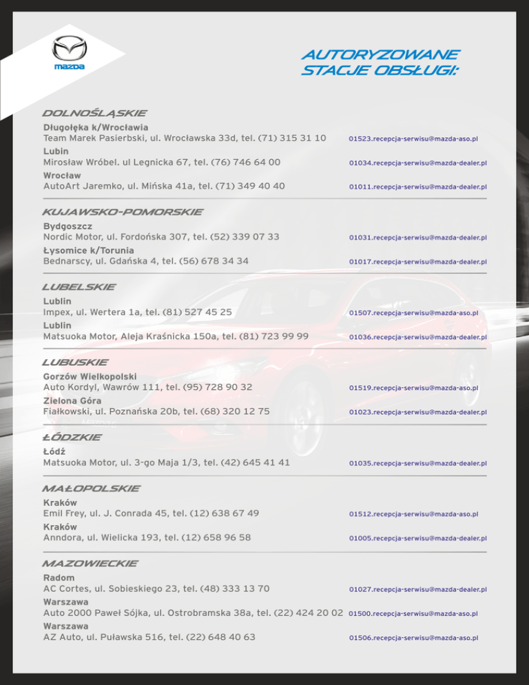 DOLNOŚLĄSKIE Długołęka k/Wrocławia Team Marek Pasierbski, ul. Wrocławska 33d, tel. (71) 315 31 10 Lubin Mirosław Wróbel. ul Legnicka 67, tel. (76) 746 64 00 Wrocław AutoArt Jaremko, ul. Mińska 41a, tel. (71) 349 40 40 [email protected] [email protected] [email protected] KUJAWSKO-POMORSKIE Bydgoszcz Nordic Motor, ul. Fordońska 307, tel. (52) 339 07 33 [email protected] Łysomice k/Torunia Bednarscy, ul. Gdańska 4, tel. (56) 678 34 34 [email protected] LUBELSKIE Lublin Impex, ul. Wertera 1a, tel. (81) 527 45 25 [email protected] Lublin Matsuoka Motor, Aleja Kraśnicka 150a, tel. (81) 723 99 99 [email protected] LUBUSKIE Gorzów Wielkopolski Auto Kordyl, Wawrów 111, tel. (95) 728 90 32 [email protected] Zielona Góra Fiałkowski, ul. Poznańska 20b, tel. (68) 320 12 75 [email protected] ŁÓDZKIE Łódź Matsuoka Motor, ul. 3-go Maja 1/3, tel. (42) 645 41 41 [email protected] MAŁOPOLSKIE Kraków Emil Frey, ul. J. Conrada 45, tel. (12) 638 67 49 [email protected] Kraków Anndora, ul. Wielicka 193, tel. (12) 658 96 58 [email protected] MAZOWIECKIE Radom AC Cortes, ul. Sobieskiego 23, tel. (48) 333 13 70 [email protected] Warszawa Auto 2000 Paweł Sójka, ul. Ostrobramska 38a, tel. (22) 424 20 02 [email protected] Warszawa AZ Auto, ul. Puławska 516, tel. (22) 648 40 63 [email protected] Mazowieckie Warszawa Bemo Motors, Al. Krakowska 169, tel. (22) 574 22 06 [email protected] Warszawa Bołtowicz, ul. Rosoła 55, tel. (22) 649 30 50 [email protected] Warszawa Gołembiewscy, ul. Św. Wincentego 92, tel. (22) 675 11 08 [email protected] Warszawa Nivette, ul. Lotnicza 3/5, tel. (22) 509 66 00 [email protected] Warszawa Odyssey, ul. Górczewska 32, tel. (22) 533 55 00 [email protected] OPOLSKIE Opole Mirosław Wróbel, ul Wspólna 1a, tel. (77) 401 83 33 [email protected] Osiny k/Opola Marco Tuning, ul. Opolska 1a, tel. (77) 457 58 20 [email protected] PODKARPACKIE Rzeszów D&R Czach, ul. Krakowska 32b, tel. (17) 860 12 20 [email protected] PODLASKIE Białystok Gołembiewscy, ul. Gen. Maczka 136, tel. (85) 74 74 371 [email protected] POMORSKIE Bolesławice k/Słupska BMG Goworowski, ul. Słupska 6, tel. (59) 848 70 70 [email protected] Gdańsk BMG Goworowski, ul. Elbląska 81, tel. (58) 3 222 222 [email protected] Gdańsk Zdanowicz, ul. Grunwaldzka 256a, tel. (58) 552 06 23 Gdynia BMG Goworowski, ul. Łużycka 9, tel. (58) 660 49 15 Reda G-M, ul. Wejherowska 63, tel. (58) 677 90 00 [email protected] [email protected] [email protected] ŚLĄSKIE Bielsko-Biała Auto-Gazda, ul. Warszawska 328, tel. (33) 810 50 00 [email protected] Dąbrowa Górnicza Boroń, ul. Katowicka 2, tel. (32) 261 61 22 [email protected] Śląskie Katowice Stefan Dyga, ul. Siwka 11, tel. (32) 256 63 89 [email protected] Katowice Pro-moto, ul. Rzepakowa 6, tel. (32) 250 11 00 [email protected] Tarnowskie Góry Pro-moto, ul. Korola 14a, tel. (32) 384 01 00 Zabrze Pro-moto, ul. Wolności 1, tel. (32) 757 11 44 [email protected] [email protected] ŚWIĘTOKRZYSKIE Kielce Matsuoka Motor, ul. 1-go Maja 191, tel. (41) 345 55 53 [email protected] WARMIŃSKO-MAZURSKIE Ełk Gołembiewscy, ul. Suwalska 88, tel. (87) 734 50 04 [email protected] Olsztyn A&G Automotive, ul. Sikorskiego 19, tel. (89) 672 40 20 [email protected] Olsztyn Auto Idea, ul. Towarowa 11, tel. (89) 534 40 93 [email protected] WIELKOPOLSKIE Baranowo k/Poznania Auto-Wache, ul. Poznańska 10, tel. (61) 664 77 66 [email protected] Poznań Voyager - Club, ul. Św. Michała 20, tel. (61) 877 02 71 [email protected] ZACHODNIOPOMORSKIE Szczecin Becar, ul. Madalińskiego 8, tel. (91) 483 68 88 [email protected] Szczecin Kozłowski, ul. Struga 31b, tel. (91) 464 48 81 [email protected]