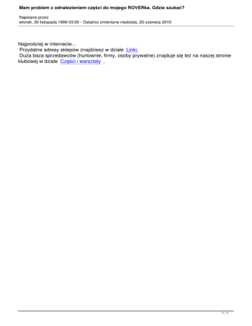 Mam problem z odnalezieniem części do mojego ROVERka. Gdzie szukać? Napisane przez wtorek, 30 listopada 1999 03:00 - Ostatnio zmieniane niedziela, 20 czerwca 2010 Najprościej w internecie... Przydatne adresy sklepów znajdziesz w dziale Linki. Duża baza sprzedawców (hurtownie, firmy, osoby prywatne) znajduje się też na naszej stronie klubowej w dziale Części i warsztaty . 1/1