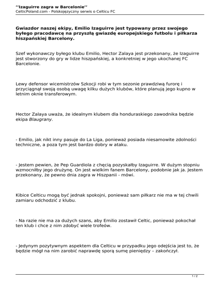 ’’Izaguirre zagra w Barcelonie’’ CelticPoland.com - Polskojęzyczny serwis o Celticu FC Gwiazdor naszej ekipy, Emilio Izaguirre jest typowany przez swojego byłego pracodawcę na przyszłą gwiazdę europejskiego futbolu i piłkarza hiszpańskiej Barcelony. Szef wykonawczy byłego klubu Emilio, Hector Zalaya jest przekonany, że Izaguirre jest stworzony do gry w lidze hiszpańskiej, a konkretniej w jego ukochanej FC Barcelonie. Lewy defensor wicemistrzów Szkocji robi w tym sezonie prawdziwą furorę i przyciągnął swoją osobą uwagę kilku dużych klubów, które planują jego kupno w letnim oknie transferowym. Hector Zalaya uważa, że idealnym klubem dla honduraskiego zawodnika będzie ekipa Blaugrany. - Emilio, jak nikt inny pasuje do La Liga, ponieważ posiada niesamowite zdolności techniczne, a poza tym jest bardzo dobry w ataku. - Jestem pewien, że Pep Guardiola z chęcią pozyskałby Izaguirre. W dużym stopniu wzmocniłby jego drużynę. On jest wielkim fanem Barcelony, podobnie jak ja. Jestem przekonany, że pewno dnia zagra w Hiszpanii - mówi. Kibice Celticu mogą być jednak spokojni, ponieważ sam piłkarz nie ma w tej chwili zamiaru odchodzić z klubu. - Na razie nie ma za dużych szans, aby Emilio zostawił Celtic, ponieważ pokochał ten klub i chce z nim zdobyć wiele trofeów. - Jedynym pozytywnym aspektem dla Celticu w przypadku jego odejścia jest to, że będzie mógł na nim zarobić naprawdę sporą sumę pieniędzy – zakończył. 1/2 ’’Izaguirre zagra w Barcelonie’’ CelticPoland.com - Polskojęzyczny serwis o Celticu FC Damian ZWIERZYŃSKI Autor: Damian Zwierzyński 2/2 Powered by TCPDF (www.tcpdf.org)