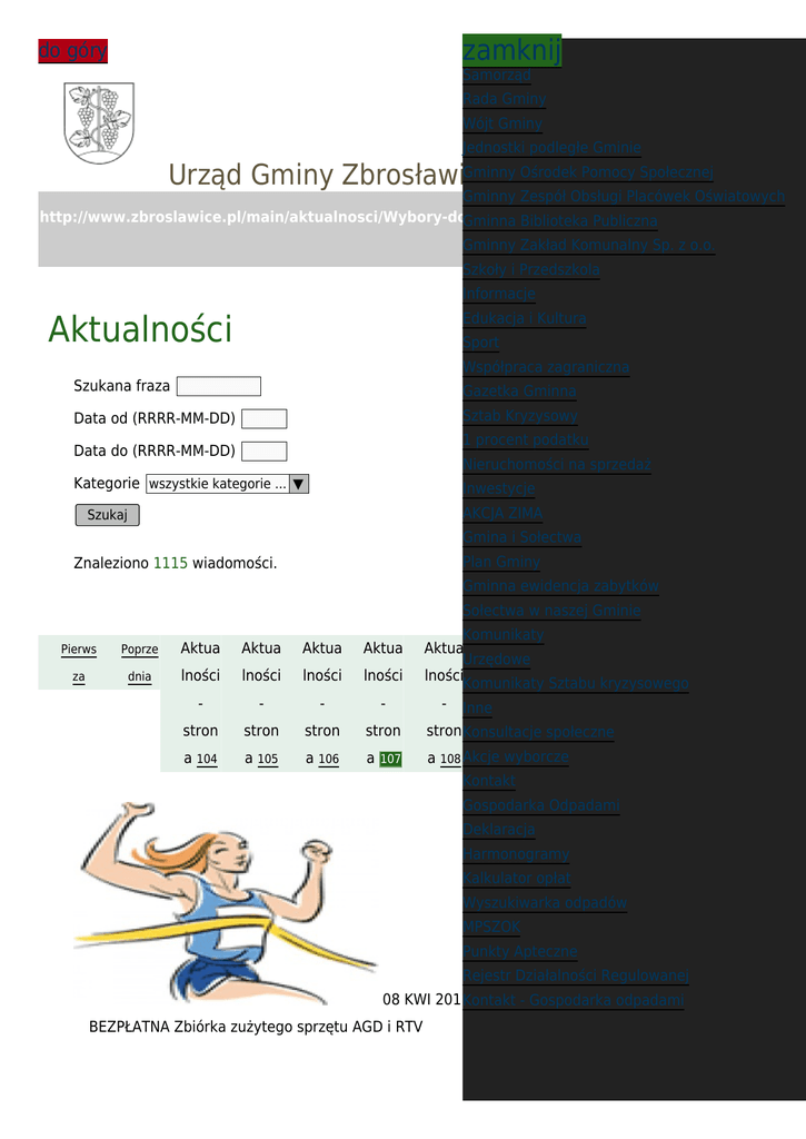 zamknij do góry Samorząd Rada Gminy Wójt Gminy Jednostki podległe Gminie Gminny Ośrodek Pomocy Społecznej Urząd Gminy Zbrosławice Gminny Zespół Obsługi Placówek Oświatowych http://www.zbroslawice.pl/main/aktualnosci/Wybory-do-Rad-Powiatowych-Slaskiej-Izby-Rolni Gminna Biblioteka Publiczna czej/i/printpdf/st:107 Gminny Zakład Komunalny Sp. z o.o. Szkoły i Przedszkola Informacje Aktualności Edukacja i Kultura Sport Współpraca zagraniczna Szukana fraza Gazetka Gminna Data od (RRRR-MM-DD) Sztab Kryzysowy 1 procent podatku Data do (RRRR-MM-DD) Nieruchomości na sprzedaż Kategorie wszystkie kategorie ... ▼ Inwestycje AKCJA ZIMA Szukaj Gmina i Sołectwa Plan Gminy Znaleziono 1115 wiadomości. Gminna ewidencja zabytków Sołectwa w naszej Gminie Komunikaty Aktua Aktua Aktua Następ Ostatni Urzędowe lności lności lności na a Komunikaty Sztabu kryzysowego - Inne - Pierws Poprze Aktua Aktua Aktua Aktua za dnia lności lności lności lności - - - - stron stron stron stron stron Konsultacje stron stron społeczne a 104 a 105 a 106 a wyborcze a 108 Akcje a 109 a 110 107 Kontakt Gospodarka Odpadami Deklaracja Harmonogramy Kalkulator opłat Wyszukiwarka odpadów MPSZOK Punkty Apteczne Rejestr Działalności Regulowanej 08 KWI 2011Kontakt - Gospodarka odpadami BEZPŁATNA Zbiórka zużytego sprzętu AGD i RTV kategoria: Inne Przypominamy, że zgodnie z Uchwałą nr XXXVIII/431/09 Rady Gminy Zbrosławice z dnia 29 grudnia 2009 r. w sprawie warunków i trybu przyznawania wyróżnień i nagród, rodzaju wyróżnień i nagród pieniężnych za osiągnięcie wysokich wyników sportowych we współzawodnictwie międzynarodowym i krajowym, ogłoszoną w Dzienniku Urzędowym Nr 41 poz. 605 z dnia 30 marca 2010 r., wnioski w sprawie wyróżnień i nagród składa się do 06 KWI 2011 kategoria: Nabór na stanowisko kierownika ref. GNiOŚ Komunikaty urzędowe Wójt Gminy Zbrosławice ogłasza nabór na stanowisko Kierownika Referatu Gospodarki Nieruchomościami i Ochrony Środowiska 05 KWI 2011 Odszkodowania za szkody łowieckie kategoria: Inne Zarząd koła łowieckiego „ŻUBR" - Księży Las informuje, że dla obwodu łowieckiego nr 123 wyznaczony został n/w punkt zgłaszania przez rolników szkód łowieckich wyrządzonych przez zwierzynę w uprawach i płodach rolnych skład komisji do szacowania szkód: Józef Kosmol Józef Pszowski zamieszkały Kamieniec ul. Tarnogórska 28, tel.32 233 78 70. W przypadku wystąpienia spornych spraw podajemy numer telefonu kontaktowego 30 MAR 2011 Informacja na temat projektu „Poza rolnictwem" kategoria: Inne Informujemy, że trwa rekrutacja do projektu „Poza Rolnictwem", współfinansowanego ze środków Unii Europejskiej w ramach Europejskiego Funduszu Społecznego. Projekt, realizowany przez Ośrodek Szkolenia Kierowców SILESIA, skierowany jest do osób, które m.in. ukończyły 23 rok życia, posiadają status rolnika lub domownika rolnika i prawo jazdy kat. B (min. 5 lat) oraz kat. C. Więcej informacji na temat projektu znajdą Państwo na 29 MAR 2011 O B W I E S Z C Z E N I E KOMISJI OKRĘGOWEJ Nr 93 kategoria: Komunikaty urzędowe w Mieście / Gminie ZBROSŁAWICE z dnia 24 marca 2011 r. Na podstawie uchwały nr 8/2011 Krajowej Rady Izb Rolniczych z dnia 1 grudnia 2010 roku w sprawie szczegółowych zasad i trybu przeprowadzania wyborów do walnych zgromadzeń izb rolniczych podaję do wiadomości osób uprawnionych, listę kandydatów w okręgu NR 93 w wyborach do Rad Powiatowych Śląskiej Izby Rolniczej zarządzonych na dzień: 3 kwietnia 2011 29 MAR 2011 wiosenny problem - wypalanie trawy kategoria: Inne Przypominamy, że zgodnie z Uchwałą nr XXXVIII/431/09 Rady Gminy Zbrosławice z dnia 29 grudnia 2009 r. w sprawie warunków i trybu przyznawania wyróżnień i nagród, rodzaju wyróżnień i nagród pieniężnych za osiągnięcie wysokich wyników sportowych we współzawodnictwie międzynarodowym i krajowym, ogłoszoną w Dzienniku Urzędowym Nr 41 poz. 605 z dnia 30 marca 2010 r., wnioski w sprawie wyróżnień i nagród składa się do 29 MAR 2011 Utworzono Punkt Interwencji Kryzysowej kategoria: Inne Gminny Ośrodek Pomocy Społecznej Zbrosławice z/s w Kamieńcu ul. Tarnogórska 34, informuje, że został uruchomiony : PUNKT INTERWENCJI KRYZYSOWEJ przy Powiatowym Centrum Pomocy Rodzinie w Tarnowskich Górach, ul. Sienkiewicza 16, pokój 104 czynny w dniach: Poniedziałek – Piątek w godz. 16.00 do 19.00 tel. 32/ 381 84 73 Punkt Interwencji Kryzysowej udziela pomocy osobom i rodzinom przeżywającym różnego 28 MAR 2011 kategoria: upływa termin skaładania wniosków Sport Przypominamy, że zgodnie z Uchwałą nr XXXVIII/431/09 Rady Gminy Zbrosławice z dnia 29 grudnia 2009 r. w sprawie warunków i trybu przyznawania wyróżnień i nagród, rodzaju wyróżnień i nagród pieniężnych za osiągnięcie wysokich wyników sportowych we współzawodnictwie międzynarodowym i krajowym, ogłoszoną w Dzienniku Urzędowym Nr 41 poz. 605 z dnia 30 marca 2010 r., wnioski w sprawie wyróżnień i nagród składa się do 23 MAR 2011 KONKURS FOT. „Szlak Zabytków Techniki Województwa Śląskiego w kategoria: obiektywie” Edukacja i Kultura Muzeum Miejskie „SZTYGARKA" w Dąbrowie Górniczej, z okazji wpisania podziemnej trasy turystycznej Kopalnia Ćwiczebna Muzeum Miejskiego „Sztygarka" na Szlak Zabytków Techniki Województwa Śląskiego organizuje konkurs fotograficzny. Tematem konkursu jest „Szlak Zabytków Techniki Województwa Śląskiego w obiektywie". Temat rozumiany jest jako subiektywne, indywidualne, osobiste spojrzenie na jeden lub kilka z dowolnych 36 obiektów, 23 MAR 2011 kategoria: Polska Prezydencja w Unii Europejskiej – WYKREUJ POWIAT Edukacja i Kultura Poseł na Sejm RP Tomasz Głogowski zaprasza do wzięcia udziału w konkursie na fotoreportaż, organizowanym pod patronatem Przewodniczącego Parlamentu Europejskiego prof. Jerzego Buzka. Hasłem przyświecającym rywalizacji jest zdanie: Polska prezydencj