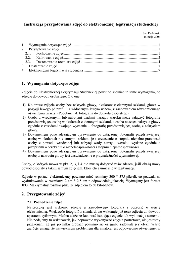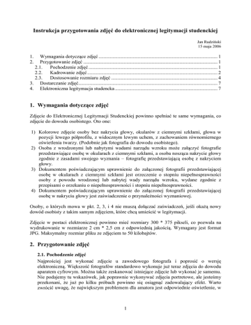 Instrukcja przygotowania zdjęć do elektronicznej legitymacji studenckiej Jan Rudziński 15 maja 2006 1. 2. Wymagania dotyczące zdjęć .............................................................................................. 1 Przygotowanie zdjęć .......................................................................................................... 1 2.1. Pochodzenie zdjęć ...................................................................................................... 1 2.2. Kadrowanie zdjęć ....................................................................................................... 2 2.3. Dostosowanie rozmiaru zdjęć .................................................................................... 4 3. Dostarczanie zdjęć.............................................................................................................. 7 4. Elektroniczna legitymacja studencka ................................................................................. 7 1. Wymagania dotyczące zdjęć Zdjęcie do Elektronicznej Legitymacji Studenckiej powinno spełniać te same wymagania, co zdjęcie do dowodu osobistego. Oto one: 1) Kolorowe zdjęcie osoby bez nakrycia głowy, okularów z ciemnymi szkłami, głowa w pozycji lewego półprofilu, z widocznym lewym uchem, z zachowaniem równomiernego oświetlenia twarzy. (Podobnie jak fotografia do dowodu osobistego). 2) Osoba z wrodzonymi lub nabytymi wadami narządu wzroku moŜe załączyć fotografie przedstawiające osobę w okularach z ciemnymi szkłami, a osoba nosząca nakrycie głowy zgodnie z zasadami swojego wyznania – fotografię przedstawiającą osobę z nakryciem głowy. 3) Dokumentem poświadczającym uprawnienie do załączonej fotografii przedstawiającej osobę w okularach z ciemnymi szkłami jest orzeczenie o stopniu niepełnosprawności osoby z powodu wrodzonej lub nabytej wady narządu wzroku, wydane zgodnie z przepisami o orzekaniu o niepełnosprawności i stopniu niepełnosprawności. 4) Dokumentem poświadczającym uprawnienie do załączonej fotografii przedstawiającej osobę w nakryciu głowy jest zaświadczenie o przynaleŜności wyznaniowej. Osoby, o których mowa w pkt. 2, 3, i 4 nie muszą dołączać zaświadczeń, jeśli okaŜą nowy dowód osobisty z takim samym zdjęciem, które chcą umieścić w legitymacji. Zdjęcie w postaci elektronicznej powinno mieć rozmiary 300 * 375 pikseli, co pozwala na wydrukowanie w rozmiarze 2 cm * 2,5 cm z odpowiednią jakością. Wymagany jest format JPG. Maksymalny rozmiar pliku ze zdjęciem to 50 kilobajtów. 2. Przygotowanie zdjęć 2.1. Pochodzenie zdjęć Najprościej jest wykonać zdjęcie u zawodowego fotografa i poprosić o wersję elektroniczną. Większość fotografów standardowo wykonuje juŜ teraz zdjęcia do dowodu aparatem cyfrowym. MoŜna takŜe zeskanować istniejące zdjęcie lub wykonać je samemu. Nie podajemy tu wskazówek, jak poprawnie wykonywać zdjęcia portretowe, ale jesteśmy przekonani, Ŝe juŜ po kilku próbach powinno się osiągnąć zadowalający efekt. Warto zwrócić uwagę, Ŝe największym problemem dla amatora jest odpowiednie oświetlenie, w 1 szczególności nie zalecamy, aby jedynym źródłem światła była lampa błyskowa wbudowana w aparat. Rozmiary w pikselach zdjęcia w pliku winny być na tyle duŜe, Ŝeby po wycięciu fragmentu odpowiadającego wymaganiom z p. 1 pozostało odpowiednio wiele pikseli. 2.2. Kadrowanie zdjęć Istnieje bardzo wiele programów graficznych, zarówno darmowych jak i płatnych, które umoŜliwiają dostosowanie obrazu do wymaganych rozmiarów. Niestety programy dostarczane w komplecie z systemem Windows nie nadają się do tego celu. W dalszej części opisujemy wykonywanie operacji na zdjęciach przy pomocy wybranych, wygodnych w uŜyciu darmowych programów graficznych. Programy proponowane w tym tekście stosowane są przez bardzo wielu uŜytkowników, jednak Uniwersytet nie moŜe zagwarantować ich poprawności ani braku wirusów. Do kadrowania zaleca się uŜycia programu JPEGCrops, który moŜna pobrać ze strony http://ekot.dk/programmer/JPEGCrops/. Wersja instalacyjna dla systemu Windows znajduje się pod adresem: http://ekot.dk/programmer/JPEGCrops/download/JPEGCrops0.7.1b.exe. W programie tym moŜna wybrać język polski w menu. W prawym dolnym rogu okna programu (Rysunek 1) znajduje się ścieŜka do podkatalogu, w którym program umieści obraz po przycięciu. Domyślnie wybierany jest podkatalog Cropped w katalogu Moje dokumenty bieŜącego uŜytkownika. Katalog ten moŜna zmienić naciskając przycisk ... z prawej strony okienka z nazwą podkatalogu. Rysunek 1 Okno startowe programu JPEGCrops Po naciśnięciu przycisku Dodaj obrazy pojawi się standardowe okno wyboru pliku (Rysunek 2), w którym moŜna wybrać zdjęcie przeznaczone do kadrowania. 2 Rysunek 2 Wybór obrazka do obróbki Po załadowaniu obrazu (Rysunek 3) naleŜy wybrać parametry kadrowania. Aby kadrować w proporcji 4 na 5 najwygodniej jest wybrać z listy rozwijalnej pozycję 4” * 5” i zaznaczyć okienko Odbij format. Wyraźnie oznaczona ramka na rysunku pokazuje fragment, który ma zostać wycięty z całości. Ramkę moŜna przesuwać przy pomocy myszki. MoŜna teŜ zmieniać rozmiary (zachowując proporcje) ramki chwytając myszką za wyraźnie widoczne punkty na brzegach ramki. Rysunek 3 Ustawienie parametrów kadrowania W trakcie kadrowania naleŜy zwracać uwagę na rozmiary w pikselach wycinanego fragmentu. Jeśli fragment z odpowiednią treścią będzie miał rozmiary mniejsze niŜ wymagane (300 * 375 pikseli), to oznacza, Ŝe obrabiane zdjęcie ma za małą rozdzielczość i nie nadaje się do dalszej obróbki. 3 Rozmiar w pikselach wycinanego fragmentu oznaczonego ramką jest widoczny pod obrazem w lewym dolnym rogu. Po wybraniu zadowalającego fragmentu z całości zdjęcia (Rysunek 4) naleŜy to zdjęcie zapisać, naciskając przycisk Przytnij wszystko. Wycięty fragment zdj