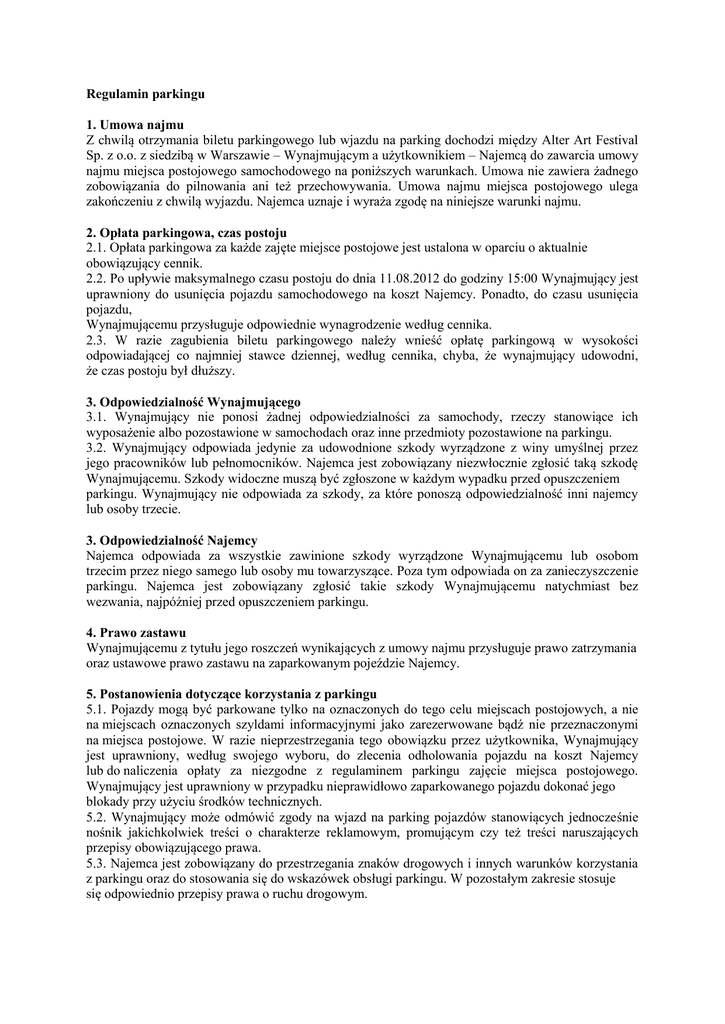 Regulamin parkingu 1. Umowa najmu Z chwilą otrzymania biletu parkingowego lub wjazdu na parking dochodzi między Alter Art Festival Sp. z o.o. z siedzibą w Warszawie – Wynajmującym a użytkownikiem – Najemcą do zawarcia umowy najmu miejsca postojowego samochodowego na poniższych warunkach. Umowa nie zawiera żadnego zobowiązania do pilnowania ani też przechowywania. Umowa najmu miejsca postojowego ulega zakończeniu z chwilą wyjazdu. Najemca uznaje i wyraża zgodę na niniejsze warunki najmu. 2. Opłata parkingowa, czas postoju 2.1. Opłata parkingowa za każde zajęte miejsce postojowe jest ustalona w oparciu o aktualnie obowiązujący cennik. 2.2. Po upływie maksymalnego czasu postoju do dnia 11.08.2012 do godziny 15:00 Wynajmujący jest uprawniony do usunięcia pojazdu samochodowego na koszt Najemcy. Ponadto, do czasu usunięcia pojazdu, Wynajmującemu przysługuje odpowiednie wynagrodzenie według cennika. 2.3. W razie zagubienia biletu parkingowego należy wnieść opłatę parkingową w wysokości odpowiadającej co najmniej stawce dziennej, według cennika, chyba, że wynajmujący udowodni, że czas postoju był dłuższy. 3. Odpowiedzialność Wynajmującego 3.1. Wynajmujący nie ponosi żadnej odpowiedzialności za samochody, rzeczy stanowiące ich wyposażenie albo pozostawione w samochodach oraz inne przedmioty pozostawione na parkingu. 3.2. Wynajmujący odpowiada jedynie za udowodnione szkody wyrządzone z winy umyślnej przez jego pracowników lub pełnomocników. Najemca jest zobowiązany niezwłocznie zgłosić taką szkodę Wynajmującemu. Szkody widoczne muszą być zgłoszone w każdym wypadku przed opuszczeniem parkingu. Wynajmujący nie odpowiada za szkody, za które ponoszą odpowiedzialność inni najemcy lub osoby trzecie. 3. Odpowiedzialność Najemcy Najemca odpowiada za wszystkie zawinione szkody wyrządzone Wynajmującemu lub osobom trzecim przez niego samego lub osoby mu towarzyszące. Poza tym odpowiada on za zanieczyszczenie parkingu. Najemca jest zobowiązany zgłosić takie szkody Wynajmującemu natychmiast bez wezwania, najpóźniej przed opuszczeniem parkingu. 4. Prawo zastawu Wynajmującemu z tytułu jego roszczeń wynikających z umowy najmu przysługuje prawo zatrzymania oraz ustawowe prawo zastawu na zaparkowanym pojeździe Najemcy. 5. Postanowienia dotyczące korzystania z parkingu 5.1. Pojazdy mogą być parkowane tylko na oznaczonych do tego celu miejscach postojowych, a nie na miejscach oznaczonych szyldami informacyjnymi jako zarezerwowane bądź nie przeznaczonymi na miejsca postojowe. W razie nieprzestrzegania tego obowiązku przez użytkownika, Wynajmujący jest uprawniony, według swojego wyboru, do zlecenia odholowania pojazdu na koszt Najemcy lub do naliczenia opłaty za niezgodne z regulaminem parkingu zajęcie miejsca postojowego. Wynajmujący jest uprawniony w przypadku nieprawidłowo zaparkowanego pojazdu dokonać jego blokady przy użyciu środków technicznych. 5.2. Wynajmujący może odmówić zgody na wjazd na parking pojazdów stanowiących jednocześnie nośnik jakichkolwiek treści o charakterze reklamowym, promującym czy też treści naruszających przepisy obowiązującego prawa. 5.3. Najemca jest zobowiązany do przestrzegania znaków drogowych i innych warunków korzystania z parkingu oraz do stosowania się do wskazówek obsługi parkingu. W pozostałym zakresie stosuje się odpowiednio przepisy prawa o ruchu drogowym. 5.4. Na terenie parkingu zakazane jest prowadzenie jakiejkolwiek działalności reklamowej, marketingowej, promocyjnej nie uzgodnionej uprzednio z Wynajmującym. Osoby naruszające ten zakaz oraz ich pojazdy będą usunięte z terenu parkingu. 5.5. Wynajmujący ustanawia zakaz wjazdu na parking pojazdów z przyczepami kempingowymi i pojazdów kempingowych. 6. Przepisy bezpieczeństwa 6.1. Na parkingu pojazdy mogą poruszać się tylko z prędkością do 10 km/h. 6.2. Na parkingu zabronione jest palenie tytoniu, używanie ognia oraz niepotrzebne włączanie i przeprowadzanie prób silników. 6.3. Umyślne parkowanie pojazdów z nieszczelnym zbiornikiem paliwa lub silnikiem jest zabronione. 6.4. Przebywanie na parkingu jest dozwolone jedynie w związku z parkowaniem. 6.5. Na miejscach postojowych i jezdniach parkingu oraz na wjeździe i wyjeździe zabronione jest naprawianie pojazdów, oczekiwanie lub sprzątanie wnętrza pojazdu, jak również spuszczanie wody chłodzącej, paliwa i oleju. 6.6. Mycie pojazdów jest niedozwolone. .