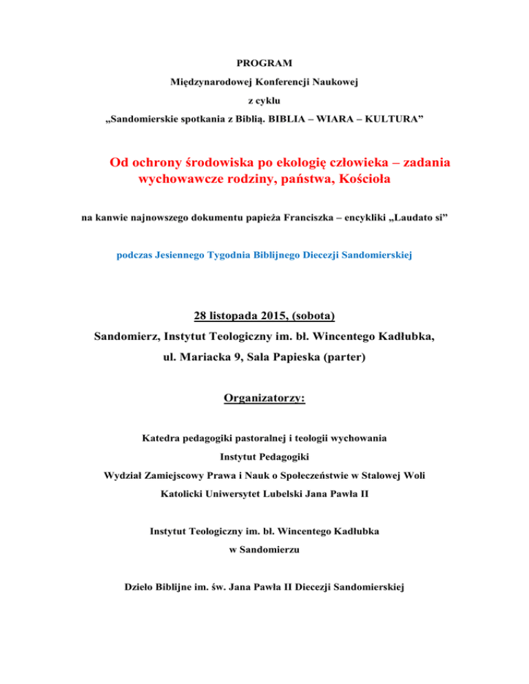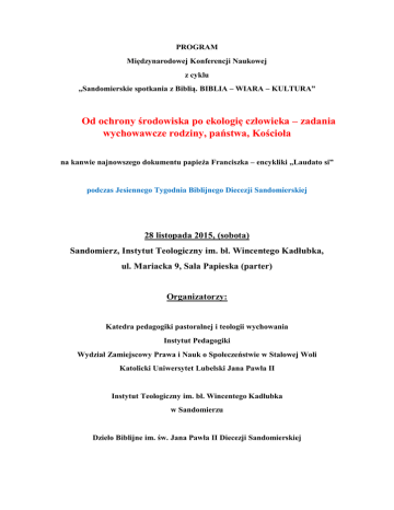 PROGRAM Międzynarodowej Konferencji Naukowej z cyklu „Sandomierskie spotkania z Biblią. BIBLIA – WIARA – KULTURA” Od ochrony środowiska po ekologię człowieka – zadania wychowawcze rodziny, państwa, Kościoła na kanwie najnowszego dokumentu papieża Franciszka – encykliki „Laudato si” podczas Jesiennego Tygodnia Biblijnego Diecezji Sandomierskiej 28 listopada 2015, (sobota) Sandomierz, Instytut Teologiczny im. bł. Wincentego Kadłubka, ul. Mariacka 9, Sala Papieska (parter) Organizatorzy: Katedra pedagogiki pastoralnej i teologii wychowania Instytut Pedagogiki Wydział Zamiejscowy Prawa i Nauk o Społeczeństwie w Stalowej Woli Katolicki Uniwersytet Lubelski Jana Pawła II Instytut Teologiczny im. bł. Wincentego Kadłubka w Sandomierzu Dzieło Biblijne im. św. Jana Pawła II Diecezji Sandomierskiej Dzieło Biblijne im. św. Jana Pawła II Diecezji Radomskiej Polskie Towarzystwo Teologiczne, oddział w Sandomierzu Instytut Teologiczny im. św. Józefa Bilczewskiego we Lwowie (Ukraina) PATRONAT NAUKOWY: Redakcja kwartalnika naukowego WZPiNoS KUL „Społeczeństwo i Rodzina” (Society&Family) PROGRAM: Godz. 10.30 Rejestracja uczestników Godz. 11.00 Powitanie uczestników ks. prof. nadzw. dr hab. Roman B. SIEROŃ, dyrektor Instytutu Teologicznego im. bł. Wincentego Kadłubka w Sandomierzu, kierownik katedry PPiTW WZPiNoS KUL w Stalowej Woli, delegat Biskupa Sandomierskiego ds. Dzieła Biblijnego I. Godz. 11.15-11.45 Ks. prof. zw. dr hab. Tomasz B. JELONEK (Kraków, Uniwersytet Papieski Jana Pawła II) Biblijne podstawy ochrony środowiska II. Godz. 11.45-12.15 Ks. prof. zw. dr hab. Pavol DANCAK (Preszów, Słowacja, Prešovská univerzita v Prešove) Oikos: wychowanie i odpowiedzialność III. Godz. 12.15-12.45 Prof. zw. dr hab. Lillya MORSKA (Tarnopol, Ukraina, Państwowy Uniwersytet Pedagogiczny im. W. Hnatiuka, KUL) Ochrona dziecka przed wpływem zachowań agresywnych: zadania społeczeństwa IV. Godz. 12.45-13.15 Prof. dr hab. Jewgenia ŚPIVAKOVSKA (Chersoń, Ukraina, Chersoński Uniwersytet Państwowy Херсонський державний університет ) Środowisko polisubiektywne – warunki sukcesu edukacji akademickiej V. Godz. 13.15-13.45 Ks. prof. nadzw. dr hab. Paweł PRŰFER (PWSZ im. Jakuba z Paradyża w Gorzowie Wielkopolskim) Poprzez ochronę środowiska metamorfoza społeczeństwa – marzenia i rzeczywistość w socjologicznym paradygmacie VI. Godz. 13.45-14.15 Ks. dr hab. Bogdan ZBROJA (Kraków, Uniwersytet Papieski Jana Pawła II) „Ekologiczne” akcenty znaku rozmnożenia chleba (J 6, 1-15) Godz. 14.15 – 15.00 przerwa obiadowa Sekcja równoległa – Panel doktorantów (godz. 15.00, sala nr 17, I piętro) Obrady w sekcji moderuje: prof. dr hab. Lillya Morska 1. mgr Justyna Anna GUTKA (doktorantka KUL) Encyklika „Laudato si” wyznacznikiem wychowania współczesnego człowieka do szacunku dla wspólnego domu 2. mgr Renata MATUSIAK (doktorantka KUL) Pedagogika przyrody jako element nowoczesnych metod pracy z dziećmi i młodzieżą 3. mgr Karolina SIGDA (doktorantka KUL) Kształtowanie świadomości ekologicznej w wieku przedszkolnym 4. lic. Marta PIETRYCHA (studentka KUL) Wychowanie ekologiczne w rodzinie 5. mgr Mateusz SZAST (doktorant KUL, przewodniczący Koła Naukowego Studentów Socjologii „Societas” WZPiNoS KUL w Stalowej Woli) Wiara – ekologia – kapitał społeczny: w poszukiwaniu związków i zależności 6. mgr Orysya USKA (Lwów, doktorantka KUL) Екологія плідності людської пари в світлі енцикліки Папи Франциска „Laudato si”. Ekologia płodności pary ludzkej w świetle encykliki papieża Franciszka „Laudato si”. 7. mgr Sergii BUKIN (Lwów, doktorant KUL) ,,Екологія людська” як фундамент екології довкілля. „Ekologia ludzka” fundamentem ekologii środowiska 8. mgr Ivan HADO (Lwów, doktorant KUL) Еклезіальна роль сім’ї в формуванні екологічної відповідальності людини. Eklezjalna rola rodziny w kształtowaniu odpowiedzialności za środowisko naturalne. 9. mgr Nataliya HADO (Lwów, doktorantka KUL) Тема: Енцикліка "Laudato si" на сторінках інтернет-медій Польщі, Італії та України (порівняльний аспект) Encyklika „Laudato si” na stronach mediów internetowych Polski, Włoch i Ukrainy (aspekt porównawczy) ……………………………………………………………………………………………… Godz. 15.00-15.30 (po przerwie Sala Papieska) VII. Godz. 15.00-15.30 Dr inż. Anna M. WAJDA (Kraków, Uniwersytet Papieski Jana Pawła II) Biblia o potrzebie mądrego zarządzania ziemią VIII. Godz. 15.30-16.00 Ks. dr Jacek ULIASZ (Instytut Teologiczny im. św. Józefa Bilczewskiego we Lwowie, Ukraina) Godność człowieka, jako podstawowa przesłanka za obroną ludzkiego życia poczętego w świetle „Laudato si” papieża Franciszka IX. Godz. 16.00-16.30 Ks. dr hab. Roman B. SIEROŃ, prof. KUL (WZPiNoS KUL w Stalowej Woli, Instytut Teologiczny w Sandomierzu, Dzieło Biblijne Diecezji Sandomierskiej) Ekologiczne przesłanie Biblii – ku wychowaniu ekoetycznemu X. Godz. 16.30-17.00 Ks. dr Jacek KUCHARSKI (KUL – WSD Radom, Dzieło Biblijne Diecezji Radomskiej) Człowiek w relacji do stworzonego świata. Sapiencjalny wydźwięk opisów stworzenia według encykliki „Laudato si” Przerwa kawowa 17.00-17.15 XI. Godz. 17.15-17.30 Dr Leszek WIANOWSKI (Uniwersytet TechnologicznoHumanistyczny w Radomiu) Relatywistyczny wpływ na ekologiczną antropologię w świetle encykliki „Laudato si” XII. Godz. 17.30-17.45 Dr Mirosław REWERA (WZPiNoS KUL) Postawy proekologiczne Polaków XIII. Godz. 17.45-18.00 Dr Bogdan WIĘCKIEWICZ (WZPiNoS KUL) Kształtowanie kultury ekologicznej w rodzinie i szkole XIV. Godz. 18.00-18.15 Ks. dr Bogdan KREMPA (WZPiNoS K