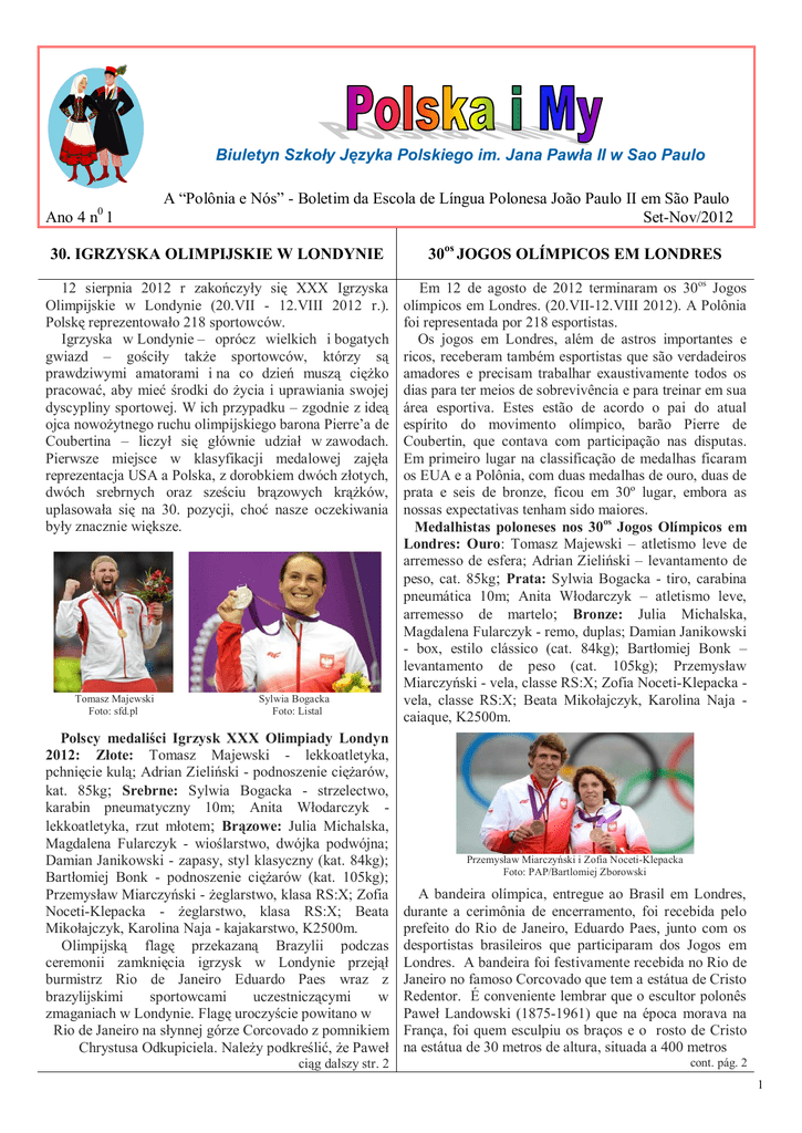 Biuletyn Szkoły Języka Polskiego im. Jana Pawła II w Sao Paulo 0 Ano 4 n 1 A “Polônia e Nós” - Boletim da Escola de Língua Polonesa João Paulo II em São Paulo Set-Nov/2012 30. IGRZYSKA OLIMPIJSKIE W LONDYNIE 30os JOGOS OLÍMPICOS EM LONDRES 12 sierpnia 2012 r zakończyły się XXX Igrzyska Olimpijskie w Londynie (20.VII - 12.VIII 2012 r.). Polskę reprezentowało 218 sportowców. Igrzyska w Londynie – oprócz wielkich i bogatych gwiazd – gościły także sportowców, którzy są prawdziwymi amatorami i na co dzień muszą ciężko pracować, aby mieć środki do życia i uprawiania swojej dyscypliny sportowej. W ich przypadku – zgodnie z ideą ojca nowożytnego ruchu olimpijskiego barona Pierre’a de Coubertina – liczył się głównie udział w zawodach. Pierwsze miejsce w klasyfikacji medalowej zajęła reprezentacja USA a Polska, z dorobkiem dwóch złotych, dwóch srebrnych oraz sześciu brązowych krążków, uplasowała się na 30. pozycji, choć nasze oczekiwania były znacznie większe. Em 12 de agosto de 2012 terminaram os 30os Jogos olímpicos em Londres. (20.VII-12.VIII 2012). A Polônia foi representada por 218 esportistas. Os jogos em Londres, além de astros importantes e ricos, receberam também esportistas que são verdadeiros amadores e precisam trabalhar exaustivamente todos os dias para ter meios de sobrevivência e para treinar em sua área esportiva. Estes estão de acordo o pai do atual espírito do movimento olímpico, barão Pierre de Coubertin, que contava com participação nas disputas. Em primeiro lugar na classificação de medalhas ficaram os EUA e a Polônia, com duas medalhas de ouro, duas de prata e seis de bronze, ficou em 30º lugar, embora as nossas expectativas tenham sido maiores. Medalhistas poloneses nos 30os Jogos Olímpicos em Londres: Ouro: Tomasz Majewski – atletismo leve de arremesso de esfera; Adrian Zieliński – levantamento de peso, cat. 85kg; Prata: Sylwia Bogacka - tiro, carabina pneumática 10m; Anita Włodarczyk – atletismo leve, arremesso de martelo; Bronze: Julia Michalska, Magdalena Fularczyk - remo, duplas; Damian Janikowski - box, estilo clássico (cat. 84kg); Bartłomiej Bonk – levantamento de peso (cat. 105kg); Przemysław Miarczyński - vela, classe RS:X; Zofia Noceti-Klepacka vela, classe RS:X; Beata Mikołajczyk, Karolina Naja caiaque, K2500m. Tomasz Majewski Foto: sfd.pl Sylwia Bogacka Foto: Listal Polscy medaliści Igrzysk XXX Olimpiady Londyn 2012: Złote: Tomasz Majewski - lekkoatletyka, pchnięcie kulą; Adrian Zieliński - podnoszenie ciężarów, kat. 85kg; Srebrne: Sylwia Bogacka - strzelectwo, karabin pneumatyczny 10m; Anita Włodarczyk lekkoatletyka, rzut młotem; Brązowe: Julia Michalska, Magdalena Fularczyk - wioślarstwo, dwójka podwójna; Damian Janikowski - zapasy, styl klasyczny (kat. 84kg); Bartłomiej Bonk - podnoszenie ciężarów (kat. 105kg); Przemysław Miarczyński - żeglarstwo, klasa RS:X; Zofia Noceti-Klepacka - żeglarstwo, klasa RS:X; Beata Mikołajczyk, Karolina Naja - kajakarstwo, K2500m. Olimpijską flagę przekazaną Brazylii podczas ceremonii zamknięcia igrzysk w Londynie przejął burmistrz Rio de Janeiro Eduardo Paes wraz z brazylijskimi sportowcami uczestniczącymi w zmaganiach w Londynie. Flagę uroczyście powitano w Rio de Janeiro na słynnej górze Corcovado z pomnikiem Chrystusa Odkupiciela. Należy podkreślić, że Paweł A bandeira olímpica, entregue ao Brasil em Londres, durante a cerimônia de encerramento, foi recebida pelo prefeito do Rio de Janeiro, Eduardo Paes, junto com os desportistas brasileiros que participaram dos Jogos em Londres. A bandeira foi festivamente recebida no Rio de Janeiro no famoso Corcovado que tem a estátua de Cristo Redentor. É conveniente lembrar que o escultor polonês Paweł Landowski (1875-1961) que na época morava na França, foi quem esculpiu os braços e o rosto de Cristo na estátua de 30 metros de altura, situada a 400 metros ciąg dalszy str. 2 cont. pág. 2 Przemysław Miarczyński i Zofia Noceti-Klepacka Foto: PAP/Bartlomiej Zborowski 1 Landowski (1875-1961) polski rzeźbiarz swego czasu acima do nível do mar. mieszkający we Francji, był wykonawcą rąk i twarzy A cerimonia oficial postaci Chrystusa - pomniku mającym 30 metrów ocorreu sob a estátua de wysokości, postawionym 400m nad morzem. Cristo que, em 2007, foi Oficjalna ceremonia powitania flagi odbyła się pod declarada uma das novas pomnikiem Chrystusa, który w lipcu 2007 został sete maravilhas do ogłoszony jednym z siedmiu nowych cudów świata. To Foto: opoliglota.com.br mundo. Este lugar é o miejsce jest sercem parku naturalnego Tijuca, stąd coração do parque da Tijuca, que possui uma vista linda roztacza się piękny widok na całe miasto Rio de Janeiro. para toda a cidade do Rio de Janeiro. Igrzyska w 2016 roku będą pierwszymi w historii Em 2016, os jogos serão os primeiros na história a odbywającymi się w Ameryce Południowej. ocorrer na América do Sul. Redakcja A Redação Da série “História da literatura da Polônia” O ILUMINISMO Z cyklu “Dzieje literatury polskiej” OŚWIECENIE Oświecenie to, po Baroku kolejna epoka w dziejach kultury europejskiej. Wiek XVIII jest wiekiem nie tylko rozkwitu literatury, czy też filozofii. Jest on także okresem rozkwitu nowoczesnej myśli politycznej i naukowej. Nic więc dziwnego, że Oświecenie nazywane jest epoką filozofów i uczonych. Jest czasem wiary w potęgę ludzkiej myśli i siłę rozumu. Wszystko wskazuje na to, że nazwa tego okresu pochodzi od używanego w Niemczech „wieku oświeconego”, w Polsce też często określanego jako „czasy stanisławowskie”. Wielką rolę w powstaniu tych nowych, oświeceniowych idei odegrała nauka. Zaś najwyższą instancją i kategorią filozoficzną było pojęcie rozumu. To właśnie rozum (w jęz. łacińskim ratio) jako główne narzędzie poznania świata dał korzenie i podstawy nowej filozofii zwanej racjonalizmem. 