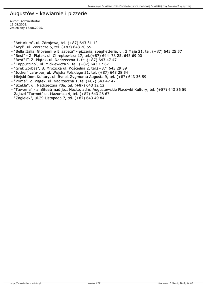 Rowerem po Suwalszczyźnie. Portal o turystyce rowerowej Suwalskiej Izby Rolniczo-Turystycznej Augustów - kawiarnie i pizzerie Autor: Administrator 16.08.2005. Zmieniony 16.08.2005. - "Anturium", ul. Zdrojowa, tel. (+87) 643 31 12 "Azyl", ul. Zarzecze 5, tel. (+87) 643 20 55 "Bella Italia, Giovanni & Elisabeta" - pizzeria, spaghetteria, ul. 3 Maja 21, tel. (+87) 643 25 57 "Best" - Z. Piątek, ul. Chreptowicza 17, tel.(+87) 644 78 25, 643 69 00 "Best" Z. Piątek, ul. Nadrzeczna 1, tel.(+87) 643 47 47 "Cappuccino", ul. Mickiewicza 9, tel. (+87) 643 17 67 "Grek Zorbas", B. Mrozicka ul. Kościelna 2, tel.(+87) 643 29 39 "Jocker" cafe-bar, ul. Wojska Polskiego 51, tel. (+87) 643 28 54 Miejski Dom Kultury, ul. Rynek Zygmunta Augusta 9, tel. (+87) 643 36 59 "Prima", Z. Piątek, ul. Nadrzeczna 1, tel.(+87) 643 47 47 "Szekla", ul. Nadrzeczna 70a, tel. (+87) 643 12 12 "Tawerna" - amfiteatr nad jez. Necko, adm. Augustowskie Placówki Kultury, tel. (+87) 643 36 59 Zajazd "Turmot" ul. Mazurska 4, tel. (+87) 643 28 67 "Żagielek", ul.29 Listopada 7, tel. (+87) 643 49 84 http://suwalki-bicycle.info.pl Kreator PDF Utworzono 3 March, 2017, 14:06