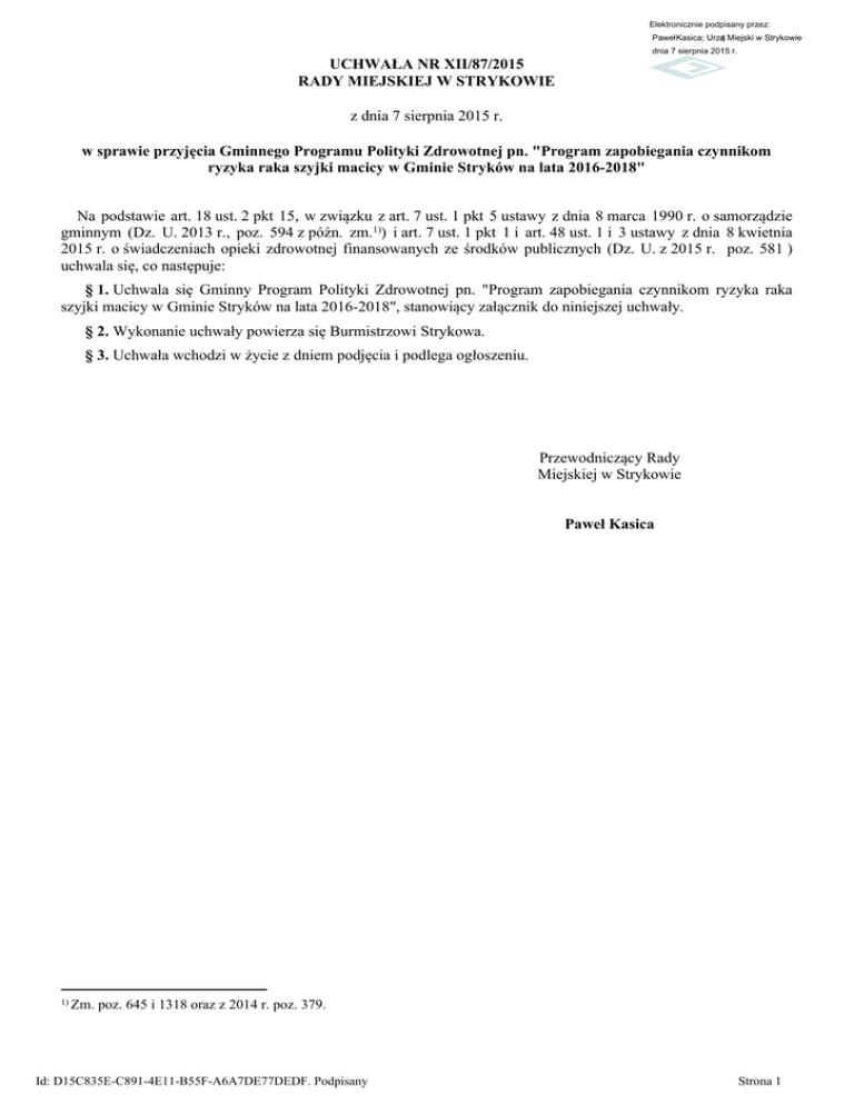 Elektronicznie podpisany przez: Paweł Kasica; Urząd Miejski w Strykowie dnia 7 sierpnia 2015 r. UCHWAŁA NR XII/87/2015 RADY MIEJSKIEJ W STRYKOWIE z dnia 7 sierpnia 2015 r. w sprawie przyjęcia Gminnego Programu Polityki Zdrowotnej pn. "Program zapobiegania czynnikom ryzyka raka szyjki macicy w Gminie Stryków na lata 2016-2018" Na podstawie art. 18 ust. 2 pkt 15, w związku z art. 7 ust. 1 pkt 5 ustawy z dnia 8 marca 1990 r. o samorządzie gminnym (Dz. U. 2013 r., poz. 594 z późn. zm.1)) i art. 7 ust. 1 pkt 1 i art. 48 ust. 1 i 3 ustawy z dnia 8 kwietnia 2015 r. o świadczeniach opieki zdrowotnej finansowanych ze środków publicznych (Dz. U. z 2015 r. poz. 581 ) uchwala się, co następuje: § 1. Uchwala się Gminny Program Polityki Zdrowotnej pn. "Program zapobiegania czynnikom ryzyka raka szyjki macicy w Gminie Stryków na lata 2016-2018", stanowiący załącznik do niniejszej uchwały. § 2. Wykonanie uchwały powierza się Burmistrzowi Strykowa. § 3. Uchwała wchodzi w życie z dniem podjęcia i podlega ogłoszeniu. Przewodniczący Rady Miejskiej w Strykowie Paweł Kasica 1) Zm. poz. 645 i 1318 oraz z 2014 r. poz. 379. Id: D15C835E-C891-4E11-B55F-A6A7DE77DEDF. Podpisany Strona 1 Załącznik do Uchwały Nr XII/87/2015 Rady Miejskiej w Strykowie z dnia 7 sierpnia 2015 r. Gminny Program Polityki Zdrowotnej pn. "Program zapobiegania czynnikom ryzyka raka szyjki macicy w Gminie Stryków na lata 2016-2018" 1. Opis problemu zdrowotnego Zaspakajanie zbiorowych potrzeb mieszkańców w zakresie ochrony zdrowia jest jednym z najważniejszych zadań gminy, wynikającym z ustawy z dnia 8 marca 1990 r. o samorządzie gminnym (Dz. U. z 2013 r., poz. 594 ze zm.). Do zadań własnych gminy w zakresie zapewnienia równego dostępu do świadczeń opieki zdrowotnej należy opracowanie, realizacja i ocena efektów programów polityki zdrowotnej, wynikających z rozpoznanych potrzeb zdrowotnych, stosownie do art. 7 ust. 1 pkt 1 i art. 48 ust. 1 ustawy z dnia 27 sierpnia 2004 r. o świadczeniach opieki zdrowotnej finansowanych ze środków publicznych (Dz. U. z 2008 r. Nr 164, poz. 1027 ze zm.). Mając powyższe na uwadze w roku 2013 Gmina Stryków przystąpiła do realizacji Gminnego Programu Zdrowotnego pn. „Program zapobiegania czynnikom ryzyka raka szyjki macicy w Gminie Stryków na lata 2013-2015", przyjętego uchwałą Nr XL/307/2013 Rady Miejskiej w Strykowie z dnia 29 sierpnia 2013 r. Gminny Program Polityki Zdrowotnej pn. ”Program zapobiegania czynnikom ryzyka raka szyjki macicy w Gminie Stryków na lata 2016-2018" stanowi kontynuację programu realizowanego w latach 2013-2015. Zapobieganie chorobom cywilizacyjnym możliwe jest poprzez stosowanie odpowiedniej profilaktyki, a także poprzez podejmowanie działań i środków zmierzających do wykrycia ich we wczesnych stadiach, dających szansę na szybkie wyleczenie. Do wiodących przyczyn śmierci na świecie należą nowotwory, a liczba ich ciągle rośnie. Aż 40% zachorowań na raka w skali roku można by uniknąć, gdyby ludzie chronili się przed zakażeniem niektórymi wirusami, które mogą doprowadzić do wystąpienia choroby nowotworowej i zmienili styl życia. Raka szyjki macicy i wszelkie zmiany poprzedzające rozwój nowotworu można wykryć za pomocą badania profilaktycznego jakim jest cytologia. Dzięki temu badaniu można zdiagnozować stadia przednowotworowe oraz raka szyjki macicy we wczesnej, możliwej do wyleczenia postaci. Jednak w naszym kraju, zaniedbując cytologię, około 70% kobiet trafia do lekarza kiedy choroba jest już zaawansowana. Rozpoznawalnym czynnikiem sprawczym raka szyjki macicy są onkogenne wirusy brodawczaka ludzkiego (HPV). Zakażenia genitalnymi typami tych wirusów wywołują różnego typu zmiany przednowotworowe i nowotworowe na błonach śluzowych narządów płciowych i innych okolic ciała. Wirus przenoszony jest drogą płciową. Ryzyko zakażenia genitalnymi typami HPV w ciągu całego życia u osób aktywnych seksualnie wynosi około 50%, a zakażenia te są najczęstsze u młodych kobiet. Największy związek z rakiem szyjki macicy wykazuje HPV 16 oraz HPV 18, które są odpowiedzialne za ponad 70% wszystkich przypadków tego raka i większość przypadków śródnabłonkowych zmian przednowotworowych. Profilaktyka jest ważna, gdyż pozwala uniknąć znacznie droższego procesu leczenia zaawansowanych stadiów choroby. Elementem działań profilaktycznych, zapobiegających samemu zakażeniu jest szczepienie dziewcząt przeciwko wirusowi brodawczaka ludzkiego (HPV). Szczepionka czterowalentna jest stosowana przeciw czterem najczęściej występującym typom ww. wirusa, w tym dwóm z grupy onkogennej (HPV 16 i HPV 18) oraz dwóm typom tzw. niskiego ryzyka (HPV 6 i HPV 11). Szczepienia nastolatek przeciwko wirusowi HPV jako skuteczną profilaktykę raka szyjki macicy rekomendują m.in.: Polskie Towarzystwo Ginekologiczne, Polskie Towarzystwo Profilaktyki Zakażeń HPV, a także Światowa Organizacja Zdrowia. Możliwość realizacji szczepień przeciw HPV w Polsce nie została jednak włączona do obowiązkowej części Programu Szczepień Ochronnych finansowanych ze środków budżetu państwa. Prowadzone od kilku lat badania wskazują na ograniczenie liczby zakażeń wirusem HPV obserwowane po zastosowaniu szczepionki. Badania kliniczne dowodzą niemal 100% skuteczność szczepień przeciwko HPV. Najbardziej skuteczne są one u osób, które nie zetknęły się jeszcze z wirusem. Polskie Towarzystwo Ginekologiczne szacuje, że szczepienia nastolatek i młodych kobiet przeciwko wirusowi HPV spowodują zmniejszenie ogólnej liczby zachorowań na raka szyjki macicy od 76% do 96% w ciągu 15-20 lat od rozpoczęcia szczepień. Id: D15C835E-C891-4E11-B55F-A6A7DE77DEDF. Podpisany Strona 1 2. Cel główny Programu Program ma na celu zwiększenie poziomu wiedzy i świadomości rodziców oraz młodzieży szkolnej na temat profilaktyki raka szyjki macicy spowodowanych wirusem brodawczaka ludzki