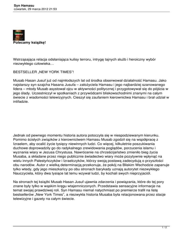 Syn Hamasu czwartek, 29 marca 2012 21:53 Polecamy książkę! Wstrząsająca relacja odsłaniająca kulisy terroru, intrygę tajnych służb i heroiczny wybór niezwykłego człowieka… BESTSELLER „NEW YORK TIMES”! Musab Hasan Jusuf już od najmłodszych lat od środka obserwował działalność Hamasu. Jako najstarszy syn szajcha Hasana Jusufa – założyciela Hamasu i jego najbardziej szanowanego lidera – młody Musab asystował ojcu w aktywności politycznej i przygotowywał się do pójścia w jego ślady. Uczestniczył w spotkaniach z przywódcami bliskowschodnimi znanymi na całym świecie z wiadomości telewizyjnych. Cieszył się zaufaniem kierownictwa Hamasu i brał udział w intifadzie. Jednak od pewnego momentu historia autora potoczyła się w niespodziewanym kierunku. Pomimo ścisłych związków z kierownictwem Hamasu Musab zgodził się na współpracę z Izraelem, aby ocalić życie tysięcy niewinnych ludzi. Co więcej, kilkuletnie poszukiwania duchowe doprowadziły go do radykalnego zrewidowania poglądów, porzucenia islamu i wyznania wiary w Jezusa Chrystusa. Nawrócenie na chrześcijaństwo zmieniło bieg życia Musaba, a składane przez niego publicznie świadectwo wiary może pozytywnie wpłynąć na wielu innych Palestyńczyków i Izraelczyków, którzy swoją postawą zadecydują o przyszłości obu narodów. Autor z wielką determinacją przekonuje, że pokój na Bliskim Wschodzie zapanuje tylko wtedy, gdy jego mieszkańcy po obu stronach barykady uznają autorytet niezwykłego Nauczyciela, który dwa tysiące lat temu wzywał ludzi, by kochali swych nieprzyjaciół. Na stronach tej książki Musab Hasan Jusuf ujawnia zdarzenia i powiązania, które do tej pory znane były tylko w wąskim kręgu wtajemniczonych. Przedstawia sensacyjne informacje na temat swojej prawdziwej roli. Syn Hamasu niemal natychmiast po premierze trafił na listę bestsellerów „New York Times”, a niezwykła historia Musaba była relacjonowana przez stacje telewizyjne i gazety na całym świecie. 1/2 Syn Hamasu czwartek, 29 marca 2012 21:53 Więcej o książce (oraz bezpłatny fragment): ZOBACZ Książka do nabycia u nas w atrakcyjnej cenie 25zł. 2/2