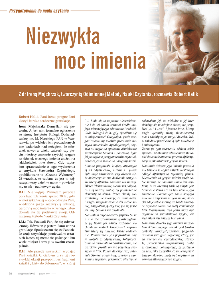 Przygotowanie do nauki czytania Niezwykła moc imienia Z dr Ireną Majchrzak, twórczynią Odimiennej Metody Nauki Czytania, rozmawia Robert Halik Robert Halik: Pani Ireno, pragnę Pani złożyć bardzo serdeczne gratulacje. Irena Majchrzak: Domyślam się powodu. A jest nim formalne ogłoszenie ze strony Instytutu Biologii Doświadczalnej im. M. Nenckiego PAN w Warszawie, po wieloletnich prowadzonych tam badaniach nad mózgiem, że człowiek nawet w wieku czterech czy pięciu miesięcy znacznie szybciej reaguje na dźwięk własnego imienia aniżeli na jakiekolwiek inne słowo. Gdy czytałam sprawozdanie z tego wydarzenia w artykule Sławomira Zagórskiego, opublikowane w „Gazecie Wyborczej” 28 września, to czułam, że jest to najszczęśliwszy dzień w moim – powiedzmy to tak – naukowym życiu. R.H.: Nie wątpię. Pamiętam przecież opis tego zdarzenia sprzed 28 lat, gdy w meksykańskiej wiosce odkryła Pani, wiedziona jakąś niezwykłą intuicją, ogromną moc imienia własnego i zbudowała na tej podstawie swoją Odimienną Metodę Nauki Czytania. I.M.: Tak. Pozwoli Pan, że się odwzajemnię. Również ja jestem Panu winna gratulacje. Spodziewam się, że Pan także czuje satysfakcję, ponieważ w ostatnich latach tej metodzie poświęcił Pan wiele miejsca i uwagi w swoim czasopiśmie. R.H.: Ale przede wszystkim wydając Pani książki. Chciałbym przy tej niezwykłej okazji przypomnieć fragment książki „Listy do Salomona”, w której 90 bliżej przedszkola 12.111 grudzień 2010 (...) Stało się to zupełnie nieoczekiwanie i do tej chwili stanowi źródło mojego nieustającego zdumienia i radości. Otóż któregoś dnia, gdy zjawiłam się w miejscowości Guaytalpa, gdzie zorganizowaliśmy właśnie pracownię naszych materiałów dydaktycznych, wyszła mi nagle na spotkanie ośmioletnia dziewczynka Simona i poprosiła, bym jej pomogła w przygotowaniu czytanki, zadanej jej w szkole na następny dzień. pokazałam jej, że niektóre z jej liter składają się w odrębne słowa, na przykład „si” i „no”, i jeszcze inne. Litery nagle ujawniły swoją słowotwórczą moc i zdołały zająć umysł dziecka, które zaledwie przed chwilą było znudzone i zniechęcone. Zaraz po tym zdarzeniu zdałam sobie sprawę... że oto imię własne może stanowić doskonałe otwarcie procesu alfabetyzacji w jakimkolwiek języku świata. Simona przyniosła książkę, otworzyła ją na odpowiedniej stronie i... jakież było moje zdumienie, gdy okazało się, że dziewczynka zna doskonale wszystkie litery alfabetu, zarówno ich nazwy, jak też ich brzmienie, ale nie ma pojęcia, co z tą wiedzą zrobić, by poskładać te elementy w słowa. Przez chwilę siedziałyśmy nie wiedząc, co robić dalej, i nagle, niespodziewanie dla siebie samej, zapytałam ją, czy wie, jak się pisze jej imię. Simona nie wiedziała. Napisanie dziecku jego imienia pozwala mu bowiem w trybie natychmiastowym odkryć alfabetyczną tajemnicę pisma. Niezależnie od języka dziecko zdaje sobie sprawę, że napisane słowo jest szyfrem, że za literową zasłoną ukryte jest brzmienie słowa i co za tym idzie – jego znaczenie. Porównując zapis swojego imienia z zapisami innych imion, dziecko zdaje sobie sprawę, że każde znaczące zapisane słowo ma stałą kombinację liter. Wyjaśnienie tego faktu może być czynione w jakimkolwiek języku, ale jego istota jest zawsze taka sama. Napisałam więc na kartce papieru S i m o n a. Ze zdumieniem spostrzegłam, że jej twarz jak gdyby rozbłysła. Po chwili na małych karteczkach napisałam litery jej imienia, każdą oddzielnie. Pomieszałam je i poprosiłam, aby je ułożyła w odpowiedniej kolejności. Simona wykonała to błyskawicznie, ale wzrokiem prosiła mnie o powtórne rozsypanie liter. Ponad dziesięć razy składała Simona swoje imię, zawsze z tym samym wyrazem fascynacji. Następnie Napisanie dziecku jego imienia nazwałam aktem inicjacji. Ten akt jest bardzo osobisty i uroczysty zarazem. Ja go odczuwam jako gest magiczny, który, jak za uderzeniem czarodziejskiej różdżki, przekształca niepiśmienną osobę w człowieka pojmującego, że zarówno on sam, jak i wszystko, co umie wyrazić żywym słowem, może być napisane za pomocą alfabetycznego szyfru. blizejprzedszkola.pl opisuje Pani, w jakich okolicznościach zrodziła się odimienna metoda. Czytelnikom naszej rozmowy przypomnę, że w książce tej prezentuje Pani swoje doświadczenia edukacyjne w indiańskich rejonach Meksyku (patrz ramka). Stworzyła Pani porządek zupełnie odmienny od powszechnie stosowanego w szkole. I.M.: Zupełnie. Ja nazywam to rytuałem inicjacji. Porządek poznawanych liter nie jest wyznaczony przez z góry założoną kolejność prezentowania liter alfabetu, lecz przez imiona dzieci, które zaczynają naukę. Gdybym miała jakimś uczonym słowem scharakteryzować Odimienną Metodę Nauki Czytania, to powiedziałabym, że jest ona metodą semantyczną. Mój przekaz kierowany jest nie do uszu czy oczu dziecka, lecz od razu do jego umysłu. Na przykład Marek widzi napisane imię Marek i to, co naprawdę czyta, to jest JA. Adresuję swój przekaz od razu do u m y s ł u dziecka. Dziecko na samym początku procesu poznawczego poznaje z n a c z e n i e napisanego słowa. I to znaczenie, to jest „ja”. R.H.: Pani Ireno, to zdarzenie, które miało miejsce w Meksyku, w spotkaniach z Simoną, Adrianem i innymi dziećmi zdarzyło się, jak Pani mówi, 28 lat temu. Jakie były echa tych zdarzeń i opracowanej przez Panią i opisanej w kolejnych Pani publikacjach odimiennej metody? I.M.: Między innymi obecność tej metody na łamach Pana pisma i w wydanych książkach: „Listy do Salomona”, „Nazywanie Świata”, „W obronie dziecięcego rozumu” i innych. A także warsztaty prowadzone głównie przez panią Wandę Kostrzyńską, byłą wieloletnią dyrektorkę przedszkola, która pierwsza zdecydowała się wprowadzić tę metodę w kiero