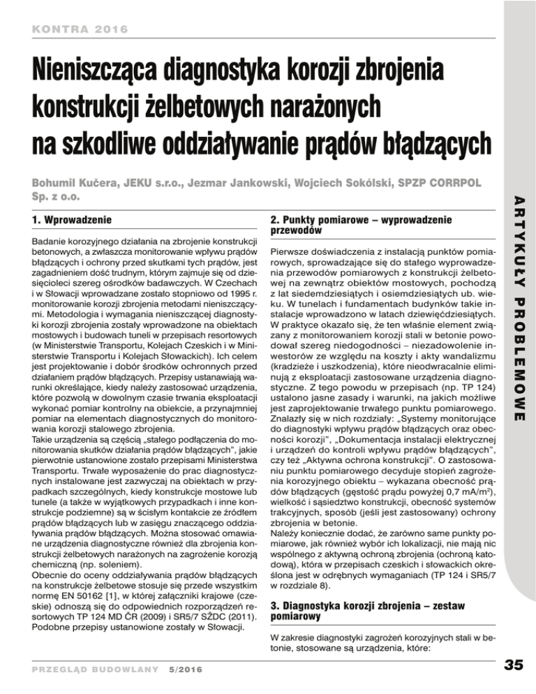 KO NT R A 2 0 1 6 Nieniszcząca diagnostyka korozji zbrojenia konstrukcji żelbetowych narażonych na szkodliwe oddziaływanie prądów błądzących 1. Wprowadzenie 2. Punkty pomiarowe – wyprowadzenie przewodów Badanie korozyjnego działania na zbrojenie konstrukcji betonowych, a zwłaszcza monitorowanie wpływu prądów błądzących i ochrony przed skutkami tych prądów, jest zagadnieniem dość trudnym, którym zajmuje się od dziesięcioleci szereg ośrodków badawczych. W Czechach i w Słowacji wprowadzane zostało stopniowo od 1995 r. monitorowanie korozji zbrojenia metodami nieniszczącymi. Metodologia i wymagania nieniszczącej diagnostyki korozji zbrojenia zostały wprowadzone na obiektach mostowych i budowach tuneli w przepisach resortowych (w Ministerstwie Transportu, Kolejach Czeskich i w Ministerstwie Transportu i Kolejach Słowackich). Ich celem jest projektowanie i dobór środków ochronnych przed działaniem prądów błądzących. Przepisy ustanawiają warunki określające, kiedy należy zastosować urządzenia, które pozwolą w dowolnym czasie trwania eksploatacji wykonać pomiar kontrolny na obiekcie, a przynajmniej pomiar na elementach diagnostycznych do monitorowania korozji stalowego zbrojenia. Takie urządzenia są częścią „stałego podłączenia do monitorowania skutków działania prądów błądzących”, jakie pierwotnie ustanowione zostało przepisami Ministerstwa Transportu. Trwałe wyposażenie do prac diagnostycznych instalowane jest zazwyczaj na obiektach w przypadkach szczególnych, kiedy konstrukcje mostowe lub tunele (a także w wyjątkowych przypadkach i inne konstrukcje podziemne) są w ścisłym kontakcie ze źródłem prądów błądzących lub w zasięgu znaczącego oddziaływania prądów błądzących. Można stosować omawiane urządzenia diagnostyczne również dla zbrojenia konstrukcji żelbetowych narażonych na zagrożenie korozją chemiczną (np. soleniem). Obecnie do oceny oddziaływania prądów błądzących na konstrukcje żelbetowe stosuje się przede wszystkim normę EN 50162 [1], w której załączniki krajowe (czeskie) odnoszą się do odpowiednich rozporządzeń resortowych TP 124 MD ČR (2009) i SR5/7 SŽDC (2011). Podobne przepisy ustanowione zostały w Słowacji. Pierwsze doświadczenia z instalacją punktów pomiarowych, sprowadzające się do stałego wyprowadzenia przewodów pomiarowych z konstrukcji żelbetowej na zewnątrz obiektów mostowych, pochodzą z lat siedemdziesiątych i osiemdziesiątych ub. wieku. W tunelach i fundamentach budynków takie instalacje wprowadzono w latach dziewięćdziesiątych. W praktyce okazało się, że ten właśnie element związany z monitorowaniem korozji stali w betonie powodował szereg niedogodności – niezadowolenie inwestorów ze względu na koszty i akty wandalizmu (kradzieże i uszkodzenia), które nieodwracalnie eliminują z eksploatacji zastosowane urządzenia diagnostyczne. Z tego powodu w przepisach (np. TP 124) ustalono jasne zasady i warunki, na jakich możliwe jest zaprojektowanie trwałego punktu pomiarowego. Znalazły się w nich rozdziały: „Systemy monitorujące do diagnostyki wpływu prądów błądzących oraz obecności korozji”, „Dokumentacja instalacji elektrycznej i urządzeń do kontroli wpływu prądów błądzących”, czy też „Aktywna ochrona konstrukcji”. O zastosowaniu punktu pomiarowego decyduje stopień zagrożenia korozyjnego obiektu – wykazana obecność prądów błądzących (gęstość prądu powyżej 0,7 mA/m2), wielkość i sąsiedztwo konstrukcji, obecność systemów trakcyjnych, sposób (jeśli jest zastosowany) ochrony zbrojenia w betonie. Należy koniecznie dodać, że zarówno same punkty pomiarowe, jak również wybór ich lokalizacji, nie mają nic wspólnego z aktywną ochroną zbrojenia (ochroną katodową), która w przepisach czeskich i słowackich określona jest w odrębnych wymaganiach (TP 124 i SR5/7 w rozdziale 8). A R T Y K U ŁY P R O B L E M O W E Bohumil Kučera, JEKU s.r.o., Jezmar Jankowski, Wojciech Sokólski, SPZP CORRPOL Sp. z o.o. 3. Diagnostyka korozji zbrojenia – zestaw pomiarowy W zakresie diagnostyki zagrożeń korozyjnych stali w betonie, stosowane są urządzenia, które: PRZEGLĄD BUDOWLANY 5/2016 35 KO NT R A 2 0 1 6 A R T Y K U ŁY P R O B L E M O W E • są w stanie wykrywać obecności produktów korozji, • są w stanie wykrywać przepływ prądu w konstrukcji (spadek napięcia), • śledzą ubytek materiału sondy (używa się je do pomiaru szybkości korozji), • mierzą głębokość penetracji czynników agresywnych korozyjnie w stosunku do stalowego zbrojenia, • mierzą rezystywność betonu, • mierzą pH betonu, • mierzą potencjał względem elektrod odniesienia umieszczonych w betonie. 36 Oczekiwaną funkcją nieniszczącej diagnostyki korozji zbrojenia jest stała lub okresowa informacja o aktualnej korozyjnej agresywności betonu w stosunku do zbrojenia. Obserwowane zmiany służą do przewidywania ewentualnych uszkodzeń konstrukcji betonowych – pękania, przenikania wody i czynników agresywnych, np. chlorków. Praktyka wykazała, że rzeczywiste wskaźniki obecności czynników przyspieszających procesy korozyjne, oznaczane za pomocą zainstalowanych urządzeń monitorujących, niekoniecznie oznaczają takie zagrożenie korozyjne konstrukcji, które grozi drastycznym skróceniem jej żywotności. Z tego powodu konieczne było uzupełnienie systemu diagnostycznego za pomocą urządzenia, które byłoby w stanie mierzyć bezpośrednio szybkość korozji stalowego zbrojenia w betonie. W 2004 r. zdecydowano, aby uzupełnić stosowany dotychczas zestaw diagnostyczny o rezystancyjny czujnik szybkości korozji. W skład typowego zestawu diagnostycznego wchodzą następujące urządzenia pomiarowe: • sonda do pomiaru obecności procesu korozji zbrojenia (CMS-Corrosionsmeßsysteme Dipl.Ing. Bernhard Wietek KEG, Austria), której zasada działania polega na pomiar