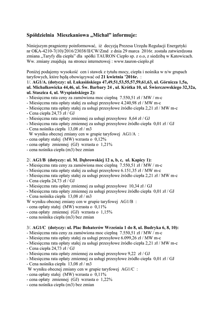 Spółdzielnia Mieszkaniowa „Michał” informuje: Niniejszym pragniemy poinformować, iż decyzją Prezesa Urzędu Regulacji Energetyki nr OKA-4210-7(10)/2016/23038/II/CW/Zmd z dnia 29 marca 2016r. została zatwierdzona zmiana „Taryfy dla ciepła” dla spółki TAURON Ciepło sp. z o.o, z siedzibą w Katowicach. Ww. zmiany znajdują na stronce internetowej : www.tauron-cieplo.pl Poniżej podajemy wysokość cen i stawek z tytułu mocy, ciepła i nośnika w n/w grupach taryfowych, które będą obowiązywać od 21 kwietnia ’2016r. : 1/. AG1/A. (dotyczy: ul. Łukasińskiego 47,49,51,53,55,57,59,61,63, ul. Górnicza 1,5a, ul. Michałkowicka 44,46, ul. Św. Barbary 24 , ul. Krótka 10, ul. Świerczewskiego 32,32a, ul. Staszica 4, ul. Wyspiańskiego 2): - Miesięczna rata ceny za zamówiona moc cieplną 7.550,51 zł / MW / m-c - Miesięczna rata opłaty stałej za usługi przesyłowe 4.240,98 zł / MW m-c - Miesięczna rata opłaty stałej za usługi przesyłowe źródło ciepła 2,21 zł / MW m-c - Cena ciepła 24,73 zł / GJ - Miesięczna rata opłaty zmiennej za usługi przesyłowe 8,64 zł / GJ - Miesięczna rata opłaty zmiennej za usługi przesyłowe źródło ciepła 0,01 zł / GJ - Cena nośnika ciepła 13,08 zł / m3 W wyniku obecnej zmiany cen w grupie taryfowej AG1/A : - cena opłaty stałej (MW) wzrasta o 0,12% - cena opłaty zmiennej (GJ) wzrasta o 1,21% - cena nośnika ciepła (m3) bez zmian 2/. AG1/B (dotyczy: ul. M. Dąbrowskiej 12 a, b, c, ul. Kapicy 1): - Miesięczna rata ceny za zamówiona moc cieplną 7.550,51 zł / MW / m-c - Miesięczna rata opłaty stałej za usługi przesyłowe 6.151,35 zł / MW m-c - Miesięczna rata opłaty stałej za usługi przesyłowe źródło ciepła 2,21 zł / MW m-c - Cena ciepła 24,73 zł / GJ - Miesięczna rata opłaty zmiennej za usługi przesyłowe 10,34 zł / GJ - Miesięczna rata opłaty zmiennej za usługi przesyłowe źródło ciepła 0,01 zł / GJ - Cena nośnika ciepła 13,08 zł / m3 W wyniku obecnej zmiany cen w grupie taryfowej AG1/B : - cena opłaty stałej (MW) wzrasta o 0,11% - cena opłaty zmiennej (GJ) wzrasta o 1,15% - cena nośnika ciepła (m3) bez zmian 3/. AG1/C (dotyczy: ul. Plac Bohaterów Września 1 do 8, ul. Budryka 6, 8, 10): - Miesięczna rata ceny za zamówiona moc cieplną 7.550,51 zł / MW / m-c - Miesięczna rata opłaty stałej za usługi przesyłowe 6.099,26 zł / MW m-c - Miesięczna rata opłaty stałej za usługi przesyłowe źródło ciepła 2,21 zł / MW m-c - Cena ciepła 24,73 zł / GJ - Miesięczna rata opłaty zmiennej za usługi przesyłowe 9,22 zł / GJ - Miesięczna rata opłaty zmiennej za usługi przesyłowe źródło ciepła 0,01 zł / GJ - Cena nośnika ciepła 13,08 zł / m3 W wyniku obecnej zmiany cen w grupie taryfowej AG1/C : - cena opłaty stałej (MW) wzrasta o 0,11% - cena opłaty zmiennej (GJ) wzrasta o 1,22% - cena nośnika ciepła (m3) bez zmian 4/. AG1/D (dotyczy: ul. Stawowa 3,3a): - Miesięczna rata ceny za zamówiona moc cieplną 7.550,51 zł / MW / m-c - Miesięczna rata opłaty stałej za usługi przesyłowe 7.778,75 zł / MW m-c - Miesięczna rata opłaty stałej za usługi przesyłowe źródło ciepła 2,21 zł / MW m-c - Cena ciepła 24,73 zł / GJ - Miesięczna rata opłaty zmiennej za usługi przesyłowe 12,41 zł / GJ - Miesięczna rata opłaty zmiennej za usługi przesyłowe źródło ciepła 0,01 zł / GJ - Cena nośnika ciepła 13,08 zł / m3 W wyniku obecnej zmiany cen w grupie taryfowej AG1/D : - cena opłaty stałej (MW) wzrasta o 0,11% - cena opłaty zmiennej (GJ) wzrasta o 1,09% - cena nośnika ciepła (m3) bez zmian 5/. AG1/A / A.2.1. (dotyczy: ul. Stawowa 12,13,15,17,19,21 ul. Bytomska 6,7,18,20,21,29, 30,33,40 ul. Oświęcimska 2, ul. Żeromskiego 26,28): - Miesięczna rata ceny za zamówiona moc cieplną Turon Ciepło 7.550,51 zł / MW / m-c - Miesięczna rata opłaty stałej za usługi przesyłowe 1.611,98 zł / MW m-c - Miesięczna rata opłaty stałej za usługi przesyłowe Tauron Ciepło 4.240,98 zł / MW/ m-c - Miesięczna rata opłaty stałej za usługi przesyłowe źródło ciepła Tauron Ciepło 2,21zł MW/ m-c - Cena ciepła Tauron Ciepło 24,73 zł / GJ - Miesięczna rata opłaty zmiennej za usługi przesyłowe 7,45 zł / GJ - Miesięczna rata opłaty zmiennej za usługi przesyłowe Tauron Ciepło 8,64 zł / GJ - Miesięczna rata opłaty zmiennej za usługi przesyłowe źródło ciepła Tauron Ciepło 0,01 zł / GJ - Cena nośnika ciepła 13,08 zł / m3 W wyniku obecnej zmiany cen w grupie taryfowej AG1/A/ A.2.1. : - cena opłaty stałej (MW) wzrasta o 0,11% - cena opłaty zmiennej (GJ) wzrasta o 0,99 % - cena nośnika ciepła (m3) bez zmian Podane wyżej ceny i stawki opłat są cenami netto, podatek VAT nalicza się zgodnie z obowiązującymi przepisami. Nowa taryfa dla ciepła oraz powyższe ceny i stawki opłat obowiązują od 21.04.2016r.