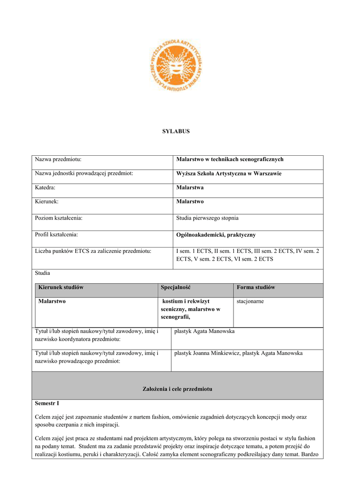SYLABUS Nazwa przedmiotu: Malarstwo w technikach scenograficznych Nazwa jednostki prowadzącej przedmiot: Wyższa Szkoła Artystyczna w Warszawie Katedra: Malarstwa Kierunek: Malarstwo Poziom kształcenia: Studia pierwszego stopnia Profil kształcenia: Ogólnoakademicki, praktyczny Liczba punktów ETCS za zaliczenie przedmiotu: I sem. 1 ECTS, II sem. 1 ECTS, III sem. 2 ECTS, IV sem. 2 ECTS, V sem. 2 ECTS, VI sem. 2 ECTS Studia Kierunek studiów Specjalność Forma studiów Malarstwo kostium i rekwizyt sceniczny, malarstwo w scenografii, stacjonarne Tytuł i/lub stopień naukowy/tytuł zawodowy, imię i nazwisko koordynatora przedmiotu: plastyk Agata Manowska Tytuł i/lub stopień naukowy/tytuł zawodowy, imię i nazwisko prowadzącego przedmiot: plastyk Joanna Minkiewicz, plastyk Agata Manowska Założenia i cele przedmiotu Semestr I Celem zajęć jest zapoznanie studentów z nurtem fashion, omówienie zagadnień dotyczących koncepcji mody oraz sposobu czerpania z nich inspiracji. Celem zajęć jest praca ze studentami nad projektem artystycznym, który polega na stworzeniu postaci w stylu fashion na podany temat. Student ma za zadanie przedstawić projekty oraz inspiracje dotyczące tematu, a potem przejść do realizacji kostiumu, peruki i charakteryzacji. Całość zamyka element scenograficzny podkreślający dany temat. Bardzo ważna jest tu praca własna studenta w oparciu o konsultacje z wykładowcą. Semestr II Celem zajęć jest omówienie zagadnień dotyczących koncepcji mody w poszczególnych epokach od starożytności do czasów współczesnych oraz sposobu czerpania z niej inspiracji. Celem zajęć jest indywidualna praca ze studentami nad projektem artystycznym, który polega na stworzeniu postaci zainspirowanej daną epoką .Student ma za zadanie przedstawić projekty oraz inspiracje dotyczące tematu, a potem przejść do realizacji kostiumu, peruki i charakteryzacji. Całość zamykają elementy scenograficzne i rekwizyty podkreślające dany temat. Bardzo ważna jest tu praca własna studenta w oparciu o konsultacje z wykładowcą. Semestr III Celem zajęć jest zapoznanie student—w z technikami charakteryzatorskimi i ich zastosowaniem w różnych projektach. Zmiana wizerunku człowieka za pomocą środków plastycznych przy użyciu efektów malarskich, światłocienia, kontrastu oraz innych poznanych technik charakteryzatorskich w różne postacie –rasa, sobowtór, ikona stylu i mody, halloween. Zapoznanie studentów z nowymi środkami charakteryzatorskimi do tworzenia efektów specjalnych w filmie . Semestr IV Celem zajęć jest zapoznanie studentów z nowymi technikami oraz materiałami charakteryzatorskimi. Celem tych zajęć jest nabycie umiejętności w tworzeniu kolejnych wizerunków inspirowanych motywami zwierzęcymi , przedmiotami, wyboru technik, pozwalających na stworzenie dowolnej postaci. Celem zajęć jest również nabycie umiejętności i ich zastosowanie w charakteryzacji wybranych materii, faktur i struktur oraz obudzenie wrażliwości na różne techniki malarskie. Semestr V Celem zajęć jest zapoznanie studentów ze specjalistycznymi technikami I materiałami charakteryzatorskimi służącymi do efektów specjalnych w filmie. Jest to w pewien sposób rozszerzony i pogłębiony cykl tematyczny z trzeciego semestru. Celem zajęć jest również nauczenie studentów tworzenia prostetyków do charakteryzacji, przerobienie całego procesu wykonania wklejki (elementu plastycznego użytego do charakteryzacji) w pracowni odlewów. Semestr VI Celem zajęć jest zapoznanie studentów z kolejnymi technikami charakteryzatorskimi opartymi na pracy z aerografem. Celem jest rozszerzenie sposobu myślenia plastycznego o postaci i przejście do koncepcji projektu w ruchu z wykorzystaniem do tego celu więcej niż jednej osoby. Wymagania wstępne I semestr: klasyfikacja na pierwszy rok studiów. II semestr: Wymagana umiejętność podstawowych zasad wykonania makijażu oraz użycia odpowiednich środków wyrazu dla stworzenia danego typu makijażu. Podstawowa umiejętność poruszania się w technikach wykonania makijażu teatralnego, filmowego i do sesji foto. Semestr III: Wymagana umiejętność posługiwania się w sprawny sposób technikami makijażu. Znajomość podstawowych środków do charakteryzacji. Umiejętność czesania. Swoboda i precyzja wykonywania charakteryzacji. Semestr IV: Wymagana umiejętność posługiwania się w sprawny sposób technikami charakteryzatorskimi poznanymi w poprzednim semestrze. Znajomość i umiejętność wykorzystywania środków do 2 efektów specjalnych w charakteryzacji. Semestr V: Wymagana umiejętność posługiwania się w sprawny sposób technikami charakteryzatorskimi. Znajomość i umiejętność wykorzystywania środków do charakteryzacji oraz swobodne łączenie ich w projektach. Semestr VI: Wymagana umiejętność posługiwania się w sprawny sposób technikami charakteryzatorskimi. Znajomość i umiejętność wykorzystywania środków do charakteryzacji. Zamierzony efekt kształcenia Symbol efektu kształcenia na poziomie kierunku Opis efektu kształcenia na poziomie przedmiotu K_W01 Wie, jak umiejętnie i świadomie dobrać narzędzia i materiały niezbędne do wykorzystania w projektach artystycznych przy wykonaniu konkretnej chakteryzacji. K_W02 Zdobywa wiedzę na temat podstawowych stylów w modzie oraz twórczości wiodących projektantów. Poznaje podstawowe trendy dotyczące makijażu oraz fryzur stosowanych podczas pokazów mody. Nabywa wiedzę o środkach charakteryzatorskich i sposobach ich wykorzystywania w projektach. K_W03 Zna i swobodnie posługuje się specjalistyczną terminologią dotyczącą środków charakteryzatorskich i technik malarskich. K_W04 Zna i rozumie podstawowe zagadnienia technologiczne i warsztatowe dotyczące pokrewnych dyscyplin artystycznych: kostiumografii, malarstwa i scenografii. K_W16 Wie, gdzie ma szukać i jak znaleźć w różnych źródłach informacji dotycz