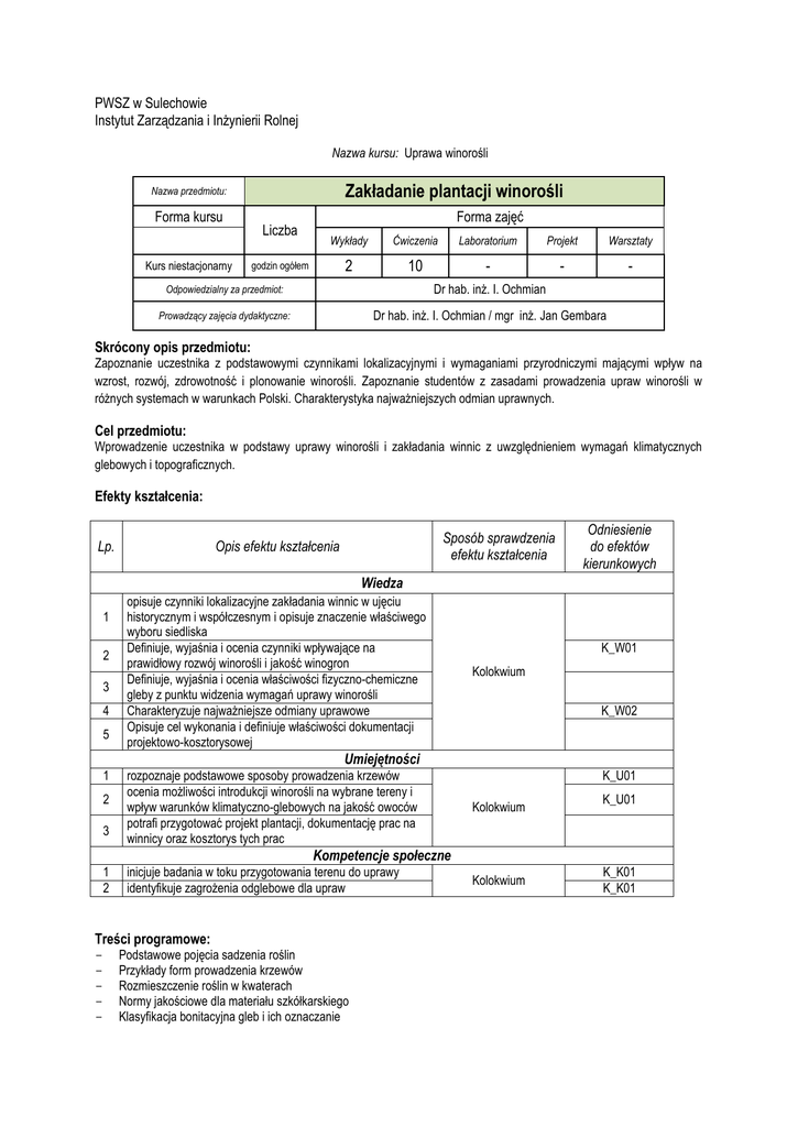 PWSZ w Sulechowie Instytut Zarządzania i Inżynierii Rolnej Nazwa kursu: Uprawa winorośli Zakładanie plantacji winorośli Nazwa przedmiotu: Forma kursu Kurs niestacjonarny Liczba Forma zajęć Wykłady Ćwiczenia Laboratorium Projekt Warsztaty 2 10 - - - godzin ogółem Odpowiedzialny za przedmiot: Dr hab. inż. I. Ochmian Prowadzący zajęcia dydaktyczne: Dr hab. inż. I. Ochmian / mgr inż. Jan Gembara Skrócony opis przedmiotu: Zapoznanie uczestnika z podstawowymi czynnikami lokalizacyjnymi i wymaganiami przyrodniczymi mającymi wpływ na wzrost, rozwój, zdrowotność i plonowanie winorośli. Zapoznanie studentów z zasadami prowadzenia upraw winorośli w różnych systemach w warunkach Polski. Charakterystyka najważniejszych odmian uprawnych. Cel przedmiotu: Wprowadzenie uczestnika w podstawy uprawy winorośli i zakładania winnic z uwzględnieniem wymagań klimatycznych glebowych i topograficznych. Efekty kształcenia: Lp. Sposób sprawdzenia efektu kształcenia Opis efektu kształcenia Odniesienie do efektów kierunkowych Wiedza 1 2 3 4 5 opisuje czynniki lokalizacyjne zakładania winnic w ujęciu historycznym i współczesnym i opisuje znaczenie właściwego wyboru siedliska Definiuje, wyjaśnia i ocenia czynniki wpływające na prawidłowy rozwój winorośli i jakość winogron Definiuje, wyjaśnia i ocenia właściwości fizyczno-chemiczne gleby z punktu widzenia wymagań uprawy winorośli Charakteryzuje najważniejsze odmiany uprawowe Opisuje cel wykonania i definiuje właściwości dokumentacji projektowo-kosztorysowej K_W01 Kolokwium K_W02 Umiejętności 1 2 3 rozpoznaje podstawowe sposoby prowadzenia krzewów ocenia możliwości introdukcji winorośli na wybrane tereny i wpływ warunków klimatyczno-glebowych na jakość owoców potrafi przygotować projekt plantacji, dokumentację prac na winnicy oraz kosztorys tych prac K_U01 Kolokwium K_U01 Kompetencje społeczne 1 2 inicjuje badania w toku przygotowania terenu do uprawy identyfikuje zagrożenia odglebowe dla upraw Treści programowe: - Podstawowe pojęcia sadzenia roślin Przykłady form prowadzenia krzewów Rozmieszczenie roślin w kwaterach Normy jakościowe dla materiału szkółkarskiego Klasyfikacja bonitacyjna gleb i ich oznaczanie Kolokwium K_K01 K_K01 - Kompleksy przydatności rolniczej gleb Opis profilu glebowego Pobieranie próbek glebowych Czytanie map glebowych Zagospodarowanie terenu Dobór odmian zgodny z listą UE Odmiany, ich podział i zastosowanie Czynniki wpływające na jakość owoców Opracowanie dokumentacji projektowo-kosztorysowej Charakterystyka odmian i ich przydatności do zamierzonego celu Przygotowanie projektu plantacji Metody / techniki dydaktyczne: - metody podające: wykład informacyjny z wykorzystaniem technik multimedialnych wykład problemowy metody poszukujące: problemowe: giełda pomysłów w ocenie przyczyn i skutków zjawisk chemicznych, fizycznych i biologicznych zachodzących w glebach sytuacyjna: analizowanie przez grupy studentów rzeczywistych sytuacji glebowych i terenowych ćwiczeniowo-praktyczne: laboratoryjna, obserwacji i pomiaru w terenie, studium przykładowe Sposób i kryteria sprawdzania efektów kształcenia: - zaliczenie prezentacje wyników i raporty na zajęciach laboratoryjnych raport z zajęć terenowych sprawdzanie obecności na zajęciach Sposób zaliczenia: Na ocenę końcową składają się: - zaliczenie 100% prac laboratoryjnych i zajęć terenowych Uwagi: Podpis pracownika Podpis Dyrektora PWSZ w Sulechowie Instytut Zarządzania i Inżynierii Rolnej Nazwa kursu: Uprawa winorośli Uprawa i żywienie winorośli Nazwa przedmiotu: Forma kursu Kurs niestacjonarny Liczba godzin ogółem Forma zajęć Wykłady Ćwiczenia Laboratorium Projekt Warsztaty 2 10 - - - Odpowiedzialny za przedmiot: Mgr inż. Jan Gembara Prowadzący zajęcia dydaktyczne: Mgr inż. Jan Gembara Skrócony opis przedmiotu: Uczestnik zapoznaje się w toku zajęć ze specyfiką przygotowania terenu pod winnicę, zakładania winnic i pielęgnacją uprawy winorośli, wykorzystując w tym celu wiedzę z zakresu gleboznawstwa, i uprawy roli. Zapoznanie z nawozami organicznymi i mineralnymi, zasadami ich stosowania, wpływem na żyzność gleby i żywienie roślin. Omówienie celu uprawy roli i poprawa ich właściwości fizycznych, chemicznych i biologicznych. Cel przedmiotu: Wskazanie zakresu prac uprawowych i pielęgnacyjnych, koniecznych do zrealizowania w toku przygotowania terenu, zakładania winnic oraz ich pielęgnacji. Wprowadzenie studentów w podstawy żywienia w oparciu o teorię mineralnego odżywiania się roślin. Wprowadzenie studentów w zagadnienia podstawowej uprawy gleby. Możliwości wykonania różnych uprawek. Wymagania wstępne: Znajomość podstawowych procesów biologicznych i chemicznych. Efekty kształcenia: Lp. Opis efektu kształcenia Sposób sprawdzenia efektu kształcenia Odniesienie do efektów kierunkowych Wiedza 1 2 3 4 5 6 definiuje i wyjaśnia specyfikę uprawy roli na obszarach winnic opisuje interakcje między nawozami, nawozami i glebą oraz nawozami i roślinami definiuje i opisuje formy nawożenia oraz przedstawia zasady stosowania nawozów zna maszyny, którymi można wykonać uprawę roli i zabiegi pielęgnacyjne w obrębie winnicy definiuje i wyjaśnia na czym polega uprawa roli zna maszyny, którymi można wykonać uprawę roli i zabiegi pielęgnacyjne kolokwium umie dobrać sprzęt mechaniczny do określonych zabiegów pielęgnacyjnych potrafi zaplanować, zaprojektować i wykonać cykl podstawowych zabiegów uprawowych i pielęgnacyjnych na winnicy kolokwium K_W03 K_W01 K_W03 K_W03 K_W03 K_W03 Umiejętności 1 2 K_U03 K_U02 3 4 wybiera właściwe rodzaje nawozów dokonuje pomiarów pH metodami polowymi i laboratoryjnymi 5 umie dobrać sprzęt mechaniczny do określonych zabiegów pielęgnacyjnych Kompetencje społeczne świadomie wybiera rodzaj uprawy dla danej 1 lokalizacji, dostrzegając dylematy społecznoekonomiczne i środowiskowo-przestr