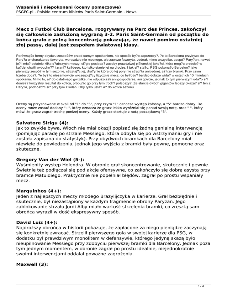 Wspaniali i niepokonani (oceny pomeczowe) PSGFC.pl - Polskie centrum kibiców Paris Saint-Germain - News Mecz z Futbol Club Barcelona, rozgrywany na Parc des Princes, zakończył się całkowicie zasłużoną wygraną 3-2. Paris Saint-Germain od początku do końca grało z pełną koncentracją pokazując, że nawet pomimo ostatniej złej passy, dalej jest zespołem światowej klasy. Porównuj?c formy obydwu zespo?ów przed samym spotkaniem, nie sposób by?o zaprzeczy?, ?e to Barcelona przybywa do Pary?a w charakterze faworyta, wprawdzie nie mocnego, ale zawsze faworyta. Jednak mimo wszystko, zespó? Pary?an, nawet je?li mia? ostatnio kilka s?abszych meczy, ci?gle posiada? zasoby prawdziwej pi?karskiej jako?ci, która mog?a przecie? w ka?dej chwili wybuchn?? i zrani? ka?dego, kto tylko stanie jej na drodze. I tak si? sta?o. PSG pokona?o Barcelon? jako pierwszy zespó? w tym sezonie, strzelaj?c jej, dru?ynie która do tej pory nie straci?a ani jednej, a? trzy bramki. Przy czym trzeba doda?, ?e by? to niesamowicie wyczerpuj?cy fizycznie mecz, co by?o ju? bardzo dobrze wida? w ostatnich 10 minutach spotkania. Mimo to, a? do ostatniego gwizdka, nie odpuszczali ani gospodarze, ani go?cie, jednak to tym pierwszym uda?o si? donie?? korzystny rezultat do ko?ca, próbuj?c go przy tym troch? polepszy?. Ze starcia dwóch gigantów lepszy okaza? si? ten z Pary?a, podnosz?c si? przy tym z kolan. Oby tylko usta? a? do ko?ca sezonu. Oceny są przyznawane w skali od "1" do "5", przy czym "1" oznacza występ żałosny, a "5" bardzo dobry. Do oceny może zostać dodany "+", który oznacza że gracz lekko wyróżniał się ponad swoją notę, oraz "-", który mówi że gracz zagrał trochę poniżej oceny. Każdy gracz startuje z notą początkową "3". Salvatore Sirigu (4): Jak to zwykle bywa, Włoch nie miał okazji popisać się żadną genialną interwencją (pomijając paradę po strzale Messiego, która odbyła się po wstrzymaniu gry i nie została zapisana do statystyk). Przy obydwóch bramkach dla Barcelony miał niewiele do powiedzenia, jednak jego wyjścia z bramki były pewne, pomocne oraz skuteczne. Gregory Van der Wiel (5-): Wyśmienity występ Holendra. W obronie grał skoncentrowanie, skutecznie i pewnie. Świetnie też podłączał się pod akcje ofensywne, co zakończyło się dobrą asystą przy bramce Matuidiego. Praktycznie nie popełniał błędów, zagrał po prostu wspaniały mecz. Marquinhos (4+): Jeden z najlepszych meczy młodego Brazylijczyka w karierze. Grał bezbłędnie i skutecznie, był niezastąpiony w każdym fragmencie obrony Paryżan. Jego zablokowanie strzału Jordi Alby miało wartość strzelenia bramki, co zresztą sam obrońca wyraził w dość ekspresywny sposób. David Luiz (4+): Najdroższy obrońca w historii pokazuje, że zapłacone za niego pieniądze zaczynają się konkretnie zwracać. Strzelił pierwszego gola w swojej karierze dla PSG, w dodatku był prawdziwym monolitem w defensywie, którego jedyną skazą było nieupilnowanie Messiego przy zdobyciu pierwszej bramki dla Barcelony. Jednak poza tym jednym momentem, w obronie zagrał po prostu idealnie, niejednokrotnie swoimi interwencjami oddalał poważne zagrożenia. Maxwell (3): 1/3 Wspaniali i niepokonani (oceny pomeczowe) PSGFC.pl - Polskie centrum kibiców Paris Saint-Germain - News Zdecydowanie nijaki mecz Brazylijczyka. Był niewidoczny przez większość gry, nie podłączał się także pod kontrataki Paryżan. Być może wynikało to z powodu założeń Blanca, który nie chciał zbytnio angażować bocznych obrońców w akcje ofensywne, jednak na tle Van Der Wiela, były gracz Ajaxu wypada po prostu słabo. Przez cały mecz nie zaliczył ani jednego odbioru czy przechwytu. Marco Verratti (4+): Fenomenalne spotkanie w wykonaniu młodego Włocha, między innymi przez swojego pierwszego gola dla PSG. Pomocnik przez cały mecz grał nadzwyczaj skoncentrowanie i odpowiedzialnie w porównaniu do tego, co zwykle prezentuje. Przez większą część meczu skupiał się bardziej na defensywie niż na rozgrywaniu, jednak nie można mieć mu tego za złe, bo spisywał się po prostu świetnie. Thiago Motta (5+) Man of the Match: We wczorajszym spotkaniu można było ujrzeć jego geniusz piłkarski w całej okazałości. Włoch grał po prostu fenomenalnie. Przez cały mecz zachwycała jego gra w obronie, osłupiała zdolność do kontroli tempa oraz wprawiało w zachwyt rozgrywanie piłki. Wychowanek Barcelony dodatkowo asystował swojemu rodakowi z rzutu rożnego. Za całe spotkanie, za to, że wziął na swoje barki prowadzenie do zwycięstwa osłabionego brakiem Silvy i Ibrahimovicia Paris Saint-Germain, został graczem meczu. Blaise Matuidi (5): Kolejny tytan ze środka pola PSG. Jego występ pokazał, że nie liczy się ilość, a jakość. Sam on zaliczył w meczu tyle samo odbiorów, przechwytów czy celnych długich podań niż Rakitić i Busquets razem wzięci. W dodatku strzelił trzecią bramkę dla PSG. Przez całe spotkanie wszędzie było go pełno, wylewał z siebie ostatnie poty, byleby tylko pomóc drużynie, nieważne czy chodziło o atak, czy o obronę. Edinson Cavani (3+): Pomimo całej krytyki, jaka spadła na niego za marnowanie kilku bardzo dobrych okazji z powodu wstrzymywania się użycia lewej nogi, miał też swój wkład w rezultat meczu. To nie przypadek, że został ustawiony na lewym skrzydle, nawet jeżeli był jedynym nominalnym napastnikiem na boisku po stronie PSG. Jak zwykle, Cavani w swoim stylu ciężko pracował na całej długości boiska, dlatego jego drugim najważniejszym zadaniem (po zdobywaniu bramek) w meczu było asekurowanie i wspomaganie Maxwella na lewej flance, z czego wywiązał się znakomicie. W dodatku zawsze pierwszy wychodził do kontrataków, zawsze był pod grą, jednak zabrakło tego, na co wszyscy czekali, czyli po prostu zdobytych przez niego bramek. Javier Pastore (4+): Nikomu, na prawdę nikomu nie mogło przyjść do głowy, że Pastore za