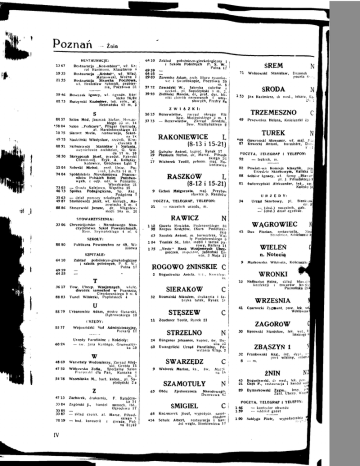 Poznań Żnin — 64 10 RESTAURACJE: 13 67 1935 2155 Restauracja „ K o l o m b i n a " , w ł . K a r o l B a r t m a n n , Klasztorna 6 Restauracja „ K r i s t a l " , w l . W ł a d . Malinowski, Woźna 1 Restauracja Strzecha Pocztowa, w t . B r o n i s ł a w Schmidt, p r o b i e r nia. Pocztowa 3 1 59 46 Roszczak Ignacy, 88 73 Raczyński w l . ogrodn. Kór nicka 76/84 Kazimierz, inż. r o l n . , a l . H e t m a ń s k a 42 m . 3 6 9 59 6 4 25 2 9 03 57 7 2 3 9 93 Zakład położniczo-ginekologiczny | i Szkoła Położnych P. S. W, Polna 17 ŚREM 71 Zaremba Adam, arch. Biuro rysunko w e i S w i a t l o k o p i e , P o c z t o w a 30 m. 8 Zawadzki W . , iabryka cukrów j c z e k o l . , p l . S a p l e ż y ń s k i 3 ra. 2. Zieliński M a r c i n , d r , p r o f . d y r . k l i niki chorób nerwowych I umy s ł o w y c h , F r e d r y 8a 88 57 " 5 8 04 1075 49 7 5 88 9 1 58 50 15 04 7 4 04 7505 46 73 35 63 4 9 87 88 86 Salon M ó d , Jasiniak Stefan, S ł o w a c kiego 33 m . 14 Salon „ P e d i c u r e " . Flleger G e r t r u d a , a l . M a r c i n k o w s k i e g o 13 Sierant M a r i a , restauracja. Szkol na 18 Studziński W ł a d y s ł a w , rzeżnlk, W r o . clawska 8 Skibniewscy Stanisław I Stefania, inżynierowie a r c h i t e k c i , O. Wil da 17 m . 10 Skrzypczak j ó z e f . przedst. F a b r y k i Chemicznej. Eryk. A. Koltatay, Katowice, Grochowe Ł ą k i 7 Sobcskl M i c h a ł , prol. Uniw. Po z n a ń , Libelta 14 m , 7 S p ó ł d z i e l n i a Mieszkaniowa Pracow n i k ó w Polskich Kole] Państwo w y c h , z o d p . udz. w Poznaniu. W i e r z b i ę c i c e 21 — Osada K o l e j o w a , W s p ó l n a 15 Spółka Pedagogiczna, Sp. Akc, Podgórna 7 — d z i a ł pomocy szkolnych Stankiewicz J ó z e f , w l . n i e r u c h . , M a zowiecka 6 m . 4 Staszewski Janusz, dr, Nlegoiewskich lOa m . 28 37 73 Rezerwistów, zarząd okręgu Vll Sew. M l e l ż y ń s k i e g o 2 m . l — Rezerwistów, Zarząd .Grodzki, Sew. Mierzyńskiego 2 RAKONIEWICE (8-13 i 15-21) 16 19 • 17 Gutsche A n t o n i , kupiec, Rynek 17 Pluskota Stefan, dr, Marsz. Piłsuda sklego 2 1 Wicherek T e o f i l , pełoom. m a j . Ra koniewice RASZKÓW 9 Cichoś 21 Chrześcijańsko - Narodowego Nau czycielstwa S z k ó ł Powszechnych. Rom. Szymańskiego 4 m . 6 63 SZKOŁY: 88 80 Publiczna Powszechna n r 4 9 , W i śniowa 104 175 SZPITALE: 6410 6 9 59 6425 3617 88 83 Zakład położniczo-ginekologiczny i s z k o ł a p o ł o ż n y c h , P. S. W . , Polna 17 — — T o w . Ubezp. Wzajemnych, wlaśc. dorożek samochód w Poznaniu, Cieszkowskiego 9 m . 6 T u n e l W l l d e c k l , Poplińskich 4 Gazeta Korpus Urbanowicz łj2^»; 5 5 77 60 24 Adam, Sąd 11 47 52 5 4 78 Warsztaty Wodomierzy, Zarząd M i e j s k i , O r o b l a 15 Witkowska Zofia, Specjalny Salon F r y z j e r s k i dla P a n , Kantaka 4 ni. 3 W r z e s i ń s k a M . , h u r t . k o l o n . , p l . Sapieżyński 2 a Z Kosmalsid Zacharek,, d r u k a r n i a , 33 84 Z a g ó r s k i J., 33 85 3 3 87 — skład części, 7019 — bud. karoserii IV handel al. Bfingener Ewangelicki Piłsud skiego 3 garaże. Pol na 32/42 Urząd Skarbowy, pl. Sienkiewi cza 1| — ( d o d . ) naczelnik, g a b . — ' ( d o d . ) d z i a ł egzekuc. Dux Florian, restauracja, . Nom Strzelnica, Kościuszki ;» WIELEŃ 9 Murkowska Wainrek ks., WRONKI 41 Czarnocki 30 Kesowski 32 Frankowski N 43 21 B o g u s ł a w s k i , dr m e d . , lek. pow. C h ę ś F., restauracja i hendel wfj, Narodowego, D w o r c o w a 42 89 Dymarkowskl C fa 16 C WRZEŚNIA Zygmunt, Św. Zjednoczenia Stanisław, •74 Kaczmarek Schulz Józef, wypożycz, samo chodów Albert, restauracja i h a n d e l w ę g l a , Sienkiewicza 1 - l e k . wet., Ki lińskiego ' ZBĄSZYŃ 1 Marci na 16 ŚMIGIEL 64 p o w . lek. \vi W i k t o wsta I. ZAGÓRÓW N SZAMOTUŁY Obóz Kościuszki Nathuzins H e i n z , skład bławat'' konfekcji i towarów krötkid P o z n a ń s k a 59/ Johannes, kupiec, ś w . D u cha 23 Urząd p P a r a f i a llnnyy,, Po Po wstania W l k p . 3 Marian, Wiktoria, 12 SWARZĘDZ 9 F. R a t a j c z a - ka 14 samoch. itcl., O g r o d o w a 17 Marsz. Powiatowa Komisja Klasyflk. pm U r z ę d z i e S k a r b o w y m , Kaliska j . ś c l b i o r I g n a c y , w l . f i r m y „Bławat" p l . J. Piłsudskiego 9 S w i e r c z y ń s k l Aleksander, i n ż . , agr.. Kaliska ił n. Notecią Zeuchner T e o f i l , Rynek 23 24 m. WĄGROWIEC 47- Kowalew- Nikodem, drukarnia I b r y k a t u t e k , Rynek 60 63 47 13 inż., STRZELNO W 48 69 Aniela, STĘSZEW Administracyjny. Piekary 17 Urzędy Parafialne | Kościoły: — ś w . Jana K a n t e g o , G r u n w a l d z ka 50 N SIERAKÓW 32 TELEORAP 1 TELEFON: — technik, m. Rawicka, Kadetów, Boguslewlcz mistrz ślusarski. D ą b r o w s k i e g o 18 URZĘDY: Wojewódzki urzędu, N O a w r o ń s k l S ł a w o m i r , w t . m a j . żut Kawecki Antoni, b u r m i s t r z , Dołu U R Z Ę D Y : 34 Paderewskiego 36 (Kurs Podoficer ski) Szostak A n t o n i , m. b u r m i s t r z a . W a ły Poniatowskiego 5 T o m i a k St., f a b r . mebli i t a r t a k p a rowy,-Hallera 11 „ V e s t a " Bank W z a j e m n y c h Ubez pieczeń, i n s p e k t o r , Jabłoński E r w i n , 3 M a j a 37 U 88 79 81 ROGOWO ŻNIŃSKIE C 2 82 C P r z e w o ź n a Helena, K o ś c i u s z k i 29 Małgorzata, maj. Przybyslawice p . R a s z k ó w — naczelnik N K a z i m i e r a , d r m e d . , l e k a r z , Ke". g'a i POCZTA, 92 L RAWICZ 112 98 Jax TUREK •49 87 (8-12 i 15-21) TELEFON: Drzonek poczta śr TRZEMESZNO 49 88 POCZTA, TELEORAP, STOWARZYSZEŃ IA: 33 06 L N Stanisław, ŚRODA 153 Z W I Ą Z K I : 1615 Wolnowskl Kaz;., I n ż . d y p l . , p o r t w i k l i n y , skladnW ŻNIN Zygm'., insp. Z a k ł . Ubezp. Wzai* P O C Z T A , T E L E G R A F 1 TELEFON: 1 46 159 190 — kontroler obwodu — oddział gazet Sałdyga Piotr, wypożyczalnia