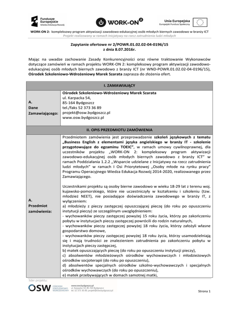 WORK-ON 2: kompleksowy program aktywizacji zawodowo-edukacyjnej osób młodych biernych zawodowo w branży ICT Projekt realizowany w ramach Inicjatywy na rzecz zatrudnienia ludzi młodych Zapytanie ofertowe nr 2/POWR.01.02.02-04-0196/15 z dnia 8.07.2016r. Mając na uwadze zachowanie Zasady Konkurencyjności oraz równe traktowanie Wykonawców dotyczące zamówień w ramach projektu WORK-ON 2: kompleksowy program aktywizacji zawodowoedukacyjnej osób młodych biernych zawodowo z branży ICT (nr WND-POWR.01.02.02-04-0196/15), Ośrodek Szkoleniowo-Wdrożeniowy Marek Szarata zaprasza do złożenia ofert. I. ZAMAWIAJĄCY Ośrodek Szkoleniowo-Wdrożeniowy Marek Szarata ul. Karpacka 54, A. 85-164 Bydgoszcz Dane tel./faks 52 373 36 89 Zamawiającego: [email protected] www.osw.bydgoszcz.pl II. OPIS PRZEDMIOTU ZAMÓWIENIA Przedmiotem zamówienia jest przeprowadzenie szkoleń językowych z tematu „Business English z elementami języka angielskiego w branży IT - szkolenie przygotowujące do egzaminu TOEIC”, w ramach umowy cywilnoprawnej, dla uczestników projektu „WORK-ON 2: kompleksowy program aktywizacji zawodowo-edukacyjnej osób młodych biernych zawodowo z branży ICT” w ramach Poddziałania 1.2.2 ,,Wsparcie udzielane z Inicjatywy na rzecz zatrudnienia ludzi młodych” w ramach I Osi Priorytetowej „Osoby młode na rynku pracy” Programu Operacyjnego Wiedza Edukacja Rozwój 2014-2020, realizowanego przez Zamawiającego. A. Przedmiot zamówienia: Uczestnikami projektu są osoby bierne zawodowo w wieku 18-29 lat z terenu woj. kujawsko-pomorskiego, które nie uczestniczyły w kształceniu i szkoleniu (tzw. młodzież NEET), nie posiadające doświadczenia zawodowego w branży IT, z wyłączeniem: a) młodzieży z pieczy zastępczej opuszczającej pieczę (do roku po opuszczeniu instytucji pieczy) ze szczególnym uwzględnieniem: - wychowanków pieczy zastępczej powyżej 15 roku życia, którzy po zakończeniu pobytu w instytucjach pieczy zastępczej powrócili do rodzin naturalnych, - wychowanków pieczy zastępczej powyżej 18 roku życia, którzy założyli własne gospodarstwo domowe, - wychowanków pieczy zastępczej powyżej 18 roku życia, którzy usamodzielniają się i mają trudności ze znalezieniem zatrudnienia po zakończeniu pobytu w instytucjach pieczy zastępczej, b) matek opuszczających pieczę (do roku po opuszczeniu instytucji pieczy), c) absolwentów młodzieżowych ośrodków wychowawczych i młodzieżowych ośrodków socjoterapii (do roku po opuszczeniu), d) absolwentów specjalnych ośrodków szkolno-wychowawczych i specjalnych ośrodków wychowawczych (do roku po opuszczeniu), e) matek przebywających w domach samotnej matki, Strona 1 WORK-ON 2: kompleksowy program aktywizacji zawodowo-edukacyjnej osób młodych biernych zawodowo w branży ICT Projekt realizowany w ramach Inicjatywy na rzecz zatrudnienia ludzi młodych f) osób młodych opuszczających zakłady karne lub areszty śledcze (do roku po opuszczeniu). B. Cel zamówienia: Celem zamówienia jest wyłonienie Trenerów do przeprowadzenia szkoleń językowych z tematu „Business English z elementami języka angielskiego w branży IT - szkolenie przygotowujące do egzaminu TOEIC”. C. Kod CPV: Kod określony przez Wspólny 80500000-9 „Usługi szkoleniowe” D. Harmonogram realizacji, lokalizacja i inne warunki świadczenia usługi: 1. Szkolenia odbywać się będą w siedzibie Zamawiającego w Bydgoszczy. 2. W szkoleniach weźmie udział 36 osób (3 grupy po 12 osób). 3. Szkolenia odbywać się będą w okresie od sierpnia do listopada 2016 roku od poniedziałku do piątku w godzinach od 8:00 do 18:00 zgodnie z harmonogramem zajęć. 4. Za rekrutację uczestników odpowiada Zamawiający. 5. Oferent jako personel projektu (w rozumieniu Wytycznych w zakresie kwalifikowalności wydatków w ramach Europejskiego Funduszu Rozwoju Regionalnego, Europejskiego Funduszu Spójności na lata 2014-2020) ma obowiązek osobistego wykonania usługi. 6. Wyklucza się możliwość podzlecania usług. 7. Do obowiązków Oferenta należało będzie: a) ustalenie szczegółowego programu zajęć, b) opracowanie merytoryczne materiałów szkoleniowych i udostępnienie ich uczestnikom projektu, c) prowadzenie zajęć dydaktycznych zgodnie z harmonogramem określonym przez Zamawiającego, d) prowadzenie dziennika zajęć, e) opracowanie i przeprowadzenie pre-testów i post-testów wiedzy wśród uczestników projektu, f) przygotowanie uczestników do egzaminu zewnętrznego TOEIC - LISTENING and READING. 8. Oferent w okresie świadczenia usługi szkoleniowej powinien prowadzić ewidencję godzin i zadań realizowanych w ramach projektu. Łączne zaangażowanie zawodowe w realizację wszystkich projektów finansowanych z funduszy strukturalnych i Funduszu Spójności oraz działań finansowanych z innych źródeł, w tym środków własnych i innych podmiotów nie może przekroczyć 276 godzin miesięcznie. C. Tematy szkoleń i liczba godzin: Słownik Zamówień (CPV): Zakres usługi obejmować będzie prowadzenie szkolenia „Business English z elementami języka angielskiego w branży IT - szkolenie przygotowujące do egzaminu TOEIC” w wymiarze 120 godzin dla każdej z 3 grup szkoleniowych (łącznie 360godz.). Jako godzinę szkolenia rozumie się godzinę lekcyjną (45 minut). Uczestnicy na szkoleniu powinni zostać przygotowywani do pracy w języku angielskim w branży IT oraz zdania egzaminu zewnętrznego TOEIC- LISTENING and READING. Zakres szkolenia powinien dotyczyć poziomu samodzielności B1/B2. Strona 2 WORK-ON 2: kompleksowy program aktywizacji zawodowo-edukacyjnej osób młodych biernych zawodowo w branży ICT Projekt realizowany w ramach Inicjatywy na rzecz zatrudnienia ludzi młodych D. Inne warunki: 1. W toku badania i oceny ofert Zamawiający zastrzega sobie prawo do weryfikacji oświadczeń zawartych w ofercie i CV oraz może zażądać od Oferentów dodatkowych dokumentów potwierdzających w/w oświadcze