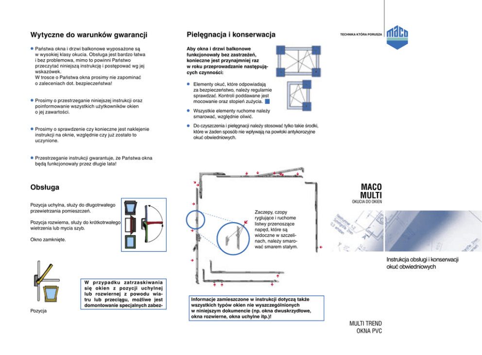 Wytyczne do warunków gwarancji • Państwa okna i drzwi balkonowe wyposażone są w wysokiej klasy okucia. Obsługa jest bardzo łatwa i bez problemowa, mimo to powinni Państwo przeczytać niniejszą instrukcję i postępować wg jej wskazówek. W trosce o Państwa okna prosimy nie zapominać o zaleceniach dot. bezpieczeństwa! • Prosimy o przestrzeganie niniejszej instrukcji oraz poinformowanie wszystkich użytkowników okien o jej zawartości. • Prosimy o sprawdzenie czy konieczne jest naklejenie instrukcji na oknie, względnie czy już zostało to uczynione. Pielęgnacja i konserwacja TECHNIKA KTÓRA PORUSZA Aby okna i drzwi balkonowe funkcjonowały bez zastrzeżeń, konieczne jest przynajmniej raz w roku przeprowadzanie następujących czynności: • • • Elementy okuć, które odpowiadają za bezpieczeństwo, należy regularnie sprawdzać. Kontroli poddawane jest mocowanie oraz stopień zużycia. Wszystkie elementy ruchome należy smarować, względnie oliwić. Do czyszczenia i pielęgnacji należy stosować tylko takie środki, które w żaden sposób nie wpływają na powłoki antykorozyjne okuć obwiedniowych. • Przestrzeganie instrukcji gwarantuje, że Państwa okna będą funkcjonowały przez długie lata! Á Ë Ë MACO MULTI Ë OKUCIA DO OKIEN Ë Ó Pozycja rozwierna, służy do krótkotrwałego wietrzenia lub mycia szyb. Ë Pozycja uchylna, służy do długotrwałego przewietrzania pomieszczeń. Ë Ë Ó Obsługa Ë Okno zamknięte. Zaczepy, czopy ryglujące i ruchome listwy przenoszące napęd, które są widoczne w szczelinach, należy smarować smarem stałym. Ë Instrukcja obsługi i konserwacji okuć obwiedniowych Pozycja Ë Ë W przypadku zatrzaskiwania się okien z pozycji uchylnej lub rozwiernej z powodu wiatru lub przeciągu, możliwe jest domontowanie specjalnych zabez- Ë Ë Ë Informacje zamieszczone w instrukcji dotyczą także wszystkich typów okien nie wyszczególnionych w niniejszym dokumencie (np. okna dwuskrzydłowe, okna rozwierne, okna uchylne itp.)! MULTI TREND OKNA PVC Zagrożenie skaleczeniem (przygnieceniem) gdy np. dłoń dostanie się pomiędzy ramę, a zamykane skrzydło. Niebezpieczeństwo wypadnięcia przez okno. Niebezpieczeństwo zranienia przez otwarte skrzydło w czasie działania silnego wiatru. Nie obciążać skrzydeł w żaden sposób. Nie uderzać otwartym skrzydłem w ścianę lub węgarek. Nie umieszczać żadnych przedmiotów pomiędzy skrzydłem a ramą. Ogólne wskazówki dotyczące okien Nowoczesne okno spełnia wiele funkcji i nie służy tylko do zapewnienia oświetlenia i wentylacji: Okno nadaje kształt elewacji i stanowi ważny element wyposażenia budynku, który wymaga stosowania najnowocześniejszych rozwiązań technicznych. Poza pielęgnacją okuć powinni Państwo zwrócić uwagę na stan powierzchni zewnętrznej, szyb, uszczelek. W razie potrzeby wszystkie uszkodzenia należy niezwłocznie naprawić. Do mycia i czyszczenia można stosować tylko takie środki, które nie rysują powierzchni! Do producentów i montażystów okien: Regulacje okien Wszystkie regulacje, wymiana części, wyjmowanie i zawieszanie skrzydeł, powinien przeprowadzać wyłącznie zakład specjalistyczny. Producentów okien prosimy o zwrócenie szczególnej uwagi na wykonanie poniższych czynności, ponieważ za montaż tych elementów producent okuć nie ponosi odpowiedzialności! Regulacja podnośnika: Poluzować śrubę kluczem Torx T15, przestawić wysokość i dokręcić śrubę. Wyjmowanie i zawieszanie skrzydeł: Chwilowe wyłączanie funkcji blokady błędnego położenia klamki: przytrzymując palcem, podnośnik ustawić w pozycji pionowej. Klamkę można przestawić w dowolną pozycję. Podnoszenie lub opuszczanie na nożycy: Klucz imbusowy 4mm. Docisk na nożycy: Klucz imbusowy 4 mm. Zawieszanie: Skrzydło zawiesić i zamknąć okno (nie ryglować). Trzpień zawiasu wcisnąć do momentu zatrzaśnięcia się trzpienia w zawiasie. � Osobom kupującym okna i drzwi zalecamy, aby ich montaż koniecznie zlecać odpowiednim fachowcom. Regulacja docisku: Torx T20. Docisk lekki Docisk normalny. Jest to standardowa pozycja okuć. Docisk mocny Wzrokowa kontrola położenia trzpieni zawiasów jest niezbędna (zobacz rysunek)! Nie stosowanie niniejszych zaleceń grozi wypadnięciem skrzydła! Regulacja na zawiasach: W pionie i w poziomie klucz imbusowy 4 mm. Czopy zamykające Wyjmowanie: Przy zamkniętym skrzydle przesunąć w dół trzpień zawiasu górnego. Śruba regulacyjna może wystawać max. 1mm! Strona przylgi Wskazówki dotyczące użytkowania Czopy i.S. MAYER & CO BESCHLÄGE GMBH ALPENSTRASSE 173 A-5020 SALZBURG TEL +43 (0)662 6196-0 FAX +43 (0)662 6196-101 E-Mail: [email protected] www.maco.at MACO POLSKA SP.Z O.O. ul. Gliwicka 1a 42-677 Czekanów TEL +48 (32) 305 09 02÷4 FAX +48 (32) 305 09 01 E-Mail: [email protected] www.maco.pl Nr. 49335 Maj 2004 Wszelkie prawa zastrzeżone!