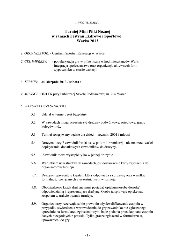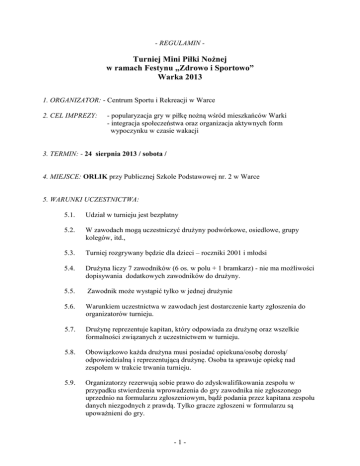 - REGULAMIN - Turniej Mini Piłki Nożnej w ramach Festynu „Zdrowo i Sportowo” Warka 2013 1. ORGANIZATOR: - Centrum Sportu i Rekreacji w Warce 2. CEL IMPREZY: - popularyzacja gry w piłkę nożną wśród mieszkańców Warki - integracja społeczeństwa oraz organizacja aktywnych form wypoczynku w czasie wakacji 3. TERMIN: - 24 sierpnia 2013 / sobota / 4. MIEJSCE: ORLIK przy Publicznej Szkole Podstawowej nr. 2 w Warce 5. WARUNKI UCZESTNICTWA: 5.1. Udział w turnieju jest bezpłatny 5.2. W zawodach mogą uczestniczyć drużyny podwórkowe, osiedlowe, grupy kolegów, itd., 5.3. Turniej rozgrywany będzie dla dzieci – roczniki 2001 i młodsi 5.4. Drużyna liczy 7 zawodników (6 os. w polu + 1 bramkarz) - nie ma możliwości dopisywania dodatkowych zawodników do drużyny. 5.5. Zawodnik może wystąpić tylko w jednej drużynie 5.6. Warunkiem uczestnictwa w zawodach jest dostarczenie karty zgłoszenia do organizatorów turnieju. 5.7. Drużynę reprezentuje kapitan, który odpowiada za drużynę oraz wszelkie formalności związanych z uczestnictwem w turnieju. 5.8. Obowiązkowo każda drużyna musi posiadać opiekuna/osobę dorosłą/ odpowiedzialną i reprezentującą drużynę. Osoba ta sprawuje opiekę nad zespołem w trakcie trwania turnieju. 5.9. Organizatorzy rezerwują sobie prawo do zdyskwalifikowania zespołu w przypadku stwierdzenia wprowadzenia do gry zawodnika nie zgłoszonego uprzednio na formularzu zgłoszeniowym, bądź podania przez kapitana zespołu danych niezgodnych z prawdą. Tylko gracze zgłoszeni w formularzu są upoważnieni do gry. -1- 6. SYSTEM ROZGRYWEK 6.1. Rozgrywki prowadzone są dla dzieci roczniki 2001 i młodsi Wg. harmonogramu: 14.30 – 15.00 – zgłoszenia drużyn (dokonuje kapitan) 15.00 – 19.00 – rozgrywki 6.4. 6.2. Po zamknięciu listy dopuszczonych zespołów organizator opracowuje szczegółowy harmonogram turnieju. System rozgrywek uzależniony od ilości zgłoszonych zespołów. 6.3. Punktacja: za zwycięstwo drużyna otrzymuje 3 pkt, za remis 1 pkt., za przegrany 0 pkt. O kolejności miejsc kolejno decyduje: - większa liczba zdobytych punktów - wynik bezpośredniego spotkania - korzystniejsza różnica bramek - większa liczba bramek zdobytych 7. STROJE ZAWODNIKÓW 7.1. Warunkiem uczestnictwa zawodnika w turnieju jest posiadanie kompletnego stroju sportowego ( koszulka, spodenki sportowe i obuwie umożliwiające grę w piłkę nożną) 7.2. Zespół nie musi posiadać jednolitych strojów 7.3. Zabronione są buty piłkarskie tzw. wkręty. 8. ZASADY I PRZEPISY GRY: 8.1. Mecze rozgrywane są na boiskach ze sztuczną murawą typu Orlik. 8.2. Mecz sędziuje sędzia, wyznaczony przez organizatora. 8.3. Czas gry: 1 x 10 min (czas może ulec zmianie w zależności od ilości zespołów) 8.4. Obowiązują przepisy gry w piłkę nożną z wyłączeniem przepisu o spalonym oraz korektą przepisu o ilości zawodników, zmianach, karach. 8.5 Na boisku znajduje się 7 zawodników ( 6 os. w polu + bramkarz) 8.6. Każda gra musi rozpocząć się udziałem zawodników składających się z graczy uprzednio zgłoszonych do turnieju. -2- 8.7. Kara indywidualna (żółta kartka) zostaje zastąpiona kara czasową: 2 min 8.8 Za brutalna grę lub nie sportowe zachowanie - decyzją sędziego jest wykluczenie zawodnika z gry ( czerwona kartka) 8.9. Brutalność w grze lub złe zachowanie całej drużyny podczas turnieju może doprowadzić do wykluczenia jej z rywalizacji. 8.10. Sprawy sporne na boisku rozstrzyga tylko i wyłącznie sędzia główny. 9. POSTANOWIENIA OGÓLNE: 9.1. Organizator zapewnia: sprzęt sportowy, pierwszą pomoc medyczną, sędziów. 9.2. Organizator zawodów nie bierze odpowiedzialności za wszelkie urazy i kontuzje zawodników powstałe w trakcie turnieju. 9.3. Rodzice uczestników turnieju składają pisemne oświadczenie, że wyrażają zgodę na udział dziecka w Turnieju na własna odpowiedzialność i nie będą wnosić u organizatora żadnych roszczeń z tytułu strat materialnych i uszczerbku na zdrowiu powstałych na skutek udziału w zawodach. 9.4. Zawodnicy odpowiadają materialnie za szkody wyrządzone podczas trwania turnieju niezgodne z regulaminem użytkowania boisk. 9.5. Za rzeczy materialne pozostawione na terenie kompleksu sportowego organizator nie odpowiada 9.6. Uczestnicy turnieju przystępujący do rozgrywek zapoznali się z regulaminem i akceptują jego założenia 9.7. Organizatorzy zastrzegają sobie prawo do zmiany regulaminu. W przypadku istotnych zmian zobowiązuje się do powiadomienia zawodników o zmianach w regulaminie. Opracowali: K. Nowakowska G. Dacka -3- - KARTA ZGŁOSZENIOWA DRUŻYNY– TURNIEJ MINI PIŁKI NOŻNEJ Warka 2013 NAZWA ZESPOŁU KAPITAN OPIEKUN ZESPOŁU LISTA ZAWODNIKÓW : IMIĘ I NAZWISKO ZAWODNIKA L.P ROK URODZENIA 1 2 3 4 5 6 7 STWIERDZAM , ŻE ZAPOZNAŁEM SIĘ Z REGULAMINEM TURNIEJU I GO AKCEPTUJĘ ORAZ BIORĘ PEŁNĄ ODPOWIEDZIALNOŚĆ ZA WYŻEJ WYMIENIONE OSOBY I ICH ZACHOWANIE PODCZAS TURNIEJU. POTWIERDZAM ZE WYŻEJ WYMIENIENI ZAWODNICY NIE POSIADAJĄ PRZECIWSKAZAŃ DO GRY W PIŁKĘ NOŻNĄ Warka 24.08.2013 r. …….…………………….. /podpis opiekuna drużyny/ -4-