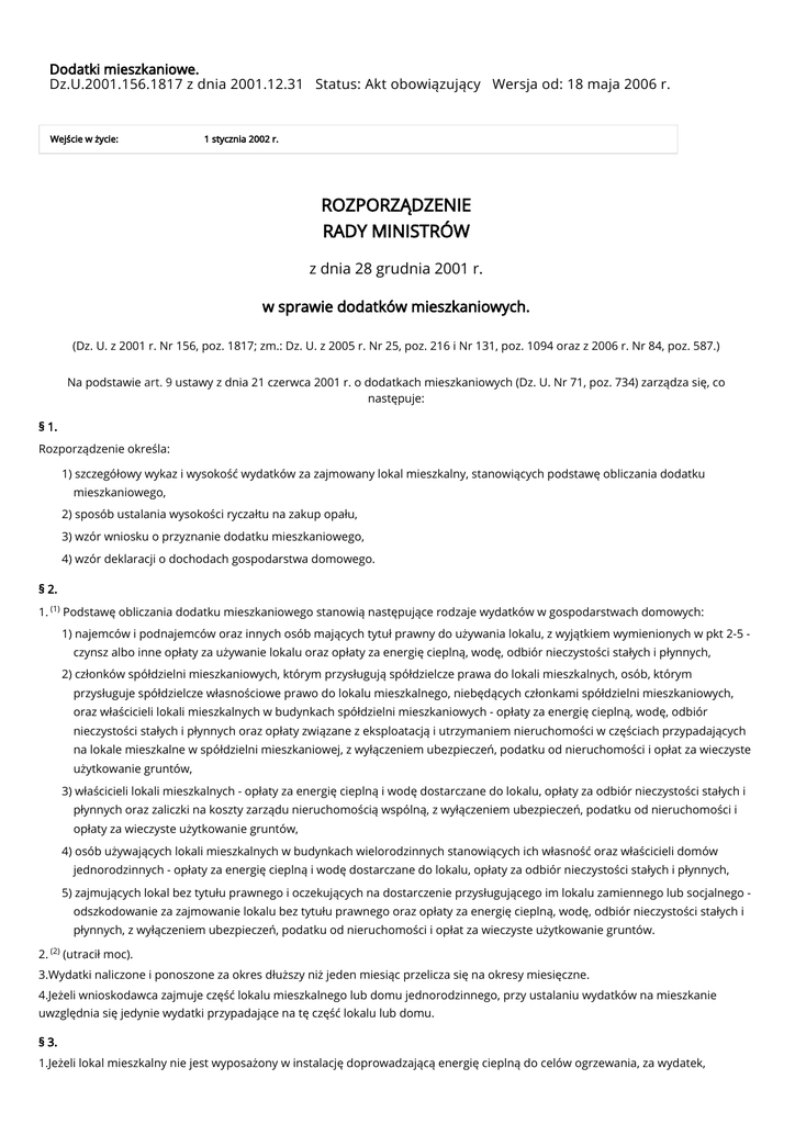 Dodatki mieszkaniowe. Dz.U.2001.156.1817 z dnia 2001.12.31 Status: Akt obowiązujący Wersja od: 18 maja 2006 r. Wejście w życie: 1 stycznia 2002 r. ROZPORZĄDZENIE RADY MINISTRÓW z dnia 28 grudnia 2001 r. w sprawie dodatków mieszkaniowych. (Dz. U. z 2001 r. Nr 156, poz. 1817; zm.: Dz. U. z 2005 r. Nr 25, poz. 216 i Nr 131, poz. 1094 oraz z 2006 r. Nr 84, poz. 587.) Na podstawie art. 9 ustawy z dnia 21 czerwca 2001 r. o dodatkach mieszkaniowych (Dz. U. Nr 71, poz. 734) zarządza się, co następuje: § 1. Rozporządzenie określa: 1) szczegółowy wykaz i wysokość wydatków za zajmowany lokal mieszkalny, stanowiących podstawę obliczania dodatku mieszkaniowego, 2) sposób ustalania wysokości ryczałtu na zakup opału, 3) wzór wniosku o przyznanie dodatku mieszkaniowego, 4) wzór deklaracji o dochodach gospodarstwa domowego. § 2. 1. (1) Podstawę obliczania dodatku mieszkaniowego stanowią następujące rodzaje wydatków w gospodarstwach domowych: 1) najemców i podnajemców oraz innych osób mających tytuł prawny do używania lokalu, z wyjątkiem wymienionych w pkt 2-5 czynsz albo inne opłaty za używanie lokalu oraz opłaty za energię cieplną, wodę, odbiór nieczystości stałych i płynnych, 2) członków spółdzielni mieszkaniowych, którym przysługują spółdzielcze prawa do lokali mieszkalnych, osób, którym przysługuje spółdzielcze własnościowe prawo do lokalu mieszkalnego, niebędących członkami spółdzielni mieszkaniowych, oraz właścicieli lokali mieszkalnych w budynkach spółdzielni mieszkaniowych - opłaty za energię cieplną, wodę, odbiór nieczystości stałych i płynnych oraz opłaty związane z eksploatacją i utrzymaniem nieruchomości w częściach przypadających na lokale mieszkalne w spółdzielni mieszkaniowej, z wyłączeniem ubezpieczeń, podatku od nieruchomości i opłat za wieczyste użytkowanie gruntów, 3) właścicieli lokali mieszkalnych - opłaty za energię cieplną i wodę dostarczane do lokalu, opłaty za odbiór nieczystości stałych i płynnych oraz zaliczki na koszty zarządu nieruchomością wspólną, z wyłączeniem ubezpieczeń, podatku od nieruchomości i opłaty za wieczyste użytkowanie gruntów, 4) osób używających lokali mieszkalnych w budynkach wielorodzinnych stanowiących ich własność oraz właścicieli domów jednorodzinnych - opłaty za energię cieplną i wodę dostarczane do lokalu, opłaty za odbiór nieczystości stałych i płynnych, 5) zajmujących lokal bez tytułu prawnego i oczekujących na dostarczenie przysługującego im lokalu zamiennego lub socjalnego odszkodowanie za zajmowanie lokalu bez tytułu prawnego oraz opłaty za energię cieplną, wodę, odbiór nieczystości stałych i płynnych, z wyłączeniem ubezpieczeń, podatku od nieruchomości i opłat za wieczyste użytkowanie gruntów. 2. (2) (utracił moc). 3.Wydatki naliczone i ponoszone za okres dłuższy niż jeden miesiąc przelicza się na okresy miesięczne. 4.Jeżeli wnioskodawca zajmuje część lokalu mieszkalnego lub domu jednorodzinnego, przy ustalaniu wydatków na mieszkanie uwzględnia się jedynie wydatki przypadające na tę część lokalu lub domu. § 3. 1.Jeżeli lokal mieszkalny nie jest wyposażony w instalację doprowadzającą energię cieplną do celów ogrzewania, za wydatek, stanowiący podstawę obliczania ryczałtu na zakup opału, uznaje się równowartość 5 kilowatogodzin energii elektrycznej2 według rachunku za ostatni okres rozliczeniowy, z wyłączeniem opłaty abonamentowej oraz stałych opłat miesięcznych, na 1 m normatywnej powierzchni użytkowej, o której mowa w art. 5, z uwzględnieniem art. 6 ust. 9 ustawy z dnia 21 czerwca 2001 r. o dodatkach mieszkaniowych. 2.Jeżeli lokal mieszkalny nie jest wyposażony w instalację ciepłej wody, za wydatek, stanowiący podstawę obliczania ryczałtu na zakup opału, uznaje się równowartość 20 kilowatogodzin energii elektrycznej według rachunku za ostatni okres rozliczeniowy, z wyłączeniem opłaty abonamentowej oraz stałych opłat miesięcznych, na każdego członka gospodarstwa. 3.Jeżeli lokal mieszkalny nie jest wyposażony w instalację gazu przewodowego, za wydatek, stanowiący podstawę obliczania ryczałtu na zakup opału, uznaje się równowartość 10 kilowatogodzin energii elektrycznej w gospodarstwie jednoosobowym według rachunku za ostatni okres rozliczeniowy, z wyłączeniem opłaty abonamentowej i stałych opłat miesięcznych, oraz równowartość 2 kilowatogodzin na każdą dodatkową osobę. § 4. 1.W celu ustalenia wysokości ryczałtu na zakup opału, wydatki wnioskodawcy, o których mowa w § 2 ust. 1, sumuje się z wydatkami, o których mowa w § 3, a następnie oblicza się wskaźnik procentowy odpowiadający udziałowi wydatków, o których mowa w § 3, w łącznej kwocie wydatków. 2.Kwota ryczałtu na zakup opału będąca częścią dodatku mieszkaniowego, która jest wypłacana do rąk wnioskodawcy, stanowi iloczyn obliczonego dodatku mieszkaniowego i wskaźnika, o którym mowa w ust. 1. § 5. 1.Osoba ubiegająca się o przyznanie dodatku mieszkaniowego powinna złożyć w urzędzie właściwej gminy: 1) wniosek o przyznanie dodatku mieszkaniowego, według wzoru stanowiącego załącznik nr 1 do rozporządzenia, 2) deklarację o wysokości dochodów gospodarstwa domowego, według wzoru stanowiącego załącznik nr 2 do rozporządzenia. 2.Wnioskodawca będący właścicielem domu jednorodzinnego powinien złożyć ponadto zaświadczenie organu właściwego w sprawie wydania pozwolenia na budowę, potwierdzające powierzchnię użytkową, w tym łączną powierzchnię pokoi i kuchni, oraz wyposażenie techniczne domu, a także przedstawić rachunki dotyczące wydatków, o których mowa w § 2 ust. 1 pkt 4. § 6. Rozporządzenie wchodzi w życie z dniem 1 stycznia 2002 r. ZAŁĄCZNIKI ZAŁĄCZNIK Nr 1 WNIOSEK o przyznanie dodatku mieszkaniowego 1. Wnioskodawca................................................ (imię i