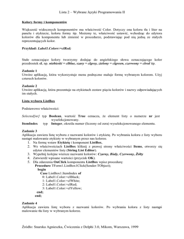 Lista 2 – Wybrane Języki Programowania II Kolory formy i komponentów Większość widocznych komponentów ma właściwość Color. Dotyczy ona koloru tła i liter na panelu i etykiecie, koloru formy itp. Możemy te, właściwość ustawić, wchodząc do edytora kolorów dla komponentu lub zmienić w procedurze, podstawiając pod nią jedną ze stałych reprezentujących kolor. Przykład: Label1.Colorr:=clRed; Stałe oznaczające kolory tworzymy dodając do angielskiego słowa oznaczającego kolor przedrostek cl, np. niebieski = clblue, szary = clgrey, zielony = clgreen, czerwony = clred itp. Zadanie 1 Utwórz aplikację, która wykorzystuje menu podręczne maluje formę wybranym kolorem. Użyj czterech kolorów. Zadanie 2 Utwórz aplikację, która prezentuje na etykietach zestaw pięciu kolorów i nazwy odpowiadających im stałych. Lista wyboru ListBox Podstawowe właściwości: Selected[nr] typ Boolean, wartość True oznacza, że element listy o numerze nr jest wyselekcjonowany. ItemIndex typ Integer, określa numer (liczony od zera) wyselekcjonowanego elementu. Zadanie 3 Aplikacja zawiera listę wyboru z nazwami kolorów i etykietę. Po wybraniu koloru z listy wyboru nastąpi malowanie etykiety w wybranym przez nas kolorze. 1. Na formę wstaw Etykietę i komponent ListBox, 2. We właściwościach ListBox kliknij z prawej strony właściwości Items, otworzy się edytor elementów listy (String List Editor). 3. Wypełnij kolejne wiersze nazwami kolorów: Czarny, Biały, Czerwony, Żółty 4. Zatwierdź wpisane wartości (przycisk OK). 5. Dla zdarzenia OnClick komponentu ListBox wpisz procedurę: Procedure TForm1.ListBox1Click(Sender:TObject); begin Case ListBox1.ItemIndex of 0: Label1.Color:=clBlack; 1: Label1.Color:=clWhite; 2: Label1.Color:=clRed; 3: Label1.Color:=clYellow; end; end; Zadanie 4 Aplikacja zawiera listę wyboru z nazwami kolorów. Po wybraniu koloru z listy nastąpi malowanie tła listy w wybranym kolorze. Źródło: Snarska Agnieszka, Ćwiczenia z Delphi 3.0, Mikom, Warszawa, 1999 Lista 2 – Wybrane Języki Programowania II 1. Na formę wstaw Etykietę i komponent ListBox. 2. Zbuduj listę wyboru z elementów: Niebieski, Żółty, Czerwony. 3. Dla zdarzenia OnClick komponentu ListBox wpisz procedurę: Procedure TForm1.ListBox1Click (Sender: TObject); Begin if ListBox1.Selected[0] then ListBox1.Color:=clBlue; if ListBox1.Selected[1] then ListBox1.Color:=clYellow; if ListBox1.Selected[2] then ListBox1.Color:=clRed; end; 4. Sprawdź działanie Zadanie 5 Utwórz listę wyboru, której zadaniem będzie: − powiększanie i zmniejszanie rozmiarów panelu – właściwości Panel1.Height; − wypisywanie na etykiecie indeksu wybranego elementu Label1.Caption:=IntToStr(ListBox1.ItemIndex+1); − ustawienie koloru formy : właściwości Form1.Color; − ustawienie koloru tła listy wyboru: właściwości ListBox1.Color. Pole edycji z lista wyboru ComboBox Pole to umożliwia połączenie wyboru z listy z edycją nowego lub poprawieniem wybranego elementu Podstawowe właściwości: Selected[nr] typ Boolean, wartość True oznacza, że element listy o numerze nr jest wyselekcjonowany, ItemIndex typ Integer, określa numer (liczony od zera) wyselekcjonowanego elementu, Text typ String, określa zawartość okienka edycyjnego listy ComboBox Zadanie 6 1. Aplikacja zawiera listę ComboBox z imionami i etykietę. Element wybrany z listy jest wyświetlany na etykiecie. 2. Na formie wstaw komponenty Label i ComboBox. 3. Uzupełnij we właściwościach Items elementy wyboru: Ania, Kasia, Jola. 4. Dla zdarzenia OnChange komponentu ComboBox wpisz treść procedury: Procedure TForm1.ComboBox1Change(Sender:TObject); Begin Label1.Caption:=ComboBox1.Text; End. 5. Przekopiuj treść procedury OnChange do procedury OnKeyDown. 6. Sprawdź działanie listy. Zadanie 7 Zadaniem programu jest wypisanie na etykiecie wybranego z listy nazwiska ucznia, wybranej klasy i profilu klasy w formie: Uczeń Karol uczęszcza do klasy //profil: humanistyczny. Fragmenty tekstu wpisane kursywą to elementy list wyboru. Źródło: Snarska Agnieszka, Ćwiczenia z Delphi 3.0, Mikom, Warszawa, 1999 Lista 2 – Wybrane Języki Programowania II Przyciski Opcji (RadioButton) Wybór jednego z pośród kilku elementów. Możemy je umieści w oknie GroupBox, wtedy działają jak przełączniki, lub umieszczać bezpośrednio na formie. Podstawowe właściwości: Caption typ String, widoczny napis przycisku; Checked typ Boolean, wartość True oznacza, że przycisk jest włączony. Zadanie 8 Aplikacja zawiera przycisk opcji i Panel. Przyciski opcji opisane są nazwami kolorów. Po wyborze odpowiedniego przycisku następuje malowanie komponentu Panel wybranym kolorem. 1. Umieść na formie komponenty Panel i GroupBox z zakładki Standard. 2. Dodaj trzy przyciski typu RadioButton, umieszczając je wewnątrz komponentu GroupBox. 3. Zmień Caption przycisków RadioButton na czerwony, zielony, niebieski. 4. Do przycisku z napisem zielony podepnij procedurę zdarzenia OnClick: procedure TForm1.RadioButton2Click(Sender:TObject); begin if RadioButton2.Checked then Panel1.Color:=clGreen; if RadioButton2.Checked then Panel1.Color:=clGreen; end. 5. Podobnie dla pozostałych przycisków, zmieniając kolory. 6. Dla przycisku z napisem czerwony ustaw właściwość Checked na True. Komponent RadioGroup Komponent ten umożliwia generowanie przycisków opcji. Przyciski generujemy za pomocą String List Editora, który uaktywniamy, klikając w polu właściwości Items.. Dodatkowo mamy możliwość umieszczenia przycisków w kilku kolumnach. Podstawowe właściwości: Columns typ Integer, określa ilość kolumn z przyciskami; Items typ łańcuchowy, jest to napis widoczny przy przycisku, ItemIndex typ Integer, określa numer wybranego przez użytkownika przycisku. Zadanie 9 Przyciskami opcji wybieramy kolor czcionki w oknie RichEdit. Przyciski opisane są nazwami kolorów, nazwy te odbierane są na etykiecie. 1. Na formie umieć etykiet
