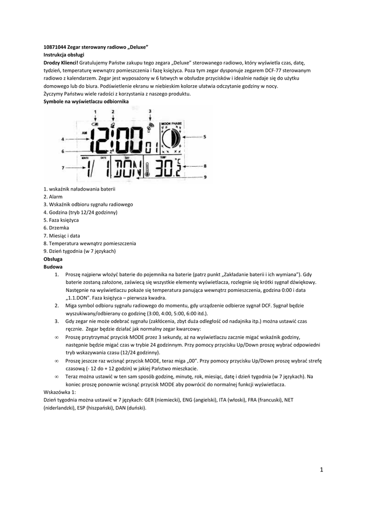 10871044 Zegar sterowany radiowo „Deluxe” Instrukcja obsługi Drodzy Klienci! Gratulujemy Państw zakupu tego zegara „Deluxe” sterowanego radiowo, który wyświetla czas, datę, tydzień, temperaturę wewnątrz pomieszczenia i fazę księżyca. Poza tym zegar dysponuje zegarem DCF-77 sterowanym radiowo z kalendarzem. Zegar jest wyposażony w 6 łatwych w obsłudze przycisków i idealnie nadaje się do użytku domowego lub do biura. Podświetlenie ekranu w niebieskim kolorze ułatwia odczytanie godziny w nocy. Życzymy Państwu wiele radości z korzystania z naszego produktu. Symbole na wyświetlaczu odbiornika 1. wskaźnik naładowania baterii 2. Alarm 3. Wskaźnik odbioru sygnału radiowego 4. Godzina (tryb 12/24 godzinny) 5. Faza księżyca 6. Drzemka 7. Miesiąc i data 8. Temperatura wewnątrz pomieszczenia 9. Dzień tygodnia (w 7 językach) Obsługa Budowa 1. Proszę najpierw włożyć baterie do pojemnika na baterie (patrz punkt „Zakładanie baterii i ich wymiana”). Gdy baterie zostaną założone, zaświecą się wszystkie elementy wyświetlacza, rozlegnie się krótki sygnał dźwiękowy. Następnie na wyświetlaczu pokaże się temperatura panująca wewnątrz pomieszczenia, godzina 0:00 i data „1.1.DON”. Faza księżyca – pierwsza kwadra. 2. Miga symbol odbioru sygnału radiowego do momentu, gdy urządzenie odbierze sygnał DCF. Sygnał będzie wyszukiwany/odbierany co godzinę (3:00, 4:00, 5:00, 6:00 itd.). 3. Gdy zegar nie może odebrać sygnału (zakłócenia, zbyt duża odległość od nadajnika itp.) można ustawić czas ręcznie. Zegar będzie działać jak normalny zegar kwarcowy: • Proszę przytrzymać przycisk MODE przez 3 sekundy, aż na wyświetlaczu zacznie migać wskaźnik godziny, następnie będzie migać czas w trybie 24 godzinnym. Przy pomocy przycisku Up/Down proszę wybrać odpowiedni tryb wskazywania czasu (12/24 godzinny). • Proszę jeszcze raz wcisnąć przycisk MODE, teraz miga „00”. Przy pomocy przycisku Up/Down proszę wybrać strefę czasową (- 12 do + 12 godzin) w jakiej Państwo mieszkacie. • Teraz można ustawić w ten sam sposób godzinę, minutę, rok, miesiąc, datę i dzień tygodnia (w 7 językach). Na koniec proszę ponownie wcisnąć przycisk MODE aby powrócić do normalnej funkcji wyświetlacza. Wskazówka 1: Dzień tygodnia można ustawić w 7 językach: GER (niemiecki), ENG (angielski), ITA (włoski), FRA (francuski), NET (niderlandzki), ESP (hiszpański), DAN (duński). 1 Wskazówka 2: Nawet, jeśli dokonaliście Państwo ręcznych ustawień czasu, urządzenie będzie co godzinę podejmować próbę odbioru sygnału radiowego. Gdy urządzenie odbierze sygnał, zmieni ustawiony ręcznie czas na czas zgodny z odebranym sygnałem. Podczas każdej próby odbioru sygnału miga symbol odbioru sygnału radiowego. Jeśli sygnał nie został odnaleziony, symbol odbioru sygnału znika aż do momentu, gdy o kolejnej pełnej godzinie zostanie podjęta ponowna próba odbioru sygnału. Ustawianie czasu alarmu Proszę przez 2 sekundy przytrzymać wciśnięty przycisk ALARM. Przy pomocy przycisku Up/Down można ustawić pożądaną godzinę i minutę. Następnie proszę ponownie wcisnąć przycisk ALARM, aby powrócić do normalnej funkcji wyświetlacza. Włączanie/wyłączanie alarmu Proszę raz wcisnąć przycisk ALARM aby go aktywować. Na wyświetlaczu pojawi się symbol dzwoneczka. Gdy rozlegnie się alarm proszę wcisnąć dowolny przycisk, oprócz przycisku „Drzemka” aby go wyłączyć. Termometr Proszę wcisnąć przycisk „DOWN” aby wybrać °C lub °F. Podświetlenie wyświetlacza i włączanie/wyłączanie funkcji drzemki Gdy jest ciemno proszę wcisnąć przycisk DRZEMKA/ŚWIATŁO aby włączyć lub wyłączyć podświetlenie wyświetlacza. Gdy rozlega się sygnał alarmu proszę raz wcisnąć przycisk DRZEMKA. Na wyświetlaczu miga symbol „ZZ”. Alarm rozlegnie się ponownie po 5 minutach. Aby wyłączyć alarm należy wcisnąć dowolny przycisk oprócz przycisku „DRZEMKA”. Odbiór sygnału radiowego Proszę raz wcisnąć przycisk RCC aby rozpocząć odbiór sygnału DCF. Symbol RC miga na wyświetlaczu. Sygnał DCF jest odbierany automatycznie. Jeśli odbiór sygnału zakończył się pomyślnie, na wyświetlaczu świeci się symbol RC ciągłym światłem. Fazy księżyca Istnieje 8 faz księżyca Zakładanie i wymiana baterii Zegar sterowany radiowo wymaga 2 baterii AAA, każda 1,5V (niedołączone do produktu). Jeśli baterie są wyczerpane i muszą zostać wymienione, na wyświetlaczu pojawi się symbol baterii. Aby założyć nowe lub wymienić baterie, należy postępować zgodnie z następującymi wskazówkami: Proszę otworzyć pojemnik na baterie, wkładając palec lub twardy przedmiot w szczelinę, znajdującą się po spodniej stronie pojemnika na baterie. Proszę włożyć baterie, zwracając uwagę na ich właściwe położenie +/-. Proszę ponownie zamknąć pojemnik na baterie. Utylizacja zużytych urządzeń 2 Produkt po zużyciu nie może zostać wyrzucony wraz z innymi odpadami domowymi, lecz musi zostać oddany do punktu zbiórki zużytych urządzeń elektrycznych i elektronicznych. Informuje o tym symbol przekreślonego kosza, znajdujący się na produkcie, instrukcji lub na opakowaniu. 3