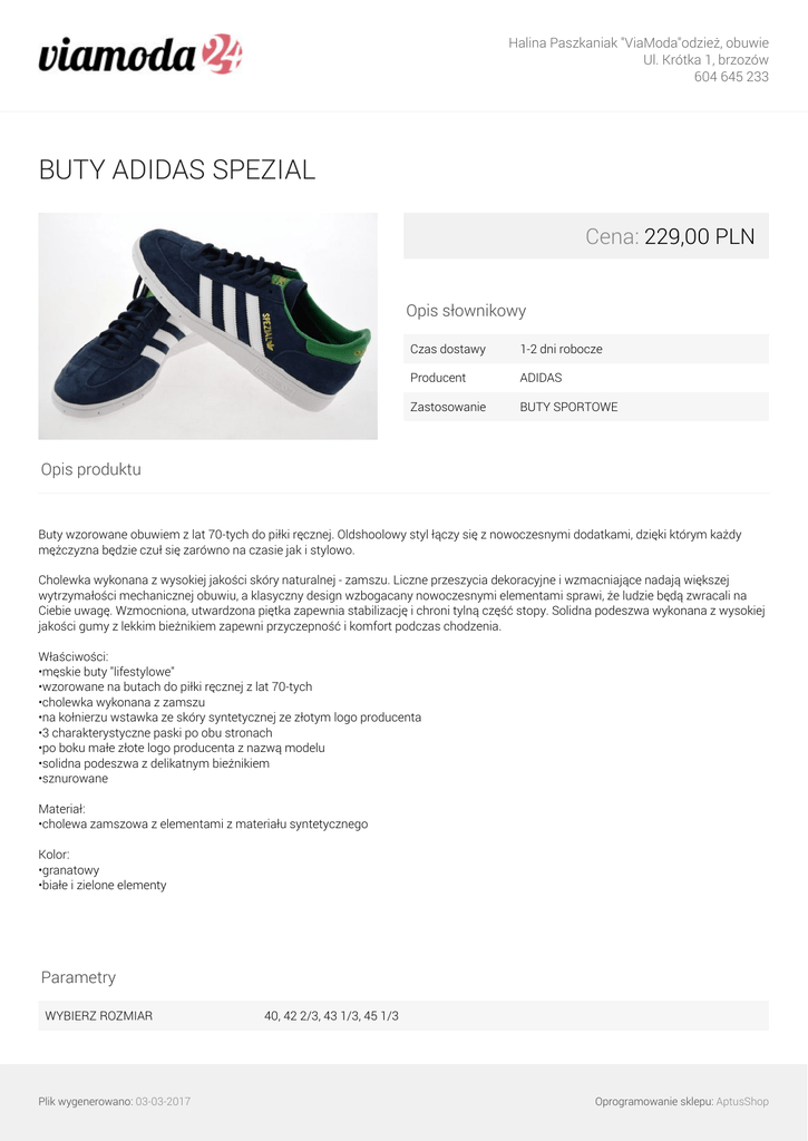 Halina Paszkaniak "ViaModa"odzież, obuwie Ul. Krótka 1, brzozów 604 645 233 BUTY ADIDAS SPEZIAL Cena: 229,00 PLN Opis słownikowy Czas dostawy 1-2 dni robocze Producent ADIDAS Zastosowanie BUTY SPORTOWE Opis produktu Buty wzorowane obuwiem z lat 70-tych do piłki ręcznej. Oldshoolowy styl łączy się z nowoczesnymi dodatkami, dzięki którym każdy mężczyzna będzie czuł się zarówno na czasie jak i stylowo. Cholewka wykonana z wysokiej jakości skóry naturalnej - zamszu. Liczne przeszycia dekoracyjne i wzmacniające nadają większej wytrzymałości mechanicznej obuwiu, a klasyczny design wzbogacany nowoczesnymi elementami sprawi, że ludzie będą zwracali na Ciebie uwagę. Wzmocniona, utwardzona piętka zapewnia stabilizację i chroni tylną część stopy. Solidna podeszwa wykonana z wysokiej jakości gumy z lekkim bieżnikiem zapewni przyczepność i komfort podczas chodzenia. Właściwości: •męskie buty "lifestylowe" •wzorowane na butach do piłki ręcznej z lat 70-tych •cholewka wykonana z zamszu •na kołnierzu wstawka ze skóry syntetycznej ze złotym logo producenta •3 charakterystyczne paski po obu stronach •po boku małe złote logo producenta z nazwą modelu •solidna podeszwa z delikatnym bieżnikiem •sznurowane Materiał: •cholewa zamszowa z elementami z materiału syntetycznego Kolor: •granatowy •białe i zielone elementy Parametry WYBIERZ ROZMIAR Plik wygenerowano: 03-03-2017 40, 42 2/3, 43 1/3, 45 1/3 Oprogramowanie sklepu: AptusShop Halina Paszkaniak "ViaModa"odzież, obuwie Ul. Krótka 1, brzozów 604 645 233 Galeria Plik wygenerowano: 03-03-2017 Powered by TCPDF (www.tcpdf.org) Oprogramowanie sklepu: AptusShop