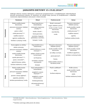 JADŁOSPISDIETOWY15-19.02.2016** Jadłospis dietowy zawiera informacje o potrawach przygotowanych z uwzględnieniem indywidualnych potrzeb żywieniowych dziecka. W zależności od rodzaju diety, potrawy są modyfikowane a składniki zamienianeodpowiednikamizalecanymiwdieciedziecka. Obiad Podwieczorek Dyżur Masłozwykłe/masło klarowane, Zupakoperkowaz ziemniakami, Kisielzowocami*, Pieczywomieszane/ chlebekryżowy, pieczywomieszane/chlebek ryżowy, rumsztykwieprzowy cebulką1,2,3, pastazrybą*, kotletzfasoli4, marchewka, schabpieczony*1,2,3 kaszagryczana, woda. wędlinasojowa4, ogórek,rzodkiewka, surówkazkapusty pekińskiejimarchwi, herbatazcytryną/woda. kompot/woda. Poniedziałek Śniadanie rogal/chlebekryżowy, masłozwykłe/masło klarowane, masłozwykłe/masło klarowane schabpieczony*1,2,3 wędlinasojowa4, ogórek, herbatarooibos/woda. Kaszajaglananamleku/ Zupakalafiorowaz makaronem, Pieczywomieszane/ chlebekryżowy, Pieczywomieszane/ chlebekryżowy, pieczywomieszane/chlebek ryżowy, udzikidrobiowewsosie własnym1,2,3, masłozwykłe/masło klarowane masłozwykłe/masło klarowane masłozwykłe/masło klarowane, pulpetzfasoliwsosie warzywnym4 serżółty/serkozi, konfiturajagodowa, szynkapieczona*1,2,3, ryżbrązowy, Wtorek mlekuryżowym, pastazcieciorki*4, ogórekkiszony,sałata, surówkazwarzyw mieszanych, herbatamalinowa/woda. kompot. Masłozwykłe/masło klarowane, Zupameksykańskaz ziemniakami, pieczywomieszane/chlebek ryżowy, spaghettizsosem mięsnym1,2,3, Środa pasztetzkaszyjaglanej*, papryka,pomidor, spaghettizsosem warzywnym4, herbatapoziomkowa/woda. brokułgotowany pastajajeczna*, herbatazcytryną/woda. banan, kakao/mlekoryżowez karobem/woda. Plackizjabłkami*, Wafleryżowe, kiwi, masłozwykłe/masło klarowane herbatamiętowa. miód, herbatamalinowa/woda. sokpomarańczowy/ woda. *WYRÓBWŁASNY,1dietabezmleczna,2dietabezglutenowa,3dietabezcukrowa,4dieta wegetariańska **Kuchniazastrzegasobieprawodozmian. Kaszakukurydziana/płatki ryżowenamlekuryżowym, Barszczukraiński, naleśnikizseremi śmietaną/naleśnikiz marmoladądietową, masłozwykłe/masło klarowane, kompot/woda. Czwartek pieczywomieszane/chlebek ryżowy, Pizzabezglutenowa hawajska*, Pieczywomieszane/ chlebekryżowy, jabłko, masłozwykłe/masło klarowane lemoniada/woda. indykpieczony*1,2,3 pasztetsojowyy4, indykpieczony*1,2,3 rzodkiewka, pasztetsojowy4, herbatagruszkowa/woda. rzodkiewka,sałatalodowa, herbatażurawinowa/woda. Masłozwykłe/masło klarowane, Zupajarzynowaz brązowymryżem, Pieczywomieszane/ chlebekryżowy, Pieczywomieszane/ chlebekryżowy, pieczywomieszane/chlebek ryżowy, kotletschabowysauté1,2,3, masłozwykłe/masło klarowane, masłozwykłe/masło klarowane indykpieczony*1,2,3 pastajajeczna*, ziemniakigotowane, mozaikasojowa4 ogórek, kalafiorgotowany, pomidor herbatazcytryną/woda. kompot/woda. pomarańcz herbataporzeczkowa/ woda. Piątek pastajajeczna*, szczypiorek,ogórek, herbatapoziomkowa/woda. kotletzgrochu4 *WYRÓBWŁASNY,1dietabezmleczna,2dietabezglutenowa,3dietabezcukrowa,4dieta wegetariańska **Kuchniazastrzegasobieprawodozmian.