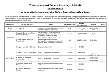 Wykaz podręczników na rok szkolny 2015/2016 dla klas trzecich w Liceum Ogólnokształcącym im. Stefana Żeromskiego w Żyrardowie Wykaz podręczników dopuszczonych do użytku szkolnego, przeznaczonych do kształcenia ogólnego, uwzględniających podstawę programową określoną w rozporządzeniu Ministra Edukacji Narodowej z dnia 27 sierpnia 2012 r. w sprawie podstawy programowej wychowania przedszkolnego oraz kształcenia ogólnego w poszczególnych typach szkół. PRZEDMIOT Religia AUTOR/AUTORZY WYDAWNICTWO NUMER DOPUSZCZENIA KLASA WAM AZ-42-01/10-KR6/14 wszystkie klasy trzecie Nowa Era MEN 425/5/2014 3a, 3e WSIP MEN 703/5/2014 3b, 3c, 3d, 3f red. Z. Marek Podręcznik i notes dla ucznia (2 w 1) Drogi świadków Chrystusa. W Kościele. Małgorzata Chmiel, Anna Równy, Robert Pruszczyński Ponad słowami. Podręcznik do języka polskiego dla liceum i technikum. Zakres podstawowy i rozszerzony. Klasa 3 D. Chemperek, A. Kalbarczyk, D. Trześniowski Nowe zrozumieć tekst zrozumieć człowieka. Dwudziestolecie międzywojenne (awangarda) - powojenna nowoczesność. Klasa 3, zakres podstawowy i rozszerzony M. Inglot, I. Michalak, A. Milewska Destination Matura 2015 Nowa Era 681/2014 G. Manin, D. Gryca, J. Sosnowska Matura Trainer poziom podstawowy OXFORD 688/1/2014 Język polski Język angielski TYTUŁ R. Harding, M. Markowska, J. Sosnowska Matura Trainer poziom rozszerzony OXFORD 688/2/2014 M. Umińska, B. Hastings, D. Chandler Longman Repetytorium Maturalne, poziom podstawowy Longman 351/2011 M. Umińska, B. Hastings, D. Chandler Longman Repetytorium Maturalne, poziom rozszerzony Longman 257/2011/z1 poziom podręczników jest ustalany przez nauczycieli dla poszczególnych grup językowych Uwagi Język angielski rozszerzony M. Rosinska, L. Edwards Macmillan Repetytorium Maturalne, poziom podstawowy i rozszerzony Język francuski Robert Menand, Anne-Marie Johnson Le Nouveau Taxi! 3 Macmillan Hachtte Expedition Deutsch 2A Język niemiecki J. Batleja, I. Nowicka, D. Wieruszewska Expedition Deutsch 2B Historia Małgorzata Wiatr-Kmieciak, Sławomira Wujec Paweł Klint, Piotr Galik Wiedza Lucyna Czechowska, Arkadiusz o społeczeństwie Janicki, Klaudiusz Święcicki Historia Iwona Janicka i społeczeństwo Wot i my 3. Podręcznik. Język rosyjski dla szkół ponadgimnazjalnych Zrozumieć przeszlość. Dzieje nowożytne. Podręcznik do historii dla liceum ogólnokształcącego i technikum. Zakres rozszerzony. Część 2 W centrum uwagi. Podręcznik do wiedzy o społeczeństwie dla liceum ogólnokształcącego i technikum. Zakres rozszerzony. Część 2 Poznać przeszłość. Rządzący i rządzeni. Podręcznik do historii i społeczeństwa dla liceum ogólnokształcącego i technikum MEN 141/3/2011 wszystkie klasy trzecie 350/3/2012 PWN Repetytorium maturalne z języka niemieckiego Język rosyjski 3a, 3b 350/4/2012 wszystkie klasy trzecie 350/9/2014 PWN MEN 324/3/2011/z1 we wrześniu Nowa Era MEN 642/2/2014 3d, 3f Nowa Era MEN 630/2/2014 we wrześniu Nowa Era MEN 659/2/2014 3a, 3b, 3c, 3e Matematyka M. Kurczab, E. Kurczab, E. Świda Matematyka Podręcznik dla liceów i techników klasa 3 Zakres podstawowy Oficyna Wydawnicza Krzysztof Pazdro MEN 412/2/2012 3c, 3d, 3e, 3f Matematyka w naukach przyrodniczych M. Kurczab, E. Kurczab, E. Świda Matematyka. Podręcznik do liceów i techników. Zakres rozszerzony. Klasa 3 Oficyna Edukacyjna Krzysztof Pazdro MEN 412/3/2012 3c Matematyka M. Kurczab, E. Kurczab, E. Świda Matematyka. Podręcznik do liceów i techników. Zakres rozszerzony. Klasa 3 Oficyna Edukacyjna Krzysztof Pazdro MEN 563/3/2014 3a, 3b Nowa Era MEN 632/2/2013 3a, 3b Fizyka Zrozumieć fizykę. Podręcznik dla szkół Marcin Braun, Agnieszka Byczuk, ponadgimnazjalnych. Kształcenie ogólne w Krzysztof Byczuk, Elżbieta Wójtowicz zakresie rozszerzonym cz. 2 Fizyka medyczna brak podręcznika 3c Chemia Maria Litwin, Szarota Styka-Wlazło, Joanna Szymońska To jest chemia. Część 2. Chemia organiczna. Podręcznik dla szkół ponadgimnazjalnych. Zakres rozszerzony Nowa Era MEN 528/2/2013 3c Biologia Franciszek Dubert, Ryszard Kozik, Stanisław Krawczyk, Adam Kula, Maria Marko-Worłowska, Władysław Zamachowski Biologia na czasie 2. Podręcznik dla liceum ogólnokształcącego i technikum. Zakres rozszerzony Nowa Era MEN 564/2/2013 3c Biologia Franciszek Dubert, Marek Jurgowiak, Biologia na czasie 3. Podręcznik dla liceum Maria Marko-Worłowska, Władysław ogólnokształcącego i technikum. Zakres Zamachowski rozszerzony Nowa Era MEN564/3/2014 3c Roman Malarz, Marek Więckowski Oblicza geografii 3. Podręcznik dla liceum ogólnokształcącego i technikum. Zakres rozszerzony Nowa Era MEN 501/3/2014 3a, 3b Grażyna Koba Informatyka dla szkół ponadgimnazjalnych Migra MEN 643/2013 3a, 3b, 3e Geografia Informatyka Przyroda brak podręcznika 3d, 3f Zajęcia artystyczne brak podręcznika 3d, 3e, 3f Astronomia dla geografów brak podręcznika 3b Wychowanie do Brak podręcznika życia w rodzinie większość podręczników do zakupienia we wrześniu na giełdzie podręczników używanych klasy trzecie