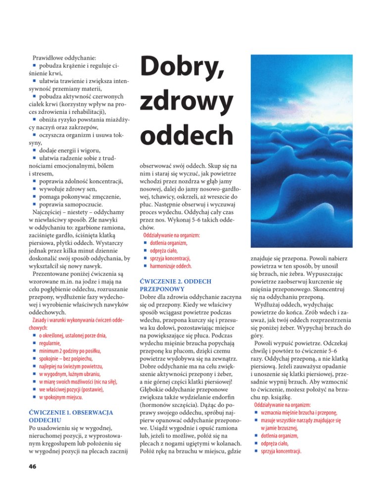 Prawidłowe oddychanie: pobudza krążenie i reguluje ci śnienie krwi, ułatwia trawienie i zwiększa intensywność przemiany materii, pobudza aktywność czerwonych ciałek krwi (korzystny wpływ na proces zdrowienia i rehabilitacji), obniża ryzyko powstania miażdżycy naczyń oraz zakrzepów, oczyszcza organizm i usuwa toksyny, dodaje energii i wigoru, ułatwia radzenie sobie z trud nościami emocjonalnymi, bólem i stresem, poprawia zdolność koncentracji, wywołuje zdrowy sen, pomaga pokonywać zmęczenie, poprawia samopoczucie. Najczęściej – niestety – oddychamy w niewłaściwy sposób. Złe nawyki w oddychaniu to: zgarbione ramiona, zaciśnięte gardło, ściśnięta klatką piersiowa, płytki oddech. Wystarczy jednak przez kilka minut dziennie doskonalić swój sposób oddychania, by wykształcił się nowy nawyk. Prezentowane poniżej ćwiczenia są wzorowane m.in. na jodze i mają na celu pogłębienie oddechu, rozruszanie przepony, wydłużenie fazy wydechowej i wyrobienie właściwych nawyków oddechowych. Zasady i warunki wykonywania ćwiczeń oddechowych: o określonej, ustalonej porze dnia, regularnie, minimum 2 godziny po posiłku, spokojnie – bez pośpiechu, najlepiej na świeżym powietrzu, w wygodnym, luźnym ubraniu, w miarę swoich możliwości (nic na siłę), we właściwej pozycji (postawie), w spokojnym miejscu. Ćwiczenie 1. Obserwacja oddechu Po usadowieniu się w wygodnej, nieruchomej pozycji, z wyprostowa nym kręgosłupem lub położeniu się w wygodnej pozycji na plecach zacznij 46 Dobry, zdrowy oddech obserwować swój oddech. Skup się na nim i staraj się wyczuć, jak powietrze wchodzi przez nozdrza w głąb jamy nosowej, dalej do jamy nosowo-gardłowej, tchawicy, oskrzeli, aż wreszcie do płuc. Następnie obserwuj i wyczuwaj proces wydechu. Oddychaj cały czas przez nos. Wykonaj 5-6 takich oddechów. Oddziaływanie na organizm: dotlenia organizm, odpręża ciało, sprzyja koncentracji, harmonizuje oddech. Ćwiczenie 2. Oddech przeponowy Dobre dla zdrowia oddychanie zaczyna się od przepony. Kiedy we właściwy sposób wciągasz powietrze podczas wdechu, przepona kurczy się i przesuwa ku dołowi, pozostawiając miejsce na powiększające się płuca. Podczas wydechu mięśnie brzucha popychają przeponę ku płucom, dzięki czemu powietrze wydobywa się na zewnątrz. Dobre oddychanie ma na celu zwiększenie aktywności przepony i żeber, a nie górnej części klatki piersiowej! Głębokie oddychanie przeponowe zwiększa także wydzielanie endorfin (hormonów szczęścia). Dążąc do poprawy swojego oddechu, spróbuj najpierw opanować oddychanie przeponowe. Usiądź wygodnie i opuść ramiona lub, jeżeli to możliwe, połóż się na plecach z nogami ugiętymi w kolanach. Połóż rękę na brzuchu w miejscu, gdzie znajduje się przepona. Powoli nabierz powietrza w ten sposób, by unosił się brzuch, nie żebra. Wypuszczając powietrze zaobserwuj kurczenie się mięśnia przeponowego. Skoncentruj się na oddychaniu przeponą. Wydłużaj oddech, wydychając powietrze do końca. Zrób wdech i zauważ, jak twój oddech rozprzestrzenia się poniżej żeber. Wypychaj brzuch do góry. Powoli wypuść powietrze. Odczekaj chwilę i powtórz to ćwiczenie 5-6 razy. Oddychaj przeponą, a nie klatką piersiową. Jeżeli zauważysz opadanie i unoszenie się klatki piersiowej, przesadnie wypnij brzuch. Aby wzmocnić to ćwiczenie, możesz położyć na brzuchu np. książkę. Oddziaływanie na organizm: wzmacnia mięśnie brzucha i przeponę, masuje wszystkie narządy znajdujące się w jamie brzusznej, dotlenia organizm, odpręża ciało, sprzyja koncentracji. Ćwiczenie 3. Pełny prawidłowy oddech 1. W luźnym ubraniu połóż się na podłodze na plecach z nogami ugiętymi w kolanach. Rozluźnij możliwie najlepiej całe ciało, połóż dłonie równolegle w okolicy pępka. Powoli wdychaj powietrze nosem tak, by podczas wdechu brzuch podnosił twoje dłonie. Zwracaj uwagę (dotyczy szczególnie kobiet), by przy okazji nie nabierać powietrza do górnych i środkowych płuc. Lepiej jest nabrać mniej powietrza, ale do brzucha, niż w inne miejsca płuc. Powietrze wdychaj i wydychaj nosem. Ważne jest, by podczas ćwiczenia wypracować umiejętność swobodnego oddychania, angażując tylko dolne partie płuc. Wyko naj 5-6 takich oddechów. Pamiętaj, by niczego nie robić na siłę. 2. Leżąc dalej na plecach z nogami ugiętymi w kolanach, rozluźnij się ponownie i połóż dłonie na żebrach (na bokach ciała, na wysokości splotu słonecznego w ten sposób, aby palce środkowe stykały się). Powoli wdychaj powietrze nosem tak, by podczas wdechu żebra (i dłonie) rozchodziły się na boki. Brzuch jest w tym czasie lekko wciągany. Uważaj, aby powietrze wypełniało tylko środkowe płuca. Powietrze wdychaj i wydychaj nosem. Wykonaj 5-6 takich oddechów. 3. Rozluźnij jeszcze raz całe ciało. Wdychaj teraz powietrze do szczytów płuc (jak przy głębokim wdechu). Brzuch w tym momencie jest silnie wciągany. Zwracaj uwagę (szczególnie u mężczyzn), by powietrze nie było przy okazji wciągane do dolnych partii płuc. Powietrze wdychaj i wydychaj nosem. Wykonaj 5-6 takich oddechów. Gdy opanujesz już trzy fazy oddechu, to spróbuj je połączyć. Wdech powinien wówczas unosić po kolei brzuch, żebra, mostek, wydech zaś spowodować ich opadanie. W momencie gdy nabierasz powie trza, wyobraź sobie, że dociera ono do najdalszych zakątków twojego ciała: do dłoni, stóp, głowy. W trakcie wydechu skoncentruj się na tym, jak napięcie ulatuje i poczuj przyjemne rozluźnienie mięśni. Pełny oddech łączy te trzy etapy. Następują one po sobie w kolejności: 1, 2, 3 (a więc: dolne, środkowe, górne). Staraj się to robić płynnie, jednocześnie wydłużając wydech przez hamowanie prądu wydychanego powietrza. Oddech przez to powinien stać się łagodny i coraz wolniejszy. Zwróć uwagę na głębokość swojego oddechu. Bardz