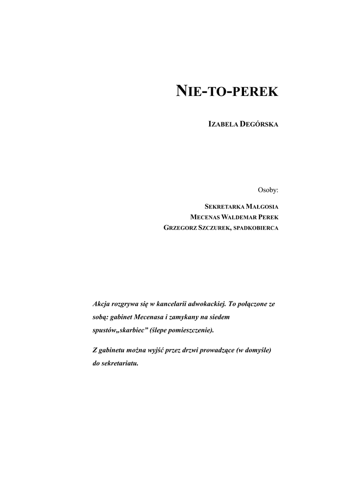 NIE-TO-PEREK IZABELA DEGÓRSKA Osoby: SEKRETARKA MAŁGOSIA MECENAS WALDEMAR PEREK GRZEGORZ SZCZUREK, SPADKOBIERCA Akcja rozgrywa się w kancelarii adwokackiej. To połączone ze sobą: gabinet Mecenasa i zamykany na siedem spustów„skarbiec” (ślepe pomieszczenie). Z gabinetu można wyjść przez drzwi prowadzące (w domyśle) do sekretariatu. S CE NA 1 . W „skarbcu” Mecenas – koło 50–tki, elegancki – wywija floretem, „zarzuca niewidzialną pelerynę”, pręży się. W tle słychać odgłosy krzątania, dzwonią filiżanki. DZWONI telefon. SEKRETARKA (off) Gabinet mecenasa Perka, słucham? /…/ Niech sprawdzę. Oczywiście. Może być piętnasta? Do widzenia. Do gabinetu wchodzi z filiżanką kawy Sekretarka – koło 30–tki. Pod pachą niesie dokumenty, kładzie je z dala od biurka. Ukradkiem wsypuje coś do kawy - bardzo hojnie - z dwóch saszetek. Otwierają się drzwi od „skarbca” i pojawia się Mecenas z teczką. Mężczyzna starannie zamyka „skarbiec” na kilka zamków. SEKRETARKA Panie Mecenasie, kawa. MECENAS Dziękuję. Jakieś telefony? SEKRETARKA Młody Szczurek umówił się na trzecią. Chciał się czegoś dowiedzieć w sprawie formalności. MECENAS A przesyłka? SEKRETARKA Sprawdzałam w firmie kurierskiej. Ma status „w drodze”. Powinna być jutro z rana. Mecenas pije łyk kawy i niemal ją wypluwa. 1 MECENAS Czy coś się stało z ekspresem? SEKRETARKA Oj, nie smakuje? Ale proszę wypić. Jest z dodatkiem magnezu. MECENAS (pije) Może to kwestia wody? Sekretarka od tego momentu dyskretnie zerka na zegarek. Z czasem Mecenas ulega na przemian falom pobudzenia i senności. SEKRETARKA Możliwe. Jest bardzo twarda, nawet paprotka źle ją znosi. Z zapałem zrasza roślinkę, aż moczy przy tym Mecenasa. MECENAS Pani Małgosiu…! SEKRETARKA Przepraszam. Przepraszam! Wyciera go ściereczką. MECENAS No, dobrze już, dobrze, nic się przecież nie stało. Niech pani to odłoży i na chwilę siądzie. Mam dla pani nowinę. Kobieta siada dość daleko od biurka. SEKRETARKA Zamieniam się w słuch. 2 MECENAS Otóż niedługo jest sympozjum w czeskiej Pradze. Pomyślałem, że pani najwięcej na nim skorzysta. SEKRETARKA Ja…? Jestem tylko asystentką. MECENAS Ale skończyła pani studia i stara się u nas o staż. To będzie taka inwestycja w przyszłość. SEKRETARKA Dziękuję. Ktoś jeszcze jedzie? MECENAS Ja. Sekretarka okazuje zadowolenie. MECENAS Niech pani siądzie bliżej. Nasze rozmowy nie muszą być aż tak oficjalne. Zwłaszcza, w przerwie na lunch. Kobieta wyjmuje dokumenty z teczki podawczej. SEKRETARKA Oczywiście. Prosił pan o dokumenty uzupełniające w sprawie spadkowej pana Szczurka. MECENAS Dokumenty. Ach, tak. Proszę położyć. Kobieta kładzie dokumenty tuż przed nim i siada bliżej biurka. Mecenas nie odrywa wzroku od jej dekoltu. Niechcący wsadza krawat do kawy. 3 MECENAS Uf, ale dziś gorąco! SEKRETARKA Najlepiej rozpiąć pod szyją. MECENAS Nie wypada… w pracy. Mecenas powinien być zawsze schludny. Elegancki. Kojarzyć się z sukcesem sprawy, którą chce wygrać. Sekretarka ostrożnie wyjmuje mokry krawat z filiżanki. SEKRETARKA Więc ten krawat lepiej zdjąć. MECENAS (zdejmuje krawat i śmieje się zażenowany) No tak, w tym raczej nie kojarzę się z wygraną. SEKRETARKA Pan zawsze wygrywa. Zawsze. MECENAS Cieszę się, że ktoś docenia moje drobne sukcesy. SEKRETARKA Na mój gust, całkiem spore. Na sali rozpraw jest pan jak… jak… superbohater! To takie imponujące! MECENAS Nawet nie wie pani, jak miło mi to słyszeć. Zwłaszcza od takiej… hm… atrakcyjnej kobiety. 4 SEKRETARKA Mogłabym trochę schudnąć. MECENAS Broń Boże! Wygląda pani doskonale. I te kocie ruchy…! Całuje jej dłoń, nieco zbyt poufale. Sekretarka kryguje się i sukcesywnie przemieszcza się w stronę skarbca, on – za nią. SEKRETARKA Ależ… nie wypada mi tego słuchać. MECENAS Oczywiście, że wypada. SEKRETARKA Jeszcze pomyśli pan, że jestem…/ MECENAS /…(namiętnie) Nie pan. Waldi. SEKRETARKA Małgorzata. MECENAS Wiesz jak cię cenię. SEKRETARKA Jak…? MECENAS Jak najbardziej! 5 SEKRETARKA Zbytnia zażyłość raczej temu nie sprzyja… Wtem Mecenasowi kleją się powieki. Sekretarka stara się „utrzymać jego zainteresowanie”. SEKRETARKA Z drugiej strony… jako profesjonaliści… MECENAS Taaak… (zatacza się nieco) SEKRETARKA …potrafimy oddzielić strefę prywatną od służbowej. MECENAS W rzeczy samej. Pięknie to powiedziałaś. Jak moja mmm… moja pra… praa… praaaaaa… (ziewa) SEKRETARKA (do siebie) Chyba nie jest aż tak stary…?! MECENAS …wniczka. Sekretarka chichoce rozradowana. MECENAS W tej kancelarii czka… SEKRETARKA Słucham…? 6 MECENAS …czeka cię wielka kariera. Aplikację zrobisz raz–dwa. Nawet nie zauważysz, kiedy. Nieco rozbudzony, ożywia się. Kobieta jest coraz bliżej drzwi do „skarbca”. SEKRETARKA Tym bardziej powinnam dbać o reputację, unikać dwuznacznych sytuacji. MECENAS Rzeczywiście, niedługo mam petenta. Gdyby zjawił się przed czasem… SEKRETARKA No właśnie. (kusząco) Tak sobie pomyślałam… Waldi… że skoro masz wolną chwilę… MECENAS Tak…? SEKRETARKA Może pokażesz mi…/ Mecenas bardzo chce pokazać. SEKRETARKA /swój skarbiec? MECENAS (skonsternowany) Co takiego…? 7 SEKRETARKA (zirytowana) No, ten pokoik bez okien, zamykany, z sejfem. Tylko ty tam wchodzisz. Uderza dłonią drzwi, o które się już opiera. Mecenas zerka na zegarek, ponętną Sekretarkę i w lot podejmuje decyzję. MECENAS Świetny wybór. Cała przyjemność po mojej stronie…! Mecenas wyjmuje pęk kluczy i otwiera kolejne zamki. MECENAS Pierwszy zameczek… drugi zameczek… trzeci… czwarty… piąty… SEKRETARKA Wrrr! Zawsze chciałam go zobaczyć. Barrrdzo. Barrrdzo! MECENAS O! I jeszcze szósty. A na koniec, szczęśliwa siódemeczka…! Każdy szczęk przyprawia Sekretarkę o „ekstazę”, co strasznie kręci Mecenasa. Otwierają się drzwi. Ona