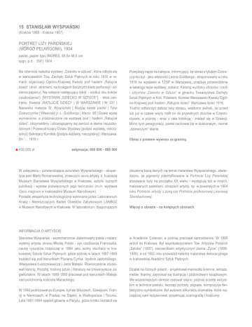 15 STANIS£AW WYSPIAÑSKI (Kraków 1869 - Kraków 1907) PORTRET LIZY PAREÑSKIEJ (WRÓD PELARGONII), 1904 pastel, papier typu INGRES, 65,5x 48,5 cm sygn. p.d. : SW | 1904 Na odwrocie nalepka wystawy Dziecko w sztuce, która odby³a siê w warszawskim Tow. Zachêty Sztuk Piêknych w roku 1916 w ramach organizacji Ogólno-Krajowej Kwesty pod has³em Ratujcie dzieci (druk, atrament, na brzegach bocznych lady perforacji i oddarcia papieru). Na nalepce nastêpuj¹cy tekst: - wzd³u¿ obu boków (uszkodzenia!): [WYSTAWA DZIECKO W SZTUCE]; - tekst centralny: Kwesta RATUJCIE DZIECI | W WARSZAWIE | No 331 | Nazwisko malarza St. Wyspiañski | Rodzaj dzie³a pastel | Tytu³ Dziewczynka | W³asnoæ p. L. Goldberga | Marsz. 95 | Dzie³o wy¿ej wymienione, a przeznaczone na wystawê pod | has³em Ratujcie dzieci, otrzymalimy i obowi¹zujemy siê zwróciæ w stanie nieuszkodzonym | Przewodnicz¹cy Dzia³u Wystawy [podpis wyblak³y, nieczytelny] | Sekretarz Komitetu [podpis wyblak³y, nieczytelny] | Warszawa. Dn. ... 1916 r. 430 000 z³ Powy¿szy napis na nalepce, informuj¹cy, ¿e obraz z tytu³em Dziewczynka by³ - jako w³asnoæ Leona Goldberga - eksponowany w roku 1916 na wystawie w TZSP w Warszawie, znajduje potwierdzenie w katalogu tej¿e wystawy; zobacz: Katalog wystawy obrazów, rzeb i sztychów Dziecko w Sztuce w gmachu Towarzystwa Zachêty Sztuk Piêknych w Król. Polskiem, Komitet Warszawski Kwesty Ogólno-Krajowej pod has³em Ratujcie dzieci Warszawa lipiec 1916. Trudno odtworzyæ dalsze losy obrazu, wiadomo jednak, ¿e przed lub ju¿ w czasie wojny trafi³ on do prywatnych zbiorów w Czêstochowie, a póniej - wraz z ca³a kolekcj¹ - znalaz³ siê w Szwecji. Mimo tych peregrynacji, pastel zachowa³ siê w doskona³ym, niemal dziewiczym stanie. Obraz z prawem wywozu za granicê. estymacja: 600 000 - 800 000 W za³¹czeniu - potwierdzaj¹ca autorstwo Wyspiañskiego - ekspertyza pani Marty Romanowskiej, znawczyni oevre artysty, b. kustosza Muzeum Stanis³awa Wyspiañskiego w Krakowie, autorki licznych publikacji i wystaw powiêconych jego twórczoci (m.in. wystawa Opus magnum w krakowskim Muzeum Narodowym). Ponadto ekspertyza technologiczna wykonana przez Laboratorium Analiz i Nieniszcz¹cych Badañ Obiektów Zabytkowych LANBOZ w Muzeum Narodowym w Krakowie. W laboratorium, dysponuj¹cym obszern¹ baz¹ danych na temat malarstwa Wyspiañskiego, stwierdzono, ¿e pigmenty zidentyfikowane w Portrecie Lizy Pareñskiej stosowane by³y na pocz¹tku XX wieku i wystêpuj¹ te¿ w innych, malowanych pastelami, obrazach artysty, np. w powsta³ych w 1904 roku Portrecie artysty z ¿on¹ czy Portrecie profesorowej Leonowej Sternbachowej. Wiêcej o obrazie - na kolejnych stronach. INFORMACJA O ARTYCIE: Stanis³aw Wyspiañski - wszechstronnie utalentowany poeta i malarz, wybitny artysta okresu M³odej Polski - syn rzebiarza Franciszka, naukê rysunków rozpocz¹³ w 1884 jako wolny s³uchacz w krakowskiej Szkole Sztuk Piêknych, gdzie póniej w latach 1887-1889 kszta³ci³ siê pod kierunkiem Floriana Cynka, Izydora Jab³oñskiego, W³adys³awa £uszczkiewicza i Jana Matejki. Równoczenie studiowa³ historiê, filozofiê, historiê sztuki i literatury na Uniwersytecie Jagielloñskim. W latach 1889-1890 pracowa³ pod kierunkiem Matejki nad polichromi¹ kocio³a Mariackiego. W 1890 podró¿owa³ po Europie, by³ we W³oszech, Szwajcarii, Francji w Niemczech, w Pradze, na l¹sku, w Wielkopolsce i Toruniu. Lata 1891-1894 spêdzi³ g³ównie w Pary¿u, gdzie krótko kszta³ci³ siê w Académie Colarosii, a póniej pracowa³ samodzielnie. W 1895 wróci³ do Krakowa. By³ wspó³za³o¿ycielem Tow. Artystów Polskich Sztuka (1897), kierownikiem artystycznym pisma ¯ycie (18981899), a od 1902 roku prowadzi³ katedrê malarstwa dekoracyjnego w krakowskiej Akademii Sztuk Piêknych. Dzia³a³ na ró¿nych polach - projektowa³ malowid³a cienne, witra¿e, meble, tkaniny, zajmowa³ siê ilustracj¹ i zdobnictwem ksi¹¿kowym. We wczeniejszym okresie malowa³ olejno, póniej przede wszystkim w technice pastelu, tworz¹c portrety, pejza¿e, kompozycje fantastyczno-symboliczne. By³ autorem kilkunastu dramatów, które najczêciej sam re¿yserowa³, projektuj¹c scenografiê i kostiumy. Sportretowana wród kwitn¹cych pelargonii kilkunastoletnia panienka, Eliza Pareñska, zwana Liz¹ lub Lizk¹ (póniejsza Edwardowa Leszczyñska), by³a najm³odszym z czworga dzieci doktora Stanis³awa Pareñskiego i Elizy z Mühleisenów. Jej siostrami by³y - Maria (Maryna), póniejsza Raczyñska-Jasieñska-Grekowa oraz Zofia, póniej ¿ona Tadeusza Boya-¯eleñskiego. Jan, brat panien Pareñskich, zgin¹³ mierci¹ lotnika podczas walk polsko-ukraiñskich w 1919 roku. Z rodzin¹ pañstwa Pareñskich Wyspiañski by³ blisko zaprzyjaniony. Od roku 1896 bywa³ w ich gocinnym domu, znajduj¹c tam ¿yczliwoæ i zrozumienie. Pani Eliza Pareñska, któr¹ - z uwagi na jej wykszta³cenie i kulturê - nazywano krakowsk¹ Aspazj¹, by³a te¿ czêstokroæ pierwsz¹ s³uchaczk¹ wierszy i dramatów poety, odczytywanych w jej salonie. Wyspiañski znalaz³ w niej tak wielbicielkê swoich talentów, jak i oddan¹ przyjació³kê, gotow¹ zawsze pieszyæ z pomoc¹ jemu i jego rodzinie. Pañstwo Pareñscy zamawiali, kupowali i kolekcjonowali obrazy artysty, a pani Eliza czêsto dyskretnie pomaga³a w ich sprzeda¿y. Wyspiañski kilkakrotnie i w ró¿nych ujêciach portretowa³ urocze panny Pareñskie. Warto przypomnieæ tak¿e, ¿e Maria-Maryna i Zosia by³y pierwowzorami postaci z Wesela (premiera 1901). Modelk¹ artysty by³a te¿ Liza, najm³odsza z panien Pareñskich; oprócz Portretu z pelargoniami, Wyspiañski namalowa³ te¿ jej Portret podwójny (1905; obraz zaginiony podczas wojny). W obu powtarza siê motyw kwiatów - tu pelargonii, tam ró¿. Prezentowany obraz - zapomniana i szerzej w naszych czasach nieznana wersja Portretu Lizy Pareñskiej wród kwiatów pelargonii jest niew¹tpliwie oryginaln¹ prac¹ Stanis³awa Wyspiañskiego /.../ i