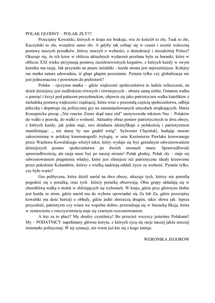 POLAK GŁODNY – POLAK ZŁY!!! Przeciętny Kowalski, których w kraju nie brakuje, wie że kościół to zło, Tusk to zło, Kaczyński to zło, wszędzie samo zło. A gdyby tak cofnąć się w czasie i ocenić waleczną postawę naszych przodków, którzy marzyli o wolności, o demokracji i niezależnej Polsce? Okazuje się, że ich krew w obliczu aktualnych wydarzeń przelana była za baranki, które w obliczu XXI wieku przyjmują postawę zacietrzewionych kogutów, z których każdy w swym kurniku ma rację. Jak przystało na ptasie móżdżki - każda strona jest najważniejsza. Kolejny raz matka natura udowadnia, iż głupi głupim pozostanie. Pytanie tylko czy globalizacja nie jest jednoznaczna z powrotem do prehistorii? Polska – ojczyzna matka – gdzie większość społeczeństwa to ludzie ochszczeni, na dzień dzisiejszy jest siedliskiem równych i równiejszych - obraża samą siebie. Ostatnia walka o pamięć i krzyż pod pałacem prezydenckim, objawia się jako patriotyczna walka katolików z nieludzką postawą większości rządzącej, która wraz z pozostałą częścią społeczeństwa, odbija piłeczkę i dopatruje się politycznej gry na zamanipulowanych umysłach strajkujących. Maria Konopnicka pisząc „Nie rzucim Ziemi skąd nasz ród” motywowała tekstem Nas – Polaków do walki o prawdę, do walki o wolność. Aktualny obraz postaw patriotycznych to dwa obozy, z których każdy, jak jeden mąż, swe działania identyfikuje z polskością i patriotyzmem manifestując: „ nie damy by nas gnębił wróg”. Sylwester Chęciński, budując mocno zakorzenioną w polskiej kinematografii trylogię, w usta Kazimierza Pawlaka kreowanego przez Wacława Kowalskiego włożył tekst, który wydaje się być genialnym odwzorowaniem dzisiejszych postaw społeczeństwa po dwóch stronach muru: Sprawiedliwość sprawiedliwością, ale racja musi być po naszej stronie! Polak głodny, Polak zły – staje się odwzorowaniem pragnienia władzy, które jest silniejsze niż patriotyczne ideały krzewione przez pokolenie Kolumbów, którzy z wielką nadzieją oddali życie za wolność. Pytanie tylko, czy było warto? Gra polityczna, która dzieli naród na dwa obozy, ukazuje tych, którzy nie potrafią pogodzić się z porażką, oraz tych którzy porażkę obserwują. Obie grupy układają się w chorobliwą walkę o stołek w zbliżających się wyborach. W kraju, gdzie przy głównym żłobie jest każda ze stron, gdzie naród ma do wyboru opowiadać się Za lub Za, gdzie przeciętny kowalski ma dość herezji o obłudy, gdzie jedni złorzeczą drugim, takie słowa jak: lepsza przyszłość, patriotyzm czy wiara we wspólne dobro, przeradzają się w literacką fikcję, która w zestawieniu z rzeczywistością staje się czarnym rozczarowaniem. A kto za to płaci? My drodzy czytelnicy! Bo przecież wszyscy jesteśmy Polakami! My – PODATNICY napełniamy główne koryta, z których sycą się racje naszej jakże uroczej śmietanki politycznej. W tej sytuacji, nie wiem już kto się z kogo śmieje. WERONIKA JEGOROW