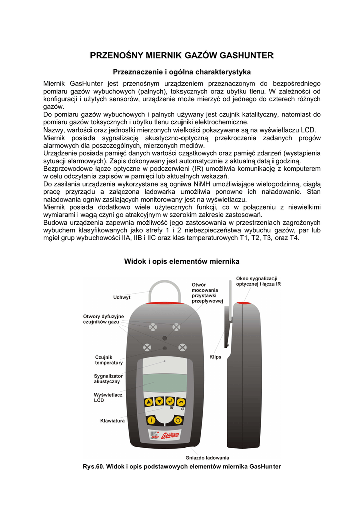 PRZENOŚNY MIERNIK GAZÓW GASHUNTER Przeznaczenie i ogólna charakterystyka Miernik GasHunter jest przenośnym urządzeniem przeznaczonym do bezpośredniego pomiaru gazów wybuchowych (palnych), toksycznych oraz ubytku tlenu. W zależności od konfiguracji i użytych sensorów, urządzenie może mierzyć od jednego do czterech różnych gazów. Do pomiaru gazów wybuchowych i palnych używany jest czujnik katalityczny, natomiast do pomiaru gazów toksycznych i ubytku tlenu czujniki elektrochemiczne. Nazwy, wartości oraz jednostki mierzonych wielkości pokazywane są na wyświetlaczu LCD. Miernik posiada sygnalizację akustyczno-optyczną przekroczenia zadanych progów alarmowych dla poszczególnych, mierzonych mediów. Urządzenie posiada pamięć danych wartości cząstkowych oraz pamięć zdarzeń (wystąpienia sytuacji alarmowych). Zapis dokonywany jest automatycznie z aktualną datą i godziną. Bezprzewodowe łącze optyczne w podczerwieni (IR) umożliwia komunikację z komputerem w celu odczytania zapisów w pamięci lub aktualnych wskazań. Do zasilania urządzenia wykorzystane są ogniwa NiMH umożliwiające wielogodzinną, ciągłą pracę przyrządu a załączona ładowarka umożliwia ponowne ich naładowanie. Stan naładowania ogniw zasilających monitorowany jest na wyświetlaczu. Miernik posiada dodatkowo wiele użytecznych funkcji, co w połączeniu z niewielkimi wymiarami i wagą czyni go atrakcyjnym w szerokim zakresie zastosowań. Budowa urządzenia zapewnia możliwość jego zastosowania w przestrzeniach zagrożonych wybuchem klasyfikowanych jako strefy 1 i 2 niebezpieczeństwa wybuchu gazów, par lub mgieł grup wybuchowości IIA, IIB i IIC oraz klas temperaturowych T1, T2, T3, oraz T4. Widok i opis elementów miernika Rys.60. Widok i opis podstawowych elementów miernika GasHunter Specyfikacja czujników pomiarowych Tabela 49. Specyfikacja czujników pomiarowych miernika GasHunter Uwagi Mierzone Typ Zakres Rozdzielczość Czas medium czujnika odpowiedzi T90 Gazy 4P-90 100%DGW 1%DGW <30sek (CH4) wybuchowe EKP-1/N 100%DGW 1%DGW <30sek (CH4) O2 4OX(2) 25%Vol 0,1%Vol <20sek CO 4CF 500ppm 1ppm <30sek Normalny H2S 4H 100ppm 0,1ppm <35sek Normalny SO2 4S 20ppm 0,1ppm <40sek Normalny HCN 4HN 50ppm ≤0,5ppm <205sek Normalny H2 4HYT 1000ppm ≤2ppm <95sek Normalny H2 H23E4% 4%V/V 0,01%V/V <60sek Normalny NH3 NH33E 50ppm 1ppm <60sek Normalny 100SE (100ppm) NO 4NT 200ppm ≤0,5ppm <25sek Z biasem (250ppm) C2H4O 4ETO 20ppm 0,1ppm <125sek Z biasem Cl2 4CL 10ppm 0,1ppm <65sek Odwrotny Cl2 Cl23E10 5ppm ≤0,05ppm <60sek Odwrotny NO2 4ND 20ppm 0,1ppm <30sek Odwrotny HCl HCl3E30 30ppm 1ppm <75sek Z biasem (≤0,7ppm) THT* THT3E50 50mg/m3 ≤1,5mg/m3 <35sek Z biasem O3 O33E1 1ppm ≤0,02ppm <65sek Odwrotny Inne Według indywidualnych ustaleń * - Czujniki THT dostępne są tylko w urządzeniach stacjonarnych UWAGA: Miernik może być wyposażony w maksymalnie 1 czujnik katalityczny na gazy wybuchowe oraz w maksymalnie 3 lub 4 czujniki elektrochemiczne. Podstawowe parametry techniczne Tabela 50. Podstawowe parametry techniczne miernika GasHunter Zasada pomiaru Zakres pomiarowy Rozdzielczość pomiaru Czas reakcji (odpowiedzi) T90 Pobór gazu Czas życia czujników Indykacja pomiaru Alarmy Sygnalizacja alarmu Natężenie sygnału akustycznego Zakres temperatur pracy Zakres wilgotności pracy Zakres ciśnienia pracy Graniczne temperatury przechowywania Zasilanie Czas pracy Obudowa Wymiary miernika Waga miernika Czasokres kalibracji Cecha budowy przeciwwybuchowej Typ ochrony obudowy Wyposażenie Gazy wybuchowe: czujnik katalityczny Tlen i gazy toksyczne: czujniki elektrochemiczne Zgodnie ze specyfikacją czujników Zgodnie ze specyfikacją czujników Zgodnie ze specyfikacją czujników Dyfuzyjny lub przepływowy (przystawka przepływowa) Od 1,5 do 3 lat Wyświetlacz LCD z podświetleniem Ustawiane (dla tlenu na ubytek) Akustyczno - optyczna 85dB/0,3m -20 - +40°C 10 – 90%Rh bez kondensacji 80 – 120kPa -20 - +40°C 4 x NiMH typ GP180AAH 1,2V/1800mAh Min. 10 godzin Vestamid L-R2-GF 25 (kolor czarny) 151x80x34 Około 400g 6 miesięcy II 2G Ex iad IIC T4 IP54 Ładowarka sieciowa typ LDR-10 (standard) Ładowarka samochodowa typ LDR-10S (opcja) Przystawka do pomiarów przepływowych (opcja) Przystawka do komunikacji z komputerem (opcja)