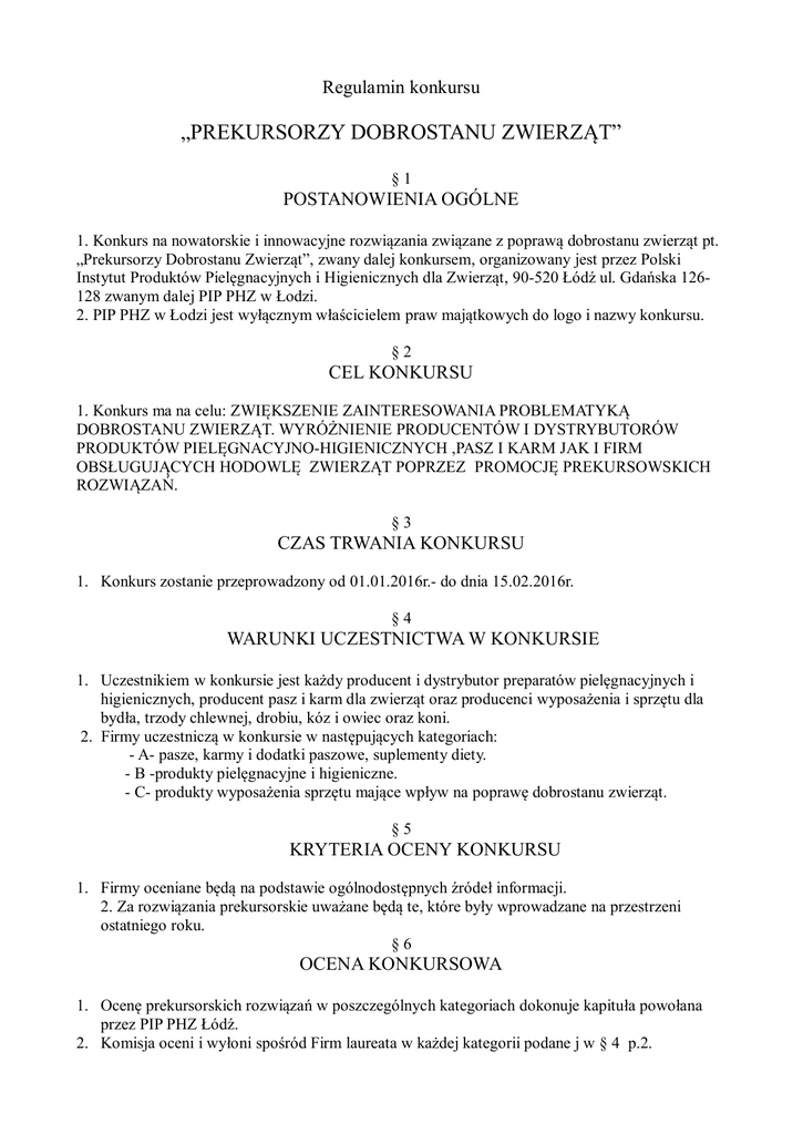 Regulamin konkursu „PREKURSORZY DOBROSTANU ZWIERZĄT” §1 POSTANOWIENIA OGÓLNE 1. Konkurs na nowatorskie i innowacyjne rozwiązania związane z poprawą dobrostanu zwierząt pt. „Prekursorzy Dobrostanu Zwierząt”, zwany dalej konkursem, organizowany jest przez Polski Instytut Produktów Pielęgnacyjnych i Higienicznych dla Zwierząt, 90-520 Łódź ul. Gdańska 126128 zwanym dalej PIP PHZ w Łodzi. 2. PIP PHZ w Łodzi jest wyłącznym właścicielem praw majątkowych do logo i nazwy konkursu. §2 CEL KONKURSU 1. Konkurs ma na celu: ZWIĘKSZENIE ZAINTERESOWANIA PROBLEMATYKĄ DOBROSTANU ZWIERZĄT. WYRÓŻNIENIE PRODUCENTÓW I DYSTRYBUTORÓW PRODUKTÓW PIELĘGNACYJNO-HIGIENICZNYCH ,PASZ I KARM JAK I FIRM OBSŁUGUJĄCYCH HODOWLĘ ZWIERZĄT POPRZEZ PROMOCJĘ PREKURSOWSKICH ROZWIĄZAŃ. §3 CZAS TRWANIA KONKURSU 1. Konkurs zostanie przeprowadzony od 01.01.2016r.- do dnia 15.02.2016r. §4 WARUNKI UCZESTNICTWA W KONKURSIE 1. Uczestnikiem w konkursie jest każdy producent i dystrybutor preparatów pielęgnacyjnych i higienicznych, producent pasz i karm dla zwierząt oraz producenci wyposażenia i sprzętu dla bydła, trzody chlewnej, drobiu, kóz i owiec oraz koni. 2. Firmy uczestniczą w konkursie w następujących kategoriach: - A- pasze, karmy i dodatki paszowe, suplementy diety. - B -produkty pielęgnacyjne i higieniczne. - C- produkty wyposażenia sprzętu mające wpływ na poprawę dobrostanu zwierząt. §5 KRYTERIA OCENY KONKURSU 1. Firmy oceniane będą na podstawie ogólnodostępnych źródeł informacji. 2. Za rozwiązania prekursorskie uważane będą te, które były wprowadzane na przestrzeni ostatniego roku. §6 OCENA KONKURSOWA 1. Ocenę prekursorskich rozwiązań w poszczególnych kategoriach dokonuje kapituła powołana przez PIP PHZ Łódź. 2. Komisja oceni i wyłoni spośród Firm laureata w każdej kategorii podane j w § 4 p.2. 3.Leaureaci konkursu zostaną nagrodzeni statuetkami: „SKRZYDŁA PREKURSORA DOBROSTANU ZWIERZĄT” 4. Statuetki „SKRZYDŁA PREKURSORA DOBROSTANU ZWIERZĄT” oraz DYPLOMY będą wręczone przedstawicielom Firm podczas Gali Finałowej na TARGACH FERMA 2016 5. Lista wyróżnionych firm będzie umieszczona na stronie internetowej PIP PHZ Łódź. §7 POSTANOWIENIA 1. Dane osobowe uczestników konkursu będą pobrane z ogólnodostępnych źródeł informacji o firmie. 2. Administratorem danych osobowych jest Organizator konkursu. 3. Dane uczestników konkursu będą przetwarzane zgodnie z ustawa o danych osobowych (Dz.U.z 1997r., nr 133 , poz. 883 ze zm.)