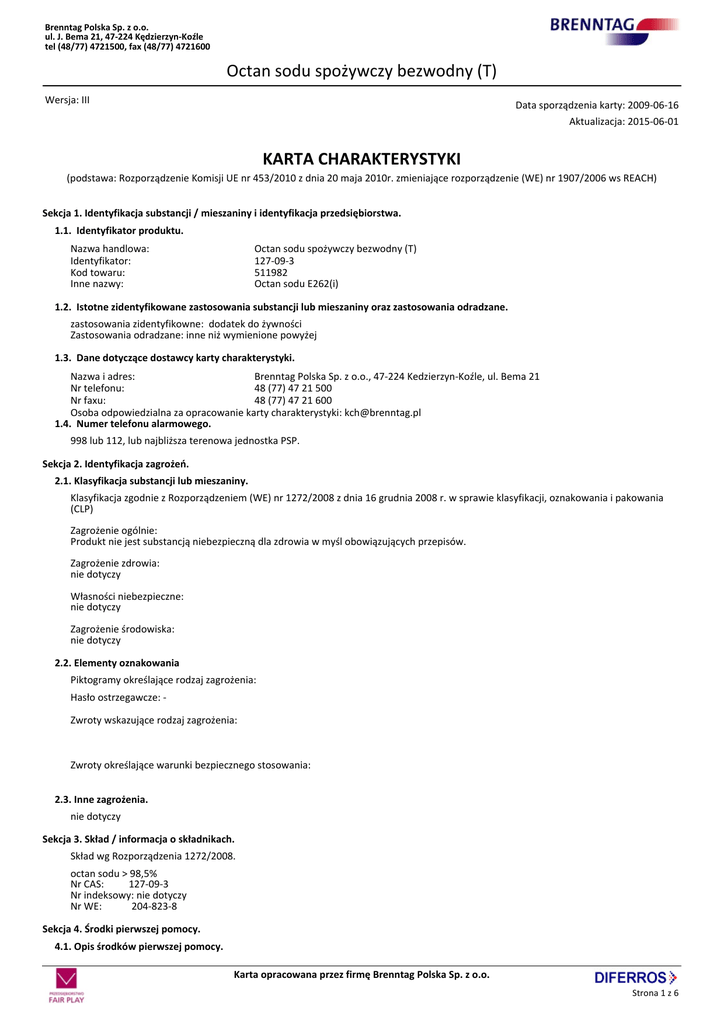 Brenntag Polska Sp. z o.o. ul. J. Bema 21, 47-224 Kędzierzyn-Koźle tel (48/77) 4721500, fax (48/77) 4721600 Octan sodu spożywczy bezwodny (T) Wersja: III Data sporządzenia karty: 2009-06-16 Aktualizacja: 2015-06-01 KARTA CHARAKTERYSTYKI (podstawa: Rozporządzenie Komisji UE nr 453/2010 z dnia 20 maja 2010r. zmieniające rozporządzenie (WE) nr 1907/2006 ws REACH) Sekcja 1. Identyfikacja substancji / mieszaniny i identyfikacja przedsiębiorstwa. 1.1. Identyfikator produktu. Nazwa handlowa: Identyfikator: Kod towaru: Inne nazwy: Octan sodu spożywczy bezwodny (T) 127-09-3 511982 Octan sodu E262(i) 1.2. Istotne zidentyfikowane zastosowania substancji lub mieszaniny oraz zastosowania odradzane. zastosowania zidentyfikowne: dodatek do żywności Zastosowania odradzane: inne niż wymienione powyżej 1.3. Dane dotyczące dostawcy karty charakterystyki. Nazwa i adres: Brenntag Polska Sp. z o.o., 47-224 Kedzierzyn-Koźle, ul. Bema 21 Nr telefonu: 48 (77) 47 21 500 Nr faxu: 48 (77) 47 21 600 Osoba odpowiedzialna za opracowanie karty charakterystyki: [email protected] 1.4. Numer telefonu alarmowego. 998 lub 112, lub najbliższa terenowa jednostka PSP. Sekcja 2. Identyfikacja zagrożeń. 2.1. Klasyfikacja substancji lub mieszaniny. Klasyfikacja zgodnie z Rozporządzeniem (WE) nr 1272/2008 z dnia 16 grudnia 2008 r. w sprawie klasyfikacji, oznakowania i pakowania (CLP) Zagrożenie ogólnie: Produkt nie jest substancją niebezpieczną dla zdrowia w myśl obowiązujących przepisów. Zagrożenie zdrowia: nie dotyczy Własności niebezpieczne: nie dotyczy Zagrożenie środowiska: nie dotyczy 2.2. Elementy oznakowania Piktogramy określające rodzaj zagrożenia: Hasło ostrzegawcze: Zwroty wskazujące rodzaj zagrożenia: Zwroty określające warunki bezpiecznego stosowania: 2.3. Inne zagrożenia. nie dotyczy Sekcja 3. Skład / informacja o składnikach. Skład wg Rozporządzenia 1272/2008. octan sodu > 98,5% Nr CAS: 127-09-3 Nr indeksowy: nie dotyczy Nr WE: 204-823-8 Sekcja 4. Środki pierwszej pomocy. 4.1. Opis środków pierwszej pomocy. Karta opracowana przez firmę Brenntag Polska Sp. z o.o. Strona 1 z 6 Brenntag Polska Sp. z o.o. ul. J. Bema 21, 47-224 Kędzierzyn-Koźle tel (48/77) 4721500, fax (48/77) 4721600 Octan sodu spożywczy bezwodny (T) Wdychanie: W razie narażenia na wdychanie zapewnić dostęp świeżego powietrza. W przypadku wystąpienia niepokjących objawów zapewnić pomoc lekarską. Kontakt ze skórą: W razie zanieczyszczenia skóry zmyć dużą ilością wody z mydłem. W przypadku wystąpienia niepokjących objawów zapewnić pomoc lekarską. Kontakt z oczami: W razie kontaktu z oczami płukać dużą ilośćią wody przy rozchylonych powiekach. W przypadku wystąpienia niepokjących objawów zasięgnąć porady lekarskiej. Spożycie: W razie spożycia podać dużą ilość wody do picia. W przypadku wystąpienia niepokjących objawów zapewnić pomoc lekarską. 4.2. Najważniejsze ostre i opóźnione objawy oraz skutki narażenia. Wdychsnie pyłów może powodować podrażnienie górnych dróg oddechowych. Pył może również powodować podrażnienie oczu, natomiast spożycie może powodować podrażnienie przewodu pokarmowego. Powtarzający się lub długotrwały kontakt ze skórą może powodować podrażnienia.. 4.3. Wskazania dotyczące wszelkiej natychmiastowej pomocy lekarskiej i szczególnego postępowania z poszkodowanym. Leczenie objawowe. Sekcja 5. Postępowanie w przypadku pożaru. 5.1. Środki gaśnicze. Pożary w obecności produktu gasić środkami odpowiednimi dla palących się materiałów. 5.2. Szczególne zagrożenia związane z substancją lub mieszaniną. Substancja niepalna. Pożar w otoczeniu może wyzwolić niebezpieczne pary . 5.3. Informacje dla straży pożarnej. Stosować niezależny aparat oddechowy oraz pełną odzież ochronną. Sekcja 6. Postępowanie w przypadku niezamierzonego uwolnienia do środowiska. 6.1. Indywidualne środki ostrożności, wyposażenie ochronne i procedury w sytuacjach awaryjnych. Unikać zanieczyszczenia skóry lub oczu i wdychania pyłu produktu. Do prac związanych z likwidacją skutków awarii skierować osoby przeszkolone i wyposażone w odpowiednie środki ochrony oczu, dróg oddechowych i skóry. 6.2. Środki ostrożności w zakresie ochrony środowiska. Nie dopuszczać do przedostawania się produktu do kanalizacji, wód powierzchniowych i wód gruntowych, zabezpieczyć studzienki ściekowe 6.3. Metody i materiały zapobiegające rozprzestrzenianiu się skażenia i służące do usuwania skażenia. Rozsypany produkt zebrać do ozankowanego pojemnika i przekazać do zniszczenia. 6.4. Odniesienia do innych sekcji. Usuwać zgodnie z zaleceniami przedstawionymi w sekcji 13 Sekcja 7. Postępowanie z substancjami i mieszaninami oraz ich magazynowanie. 7.1. Środki ostrożności dotyczące bezpiecznego postępowania. Unikać wzniecami pyłów produktu i jego wdychania. Zapewnić odpowiednią wentylację pomieszczeń. W miejscach, w których produkt jest stosowany zabrania się palenia tytoniu, spożywania posiłków i napojów. Unikać kontaktu ze skóą, oczami i ubraniem. 7.2. Warunki bezpiecznego magazynowania, łącznie z informacjami dotyczącymi wszelkich wzajemnych niezgodności. Przechowywać wyłącznie w oryginalnych, właściwie oznakowanych, szczelnie zamkniętych opakowaniach, w chłodnym, suchym i dobrze wentylowanym pomieszczeniu. Przechowyważ w temp <30°C. Chronić produkt przed wilgocią. Przechowywać z dala od źródeł zapłonu (nie palić). 7.3. Szczególne zastosowania końcowe. brak dostępnych danych Sekcja 8. Kontrola narażenia / środki ochrony indywidualnej. 8.1. Parametry dotyczące kontroli. Wartość DNEL dla pracowników w warunkach narażenia krótkotrwałego przez skórę (działanie ogólnoustrojowe): 72 mg/kg bw/dzień Wartość DNEL dla pracowników w warunkach narażenia krótkotrwałego przez drogi oddechowe (działanie ogólnoustrojowe): 6347,36 Karta opracowana przez firmę Br