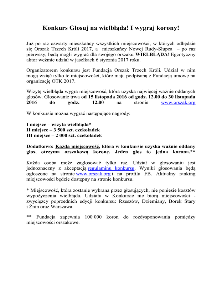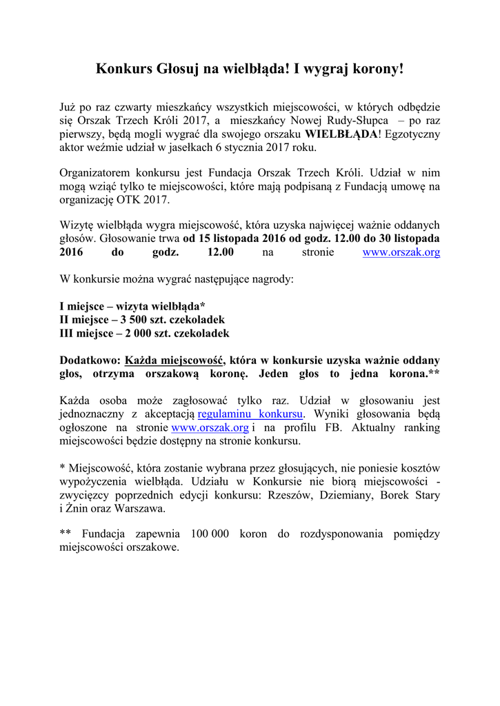 Konkurs Głosuj na wielbłąda! I wygraj korony! Już po raz czwarty mieszkańcy wszystkich miejscowości, w których odbędzie się Orszak Trzech Króli 2017, a mieszkańcy Nowej Rudy-Słupca – po raz pierwszy, będą mogli wygrać dla swojego orszaku WIELBŁĄDA! Egzotyczny aktor weźmie udział w jasełkach 6 stycznia 2017 roku. Organizatorem konkursu jest Fundacja Orszak Trzech Króli. Udział w nim mogą wziąć tylko te miejscowości, które mają podpisaną z Fundacją umowę na organizację OTK 2017. Wizytę wielbłąda wygra miejscowość, która uzyska najwięcej ważnie oddanych głosów. Głosowanie trwa od 15 listopada 2016 od godz. 12.00 do 30 listopada 2016 do godz. 12.00 na stronie www.orszak.org W konkursie można wygrać następujące nagrody: I miejsce – wizyta wielbłąda* II miejsce – 3 500 szt. czekoladek III miejsce – 2 000 szt. czekoladek Dodatkowo: Każda miejscowość, która w konkursie uzyska ważnie oddany głos, otrzyma orszakową koronę. Jeden głos to jedna korona.** Każda osoba może zagłosować tylko raz. Udział w głosowaniu jest jednoznaczny z akceptacją regulaminu konkursu. Wyniki głosowania będą ogłoszone na stronie www.orszak.org i na profilu FB. Aktualny ranking miejscowości będzie dostępny na stronie konkursu. * Miejscowość, która zostanie wybrana przez głosujących, nie poniesie kosztów wypożyczenia wielbłąda. Udziału w Konkursie nie biorą miejscowości zwycięzcy poprzednich edycji konkursu: Rzeszów, Dziemiany, Borek Stary i Żnin oraz Warszawa. ** Fundacja zapewnia 100 000 koron do rozdysponowania pomiędzy miejscowości orszakowe.