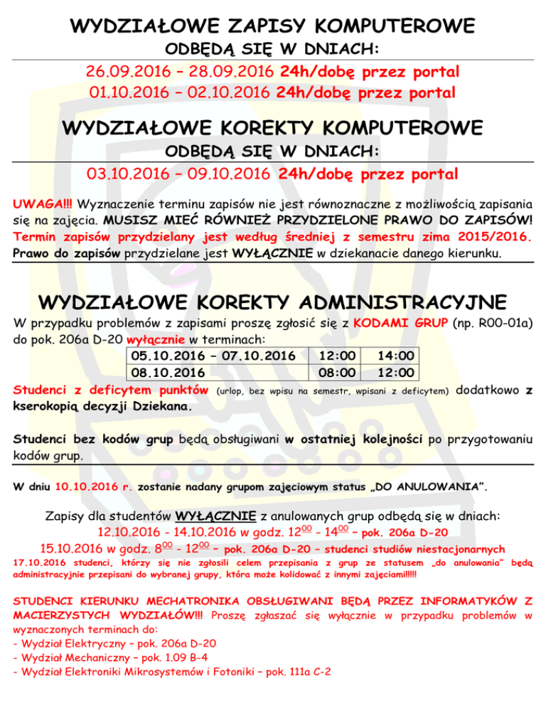 WYDZIAŁOWE ZAPISY KOMPUTEROWE ODBĘDĄ SIĘ W DNIACH: 26.09.2016 – 28.09.2016 24h/dobę przez portal 01.10.2016 – 02.10.2016 24h/dobę przez portal WYDZIAŁOWE KOREKTY KOMPUTEROWE ODBĘDĄ SIĘ W DNIACH: 03.10.2016 – 09.10.2016 24h/dobę przez portal UWAGA!!! Wyznaczenie terminu zapisów nie jest równoznaczne z możliwością zapisania się na zajęcia. MUSISZ MIEĆ RÓWNIEŻ PRZYDZIELONE PRAWO DO ZAPISÓW! Termin zapisów przydzielany jest według średniej z semestru zima 2015/2016. Prawo do zapisów przydzielane jest WYŁĄCZNIE w dziekanacie danego kierunku. WYDZIAŁOWE KOREKTY ADMINISTRACYJNE W przypadku problemów z zapisami proszę zgłosić się z KODAMI GRUP (np. R00-01a) do pok. 206a D-20 wyłącznie w terminach: 05.10.2016 – 07.10.2016 12:00 14:00 08.10.2016 08:00 12:00 Studenci z deficytem punktów (urlop, bez wpisu na semestr, wpisani z deficytem) dodatkowo z kserokopią decyzji Dziekana. Studenci bez kodów grup będą obsługiwani w ostatniej kolejności po przygotowaniu kodów grup. W dniu 10.10.2016 r. zostanie nadany grupom zajęciowym status „DO ANULOWANIA”. Zapisy dla studentów WYŁĄCZNIE z anulowanych grup odbędą się w dniach: 12.10.2016 - 14.10.2016 w godz. 1200 - 1400 – pok. 206a D-20 15.10.2016 w godz. 800 - 1200 – pok. 206a D-20 – studenci studiów niestacjonarnych 17.10.2016 studenci, którzy się nie zgłosili celem przepisania z grup ze statusem „do anulowania” będą administracyjnie przepisani do wybranej grupy, która może kolidować z innymi zajęciami!!!!! STUDENCI KIERUNKU MECHATRONIKA OBSŁUGIWANI BĘDĄ PRZEZ INFORMATYKÓW Z MACIERZYSTYCH WYDZIAŁÓW!!! Proszę zgłaszać się wyłącznie w przypadku problemów w wyznaczonych terminach do: - Wydział Elektryczny – pok. 206a D-20 - Wydział Mechaniczny – pok. 1.09 B-4 - Wydział Elektroniki Mikrosystemów i Fotoniki – pok. 111a C-2