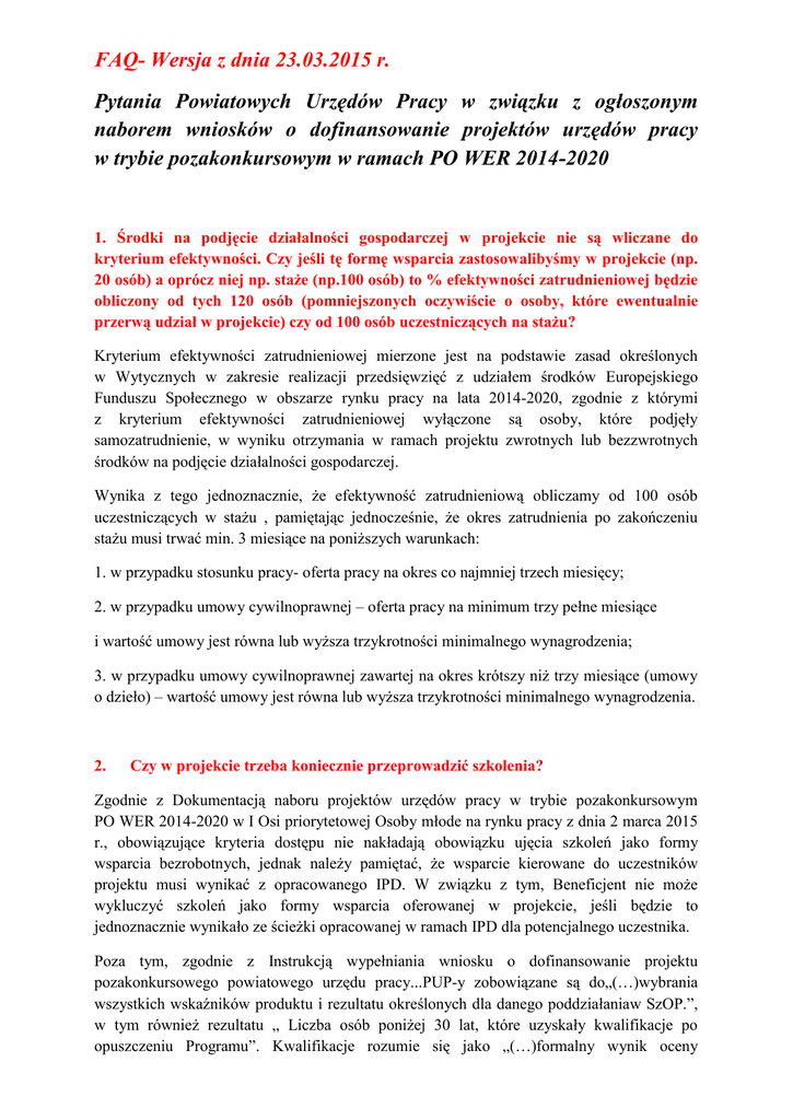 FAQ- Wersja z dnia 23.03.2015 r. Pytania Powiatowych Urzędów Pracy w związku z ogłoszonym naborem wniosków o dofinansowanie projektów urzędów pracy w trybie pozakonkursowym w ramach PO WER 2014-2020 1. Środki na podjęcie działalności gospodarczej w projekcie nie są wliczane do kryterium efektywności. Czy jeśli tę formę wsparcia zastosowalibyśmy w projekcie (np. 20 osób) a oprócz niej np. staże (np.100 osób) to % efektywności zatrudnieniowej będzie obliczony od tych 120 osób (pomniejszonych oczywiście o osoby, które ewentualnie przerwą udział w projekcie) czy od 100 osób uczestniczących na stażu? Kryterium efektywności zatrudnieniowej mierzone jest na podstawie zasad określonych w Wytycznych w zakresie realizacji przedsięwzięć z udziałem środków Europejskiego Funduszu Społecznego w obszarze rynku pracy na lata 2014-2020, zgodnie z którymi z kryterium efektywności zatrudnieniowej wyłączone są osoby, które podjęły samozatrudnienie, w wyniku otrzymania w ramach projektu zwrotnych lub bezzwrotnych środków na podjęcie działalności gospodarczej. Wynika z tego jednoznacznie, że efektywność zatrudnieniową obliczamy od 100 osób uczestniczących w stażu , pamiętając jednocześnie, że okres zatrudnienia po zakończeniu stażu musi trwać min. 3 miesiące na poniższych warunkach: 1. w przypadku stosunku pracy- oferta pracy na okres co najmniej trzech miesięcy; 2. w przypadku umowy cywilnoprawnej – oferta pracy na minimum trzy pełne miesiące i wartość umowy jest równa lub wyższa trzykrotności minimalnego wynagrodzenia; 3. w przypadku umowy cywilnoprawnej zawartej na okres krótszy niż trzy miesiące (umowy o dzieło) – wartość umowy jest równa lub wyższa trzykrotności minimalnego wynagrodzenia. 2. Czy w projekcie trzeba koniecznie przeprowadzić szkolenia? Zgodnie z Dokumentacją naboru projektów urzędów pracy w trybie pozakonkursowym PO WER 2014-2020 w I Osi priorytetowej Osoby młode na rynku pracy z dnia 2 marca 2015 r., obowiązujące kryteria dostępu nie nakładają obowiązku ujęcia szkoleń jako formy wsparcia bezrobotnych, jednak należy pamiętać, że wsparcie kierowane do uczestników projektu musi wynikać z opracowanego IPD. W związku z tym, Beneficjent nie może wykluczyć szkoleń jako formy wsparcia oferowanej w projekcie, jeśli będzie to jednoznacznie wynikało ze ścieżki opracowanej w ramach IPD dla potencjalnego uczestnika. Poza tym, zgodnie z Instrukcją wypełniania wniosku o dofinansowanie projektu pozakonkursowego powiatowego urzędu pracy...PUP-y zobowiązane są do„(…)wybrania wszystkich wskaźników produktu i rezultatu określonych dla danego poddziałaniaw SzOP.”, w tym również rezultatu „ Liczba osób poniżej 30 lat, które uzyskały kwalifikacje po opuszczeniu Programu”. Kwalifikacje rozumie się jako „(…)formalny wynik oceny i walidacji, który uzyskuje się w sytuacji, kiedy właściwy organ uznaje, że dana osoba osiągnęła efekty uczenia się spełniające określone standardy”. W związku z tym istnieje obligo do ujęcia szkoleń w projekcie. WUP w tym roku nie narzuca udziału procentowego osób objętych tą formą wsparcia, co nie znaczy, że w kolejnych latach nie będzie to praktykowane. 3. Czy umowa o dofinansowanie projektu będzie podpisana na rok 2015 czy od razu na cały okres realizacji projektu? Zgodnie z dokumentacją naboru projektów urzędów pracy w trybie pozakonkursowym PO WER 2014-2020 projekt realizowany jest od 1 stycznia 2015 r. – 31 grudnia 2015 r. W związku z powyższym umowa podpisywana jest na okres realizacji projektu w danym roku tj. od 1 stycznia 2015r. do 31 grudnia 2015r. 4. W projekcie można zatrudnić w ramach kosztów pośrednich (do 3% kosztów bezpośrednich projektu) osobę do zarządzania projektem. Czy ta osoba będzie mogła kontynuować zatrudnienie w kolejnych latach realizacji projektu? W trakcie konsultacji- Zapytanie w tej sprawie zostało skierowane do MIiR w dniu 18.03.2015 r., po uzyskaniu odpowiedzi interpretacja zostanie przesłana do PUP. 5. Czy aby wypłacić wynagrodzenie z kosztów pośrednich (3%) to można tego dokonać tylko wtedy, gdy zostały poniesione w danym miesiącu, wydatki z kosztów bezpośrednich. Czy wydatki w ramach kosztów pośrednich można ponosić tylko do 3% wydatków w danym miesiącu? W przypadku projektów pozakonkursowych PUP, koszty pośrednie to koszty administracyjne związane z zarządzaniem projektem, o których mowa w art. 9 ust. 2 d ustawy o promocji zatrudnienia (…).Wnioskodawca nie ma możliwości wykazania żadnej z kategorii kosztów pośrednich ujętych w ww. art. ustawy o promocji zatrudnienia (…) w kosztach bezpośrednich projektu. W tej części wnioskodawca wpisuje w polu % kosztów pośrednich w ramach projektu, jaki planuje przeznaczyć na zarządzanie/obsługę projektu; przy czym zgodnie z art. 9 ust. 2d ustawy o promocji zatrudnienia (…) koszty te nie mogą stanowić więcej niż 3% kwoty przyznanej ze środków Funduszu Pracy będących w dyspozycji samorządu województwa na realizację projektu. System sam wylicza na podstawie określonej wartości procentowej, wartość w złotych w ramach projektu jaka będzie przeznaczana na koszty pośrednie. W związku z tym, iż Beneficjent konstruuje założenia budżetowe na cały rok realizacji projektu, koszty pośrednie wyliczane są w skali całego roku. Beneficjent sam decyduje, jak będzie wydatkował w danym miesiącu koszty pośrednie, niezależnie od wydatków poniesionych w danym miesiącu z kosztów bezpośrednich. Suma poniesionych kosztów pośrednich w skali całego roku, musi być tożsama z wartością kosztów pośrednich wskazanych we wniosku o dofinansowanie projektu. 6. Czy osoby o niskich kwalifikacjach to osoby z wykształceniem średnim i niższym czy niższym niż średnie? Osoby o niskich kwalifikacjach – osoby posiadające wykształcenie na poziomie do ISCED 3 (Międzynarodo