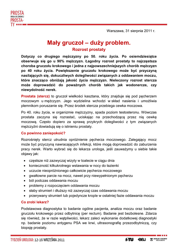 Warszawa, 31 sierpnia 2011 r. Mały gruczoł – duży problem. Rozrost prostaty Dotyczy co drugiego mężczyzny po 50. roku życia. Po osiemdziesiątce obserwuje się go u 90% mężczyzn. Łagodny rozrost prostaty to najczęstsza choroba gruczołu krokowego i jedna z najpowszechniejszych chorób mężczyzn po 40 roku życia. Powiększenie gruczołu krokowego może być przyczyną nasilających się, dokuczliwych dolegliwości związanych z oddawaniem moczu, które znacząco obniżają jakość życia mężczyzn. Nieleczony rozrost stercza może doprowadzić do poważnych chorób takich jak wodonercze, czy niewydolność nerek. Prostata (stercz) to gruczoł wielkości kasztana, który znajduje się pod pęcherzem moczowym u mężczyzn. Jego wydzielina wchodzi w skład nasienia i umożliwia plemnikom poruszanie się. Przez środek stercza przebiega cewka moczowa. Po 40. roku życia, w organizmie mężczyzny, spada poziom testosteronu. Wówczas prostata zaczyna się rozrastać, uciskając na przechodzącą przez nią cewkę moczową. Często dopiero za sprawą przykrych dolegliwości z tym związanych mężczyźni dowiadują się o istnieniu prostaty. Co powinno zaniepokoić? Rozrośnięty stercz utrudnia opróżnienie pęcherza moczowego. Zalegający mocz może być przyczyną nawracających infekcji, które mogą doprowadzić do zaburzenia pracy nerek. Warto wybrać się do lekarza urologa, jeśli zauważymy u siebie takie objawy jak: częstsze niż zazwyczaj wizyty w toalecie w ciągu dnia konieczność kilkukrotnego wstawania w nocy do łazienki uczucie nieopróżnionego całkowicie pęcherza moczowego gwałtowne parcie na mocz, nawet przy niewypełnionym pęcherzu ból podczas oddawania moczu problemy z rozpoczęciem oddawania moczu słaby strumień i dłuższy niż zazwyczaj czas oddawania moczu przerywany strumień lub pojedyncze krople w ostatniej fazie oddawania moczu Co zrobi lekarz? Podstawowa diagnostyka to badanie ogólne pacjenta, analiza moczu oraz badanie gruczołu krokowego przez odbytnicę (per rectum). Badanie jest bezbolesne. Zdarza się również, że w razie wątpliwości, lekarz zaleci wykonanie dodatkowej diagnostyki np. badanie poziomu antygenu PSA we krwi, ultrasonografię przezodbytniczą, czy biopsję prostaty. Jak się leczyć? Wybór leczenia należy do lekarza urologa. Dobiera on odpowiednie preparaty w zależności od stopnia zaawansowania choroby, wieku i ogólnego stanu zdrowia pacjenta. We wczesnych stadiach choroby najczęściej stosuje się preparaty pochodzenia roślinnego, np. zawierające wyciąg z owocu boczni piłkowanej (Sabalis serrulatae). Nie wywołują one skutków ubocznych, są dobrze tolerowane i nie wpływają negatywnie na libido. Działają przeciwzapalnie i przeciwobrzękowo, a co najważniejsze, hamują przykre objawy rozrostu prostaty. W późniejszych stadiach rozrostu stercza stosowane są leki wyłącznie na receptę, które blokują enzymy odpowiedzialne za rozrost stercza lub tzw. receptory alfa (znajdujące się w pęcherzu moczowym i sterczu). W najbardziej zaawansowanym stadium choroby, albo kiedy rozrost został zbyt późno zdiagnozowany, powiększoną część prostaty usuwa się chirurgicznie. Dlaczego warto pójść do lekarza? Powiększenie prostaty i wynikające z tego dolegliwości często mają niekorzystny wpływ na różne sfery życia mężczyzn, w tym na życie zawodowe i osobiste. W większości przypadków nieprzyjemne objawy rozrostu prostaty skutecznie hamuje leczenie farmakologiczne. Im szybciej problem zostanie właściwie zdiagnozowany i podjęta zostanie odpowiednia terapia, tym większe szanse, że prostata na wiele lat przestanie dawać o sobie znać. Dlatego warto zawczasu zadbać o właściwą kondycję prostaty i zaprzyjaźnić się z lekarzem urologiem, wykonując regularnie badania stercza. Więcej informacji udzielają: Elżbieta Brzozowska, tel. 668 447 131, [email protected] Marta Winiarska, Tel. 607 404 160, [email protected] Anna Pająk, tel. 667 404 101, [email protected]