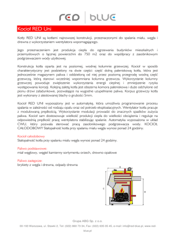Kocioł RED Uni Kotły RED UNI są kotłami najnowszej konstrukcji, przeznaczonymi do spalania miału, węgla i drewna z wykorzystaniem wentylatora wspomagającego. Jego przeznaczeniem jest produkcja ciepła do ogrzewania budynków mieszkalnych i przemysłowych o łącznej powierzchni do 750 m2 oraz do współpracy z zasobnikowym podgrzewaczem wody użytkowej. Konstrukcja kotła oparta jest na poziomej, wodnej kolumnie grzewczej. Kocioł w sposób charakterystyczny jest podzielony na dwie części: część dolną paleniskową kotła, która jest jednocześnie magazynem paliwa i oddzieloną od niej przez poziomą przegrodę wodną część grzewczą, którą stanowi wcześniej wspomniana kolumna grzewcza. Wykorzystanie kolumny grzewczej powoduje zwiększenie wykorzystania energii cieplnej i zmniejszenie ryzyka występowania korozji. Kolejną zaletą kotła jest obszerna komora paleniskowa i duże odchylone od pionu drzwi załadunkowe, pozwalające na wygodne uzupełnianie paliwa. Korpus grzewczy kotła jest wykonany z atestowanej blachy o grubości 5mm. Kocioł RED UNI wyposażony jest w automatykę, która umożliwia programowanie procesu spalania w zależności od rodzaju opału oraz od potrzeb eksploatacyjnych. Wentylator kotła pracuje z modulowaną prędkością. Wykorzystanie modulacji prowadzi do znacznych spadków zużycia paliwa. Kocioł sam dostosowuje wielkość produkcji ciepła do wielkości obciążenia i reguluje na odpowiednią prędkość pracę wentylatora stabilizując spalanie. Automatyka wyposażona w układ CWU, który pozwala sterować pracą zasobnikowego podgrzewacza wody. KOCIOŁ CAŁODOBOWY Stałopalność kotła przy spalaniu miału węgla wynosi ponad 24 godziny. Kocioł całodobowy Stałopalność kotła przy spalaniu miału węgla wynosi ponad 24 godziny. Paliwo podstawowe: miał węglowy, węgiel kamienny sortymentu orzech, drewno opałowe Paliwo zastępcze: brykiety z węgla i drewna, odpady drewna Grupa ABG Sp. z o.o. 00-193 Warszawa, ul. Stawki 2, Tel: (022) 860 73 34, Fax: (022) 635 05 45, e-mail: [email protected], www.redblue.pl Kocioł RED Uni Uni – dane techniczne Dane techniczne Typ 15 25 35 45 55 65 75 Moc znamionowa kW 15 25 35 45 55 65 75 8-15 10-25 15-35 20-45 25-55 30-65 35-75 Zakres mocy Pow. ogrzewana Max. temp. pracy kw m 50-150 10-250 200-350 300-450 400-550 500-650 550-750 2 C 85 85 85 85 85 85 85 L 60 70 80 90 100 110 110 Minim. ciąg komin. Pa 18 18 20 20 22 22 22 Przyłącze instalacji 1,5" 1,5" 1,5" 1,5" 2" 2" 2" Przyłącze komina mm 159 159 159 159 200 200 200 260 300 350 370 460 480 500 Objętość paleniska dm 70 85 100 120 140 160 180 A - szerokość korp. cm 53 53 68 68 68 68 68 B- głebokość korp. cm 67 72 76 81 90 95 100 C- wysokość korp. cm 127 127 127 130 160 160 160 D- wys. do śr. kom. cm 102 102 102 103 125 125 125 Pojemność wodna Masa kotła o kg 3 Grupa ABG Sp. z o.o. 00-193 Warszawa, ul. Stawki 2, Tel: (022) 860 73 34, Fax: (022) 635 05 45, e-mail: [email protected], www.redblue.pl